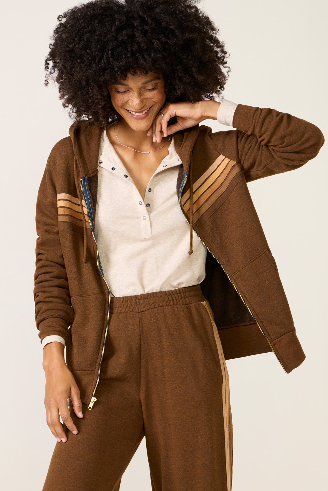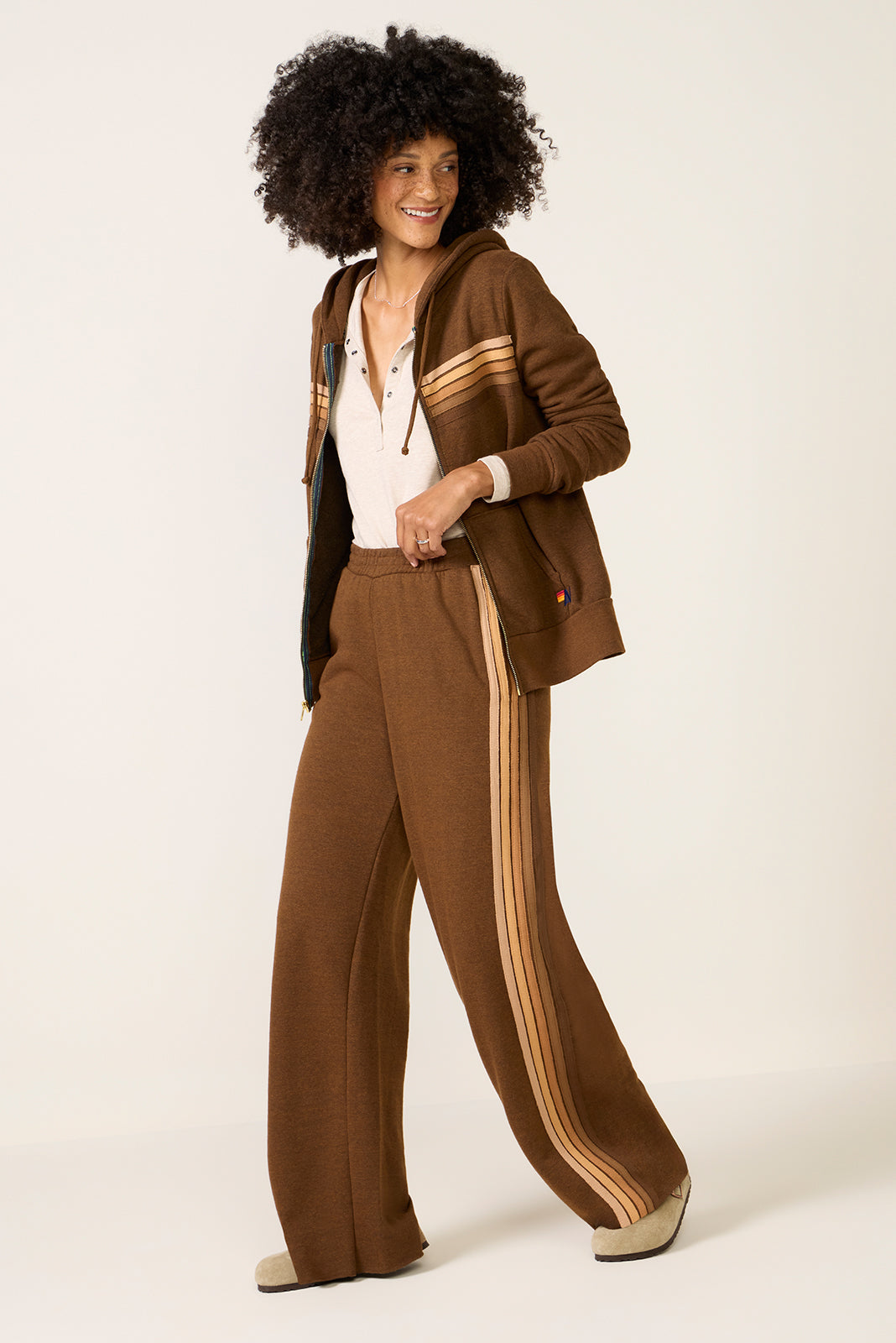 Sure to become part of your weekend rotation. the 5 Stripe Zip Hoodie by Aviator Nation is crafted from a soft. broken-in triblend fabric and features a hoodie with adjustable drawstrings and a relaxed silhouette. Make it a matching set with the 5 Stripe Wide Leg Sweatpant.