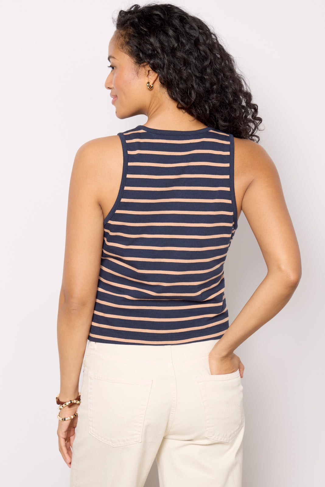 Gold buttons add an elegant touch to the Abbie Tank by Nation LTD. featuring a soft cotton fabric. crew neckline. cropped fit. and flattering contrasting stripes.