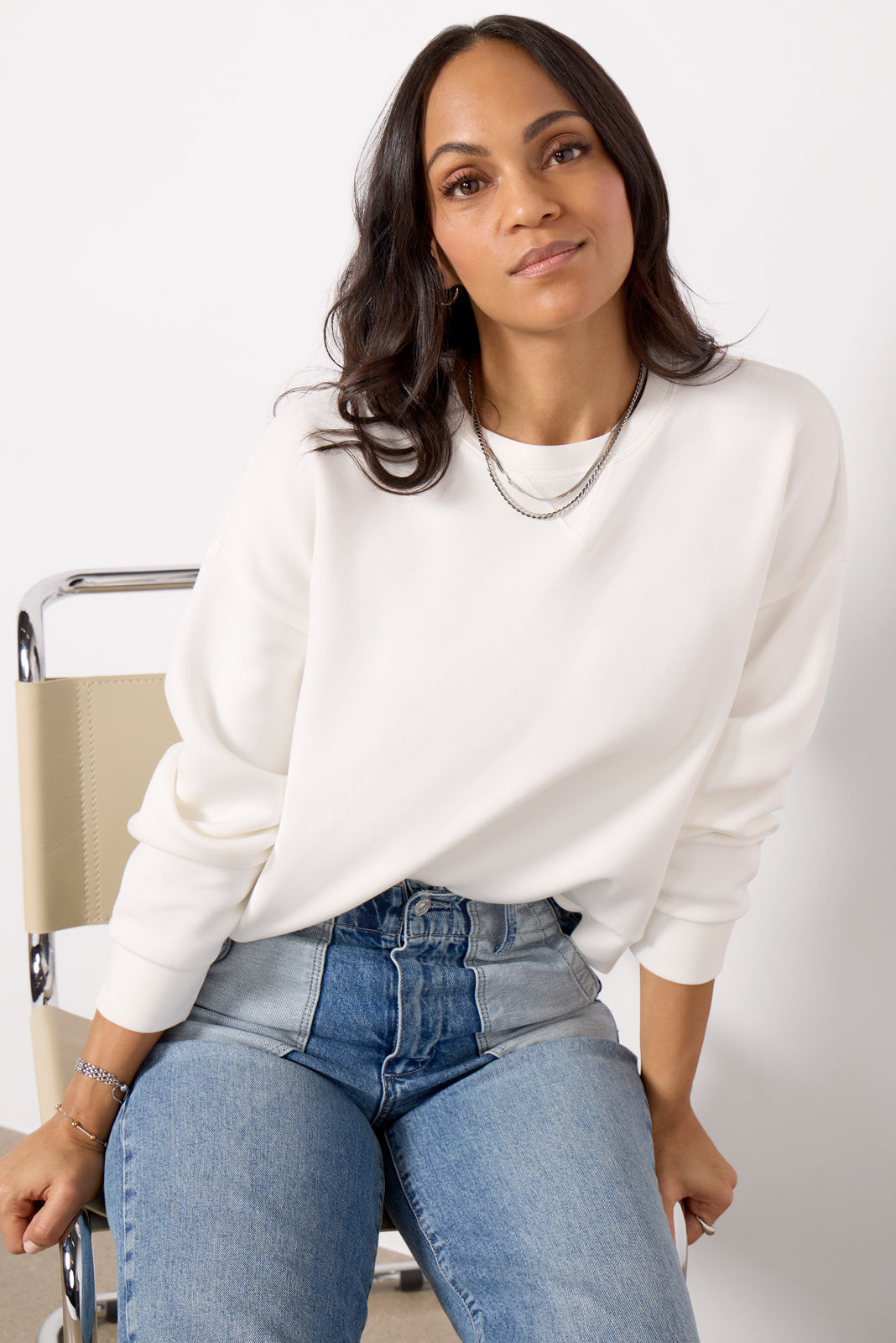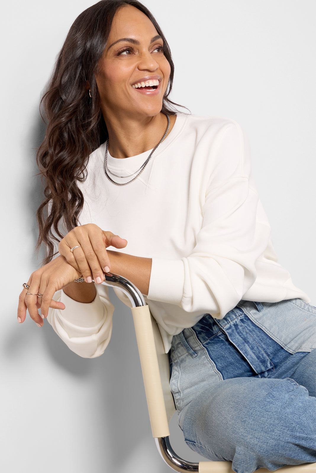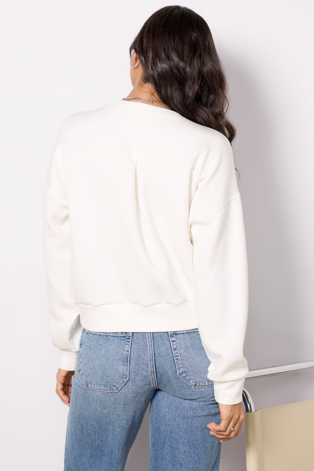 Laidback and luxe. the AirEssentials Crew sweatshirt by Spanx will be your favorite everyday staple. Finished with a pleated back detail and banding at the hem and cuffs. this relaxed pullover is crafted in airy. ultra-soft fabric for throw-on-and-go comfort.