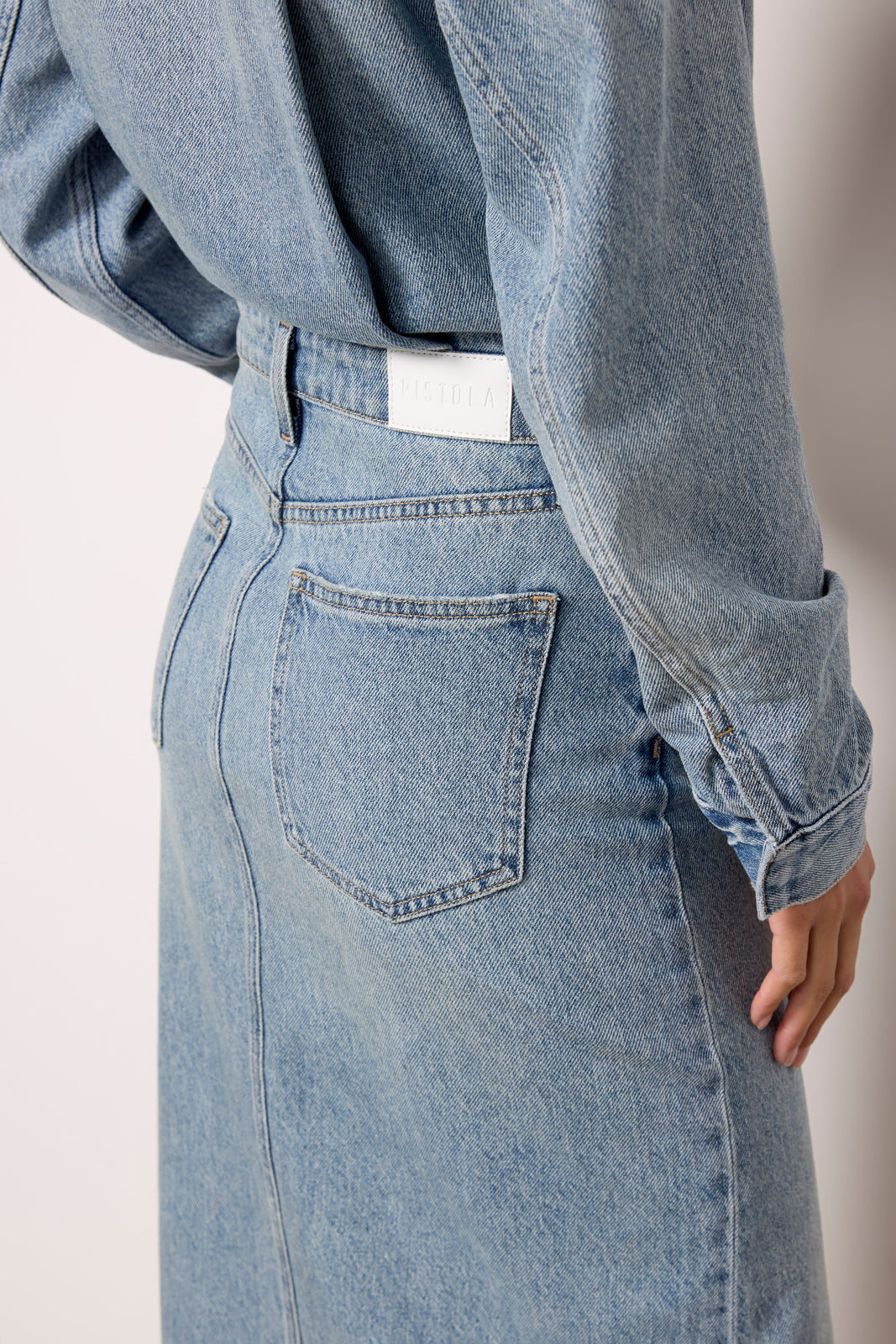 Keep it cool and effortless with the Amira Midi Dress from Pistola. Designed to flatter. this dress is crafted in cotton denim and features a spread collar. a front slit. long sleeves with one button cuffs. and a defined waistline.