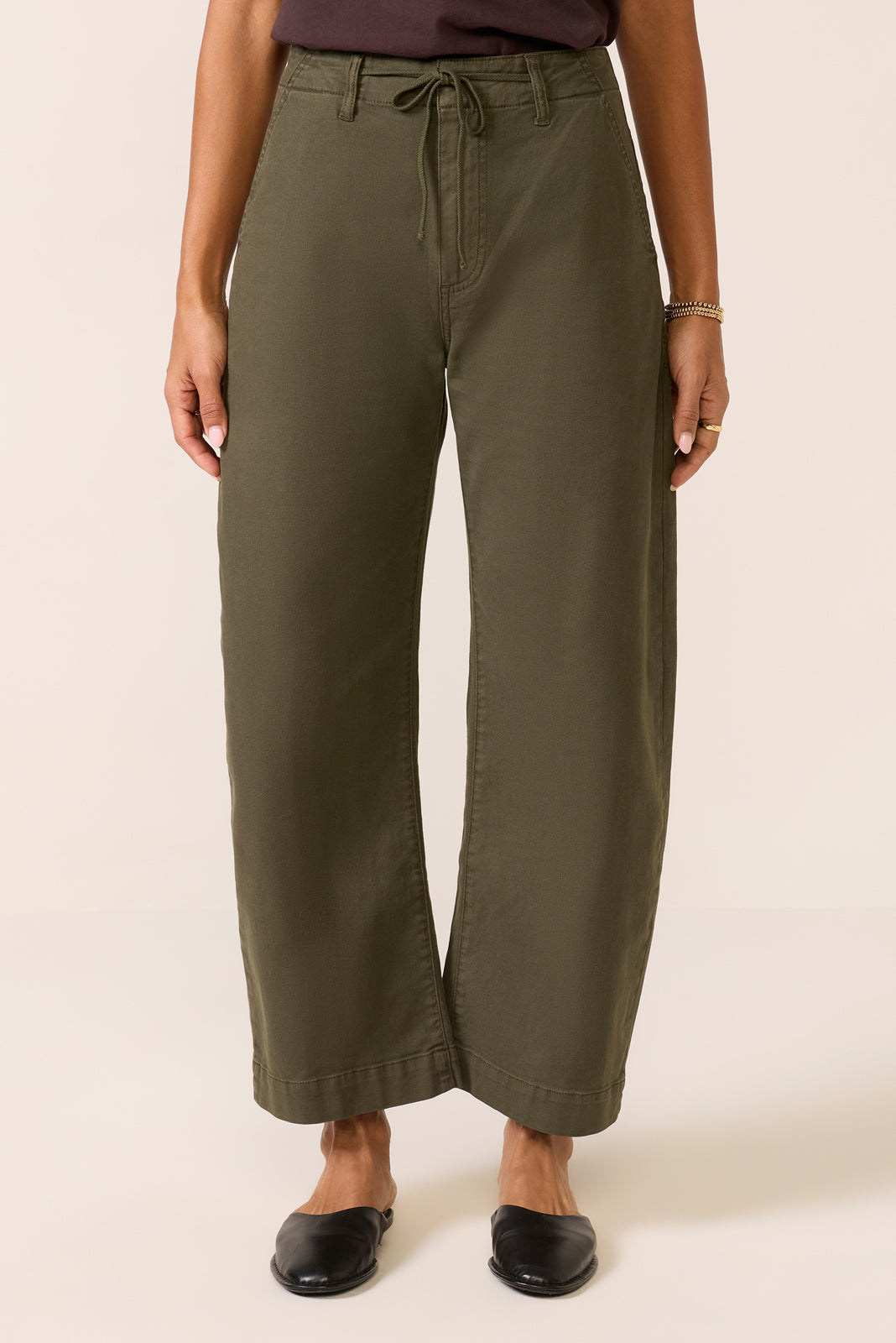 Crafted from soft stretch cotton. the Areillia Ankle Pant by Paige features a high-rise waist. barrel leg silhouette. ankle-length hems. and a tie-waist detail.