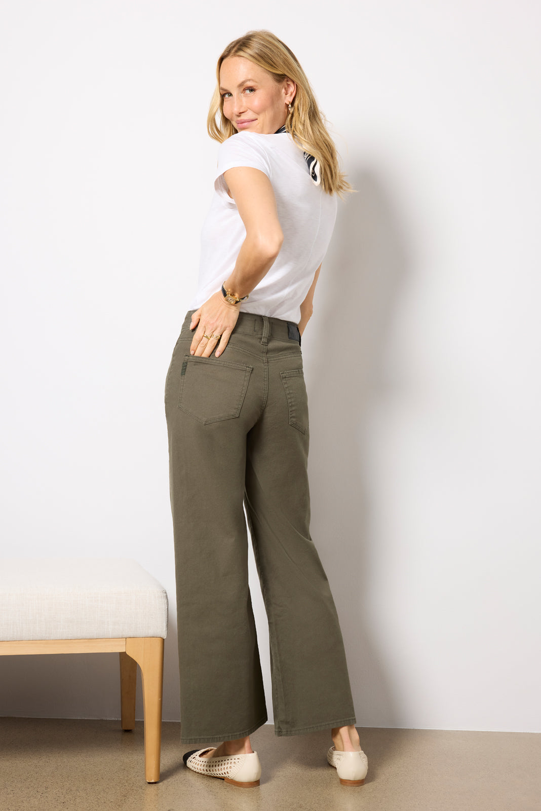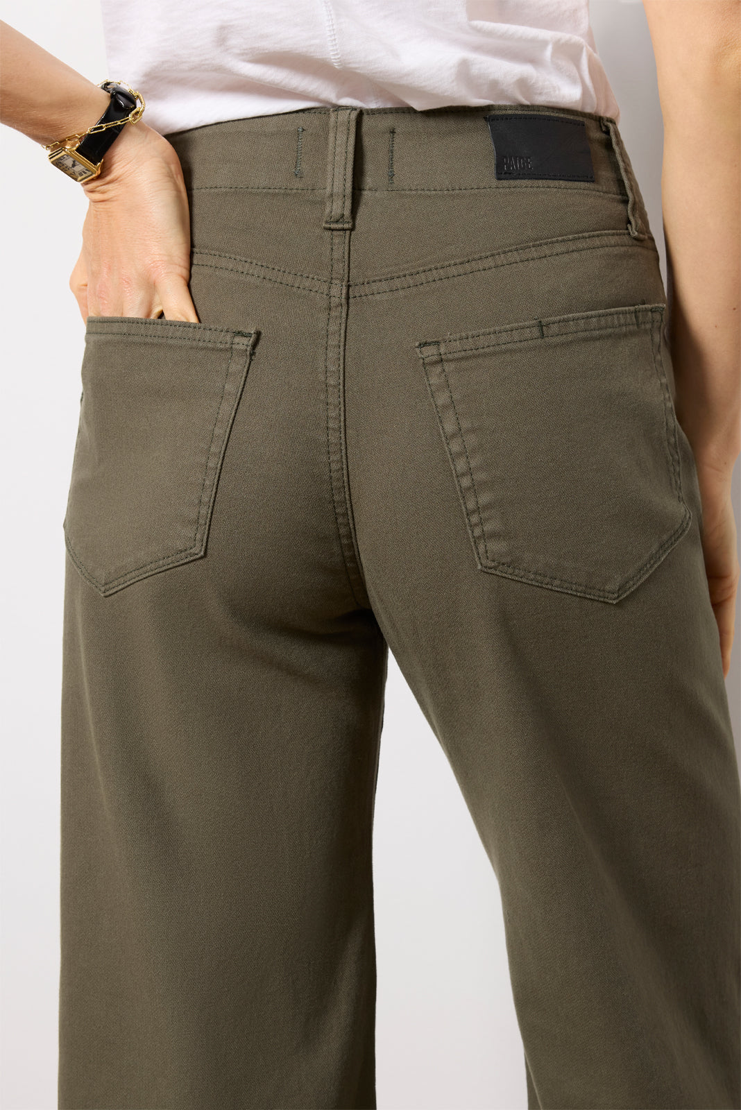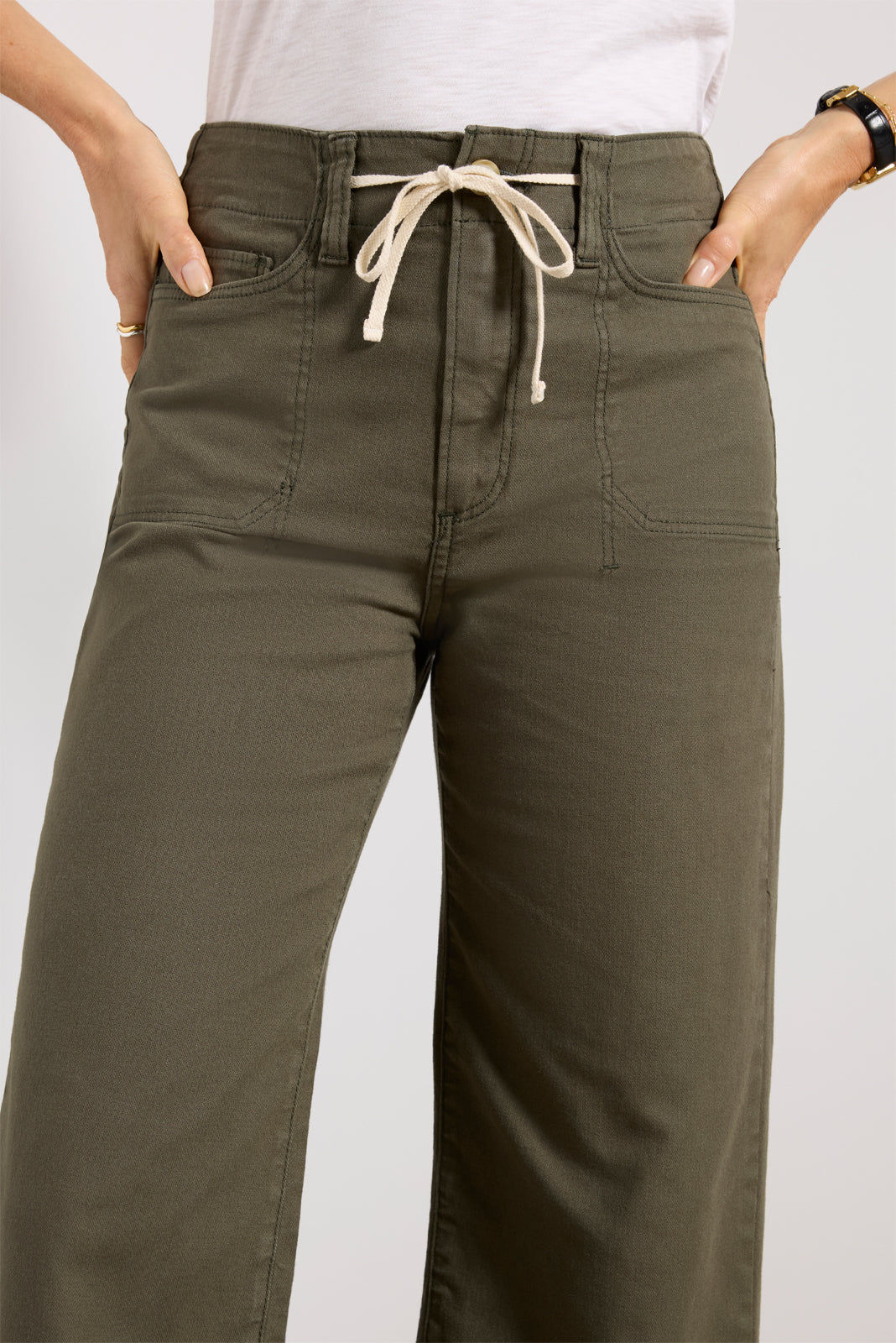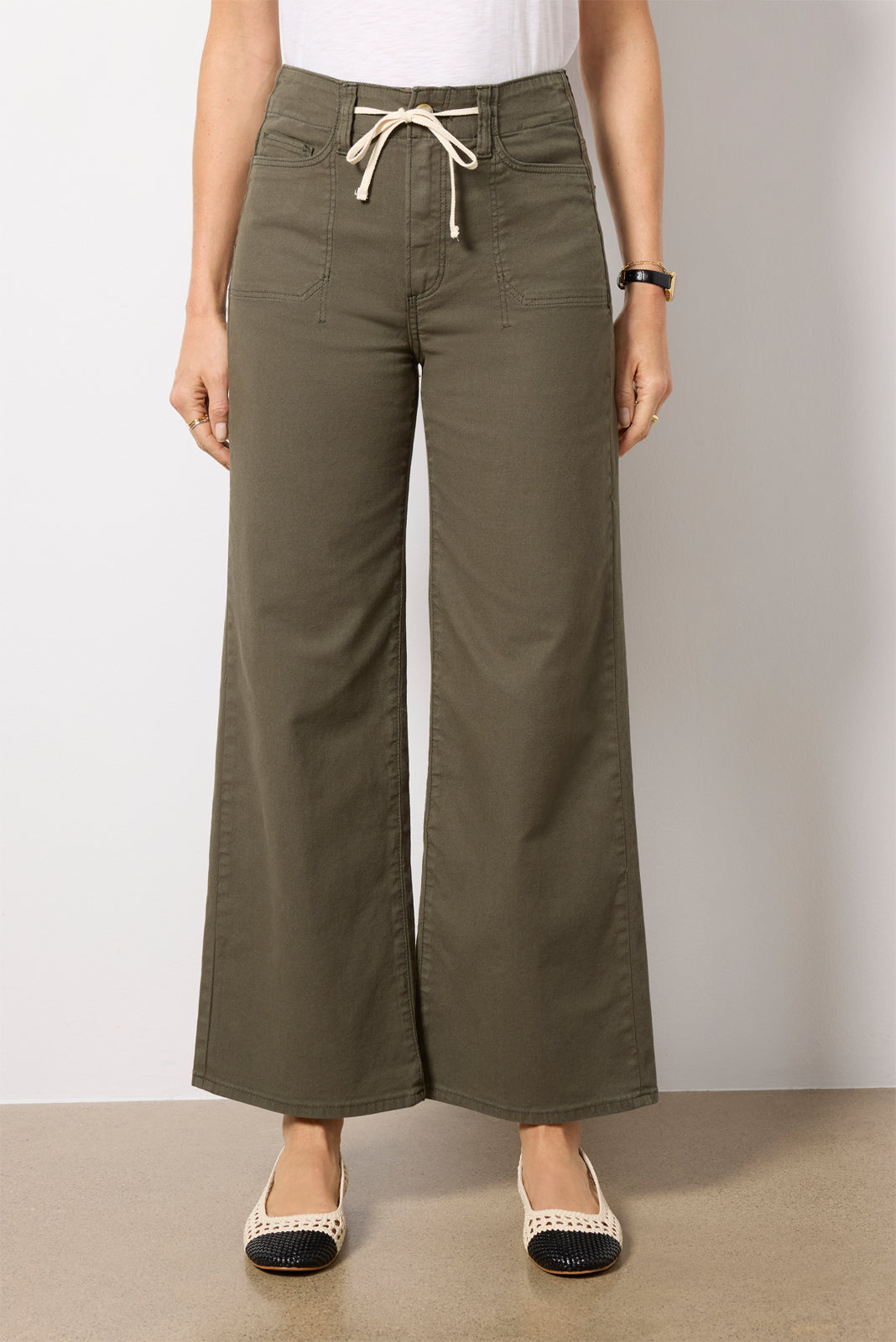 Crafted in soft twill fabric. these stylish wide leg pants by Paige will instantly elevate your wardrobe. featuring a full-length inseam. patch pockets. and a high-rise waist with an adjustable tie.