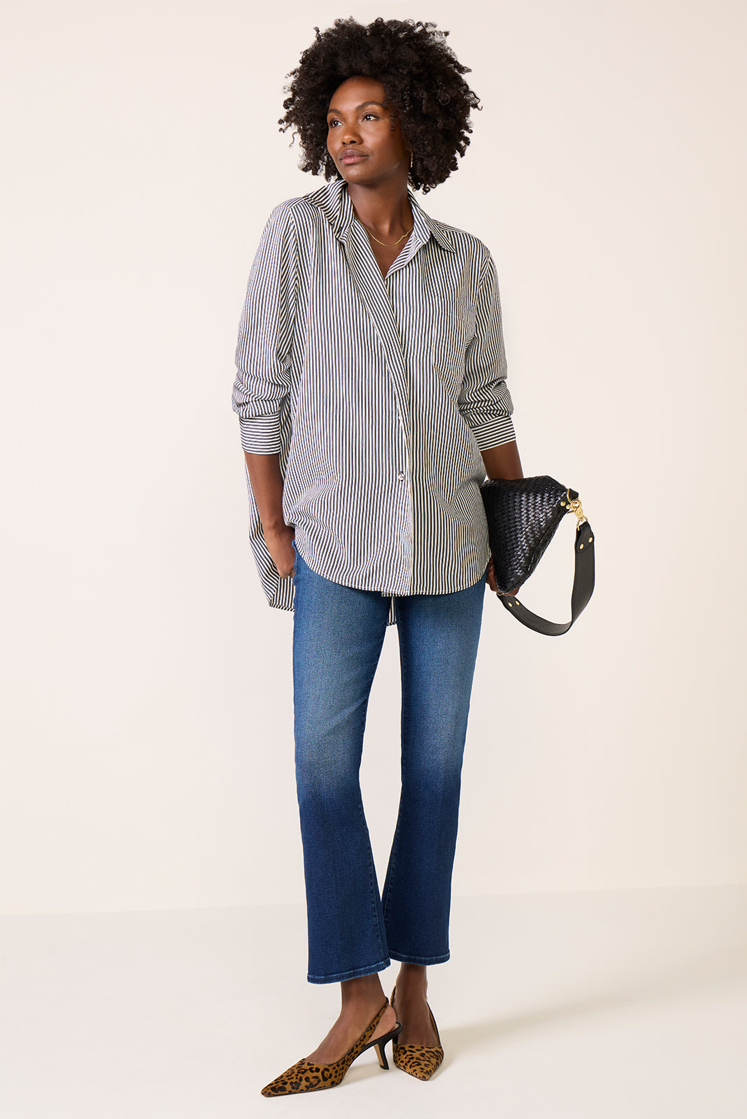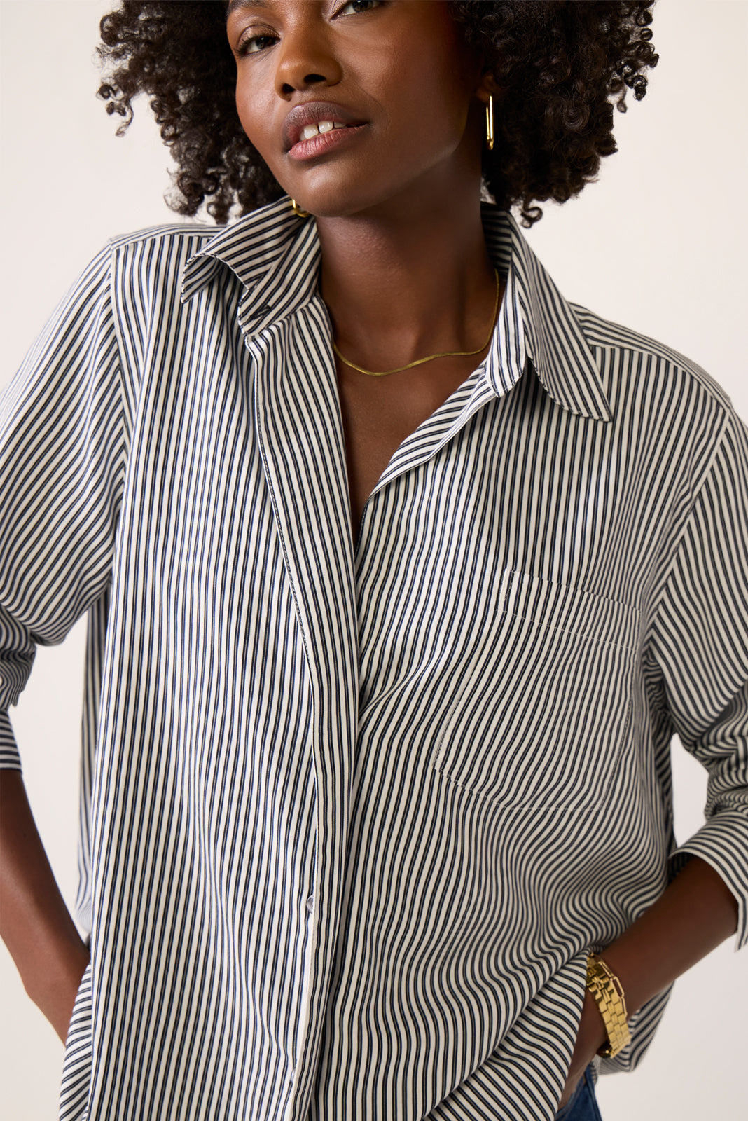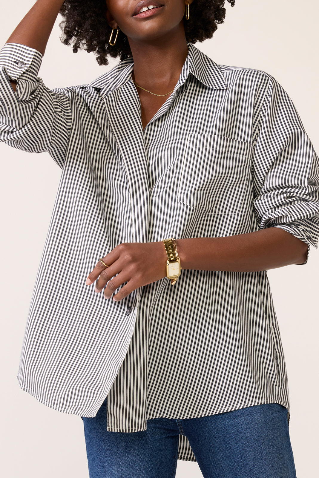 The Aris Shirt by Agolde is cut in a relaxed silhouette with a classic collar and left chest slip pocket. Crafted with a midweight poplin fabric. it drapes effortlessly with a refined. menswear-inspired stripe.