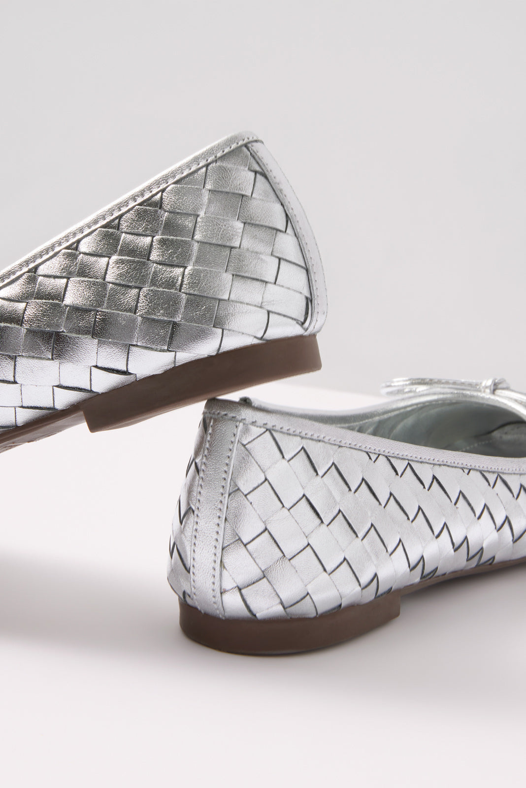 Chic and eye-catching. these silver ballet flats by Schutz are crafted in woven metallic leather with a squared toe and bow detail.