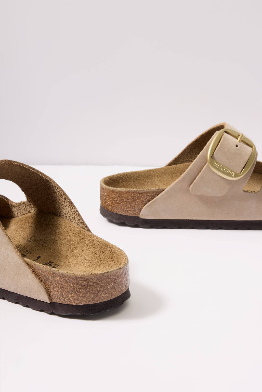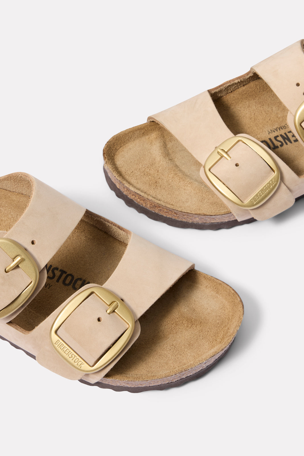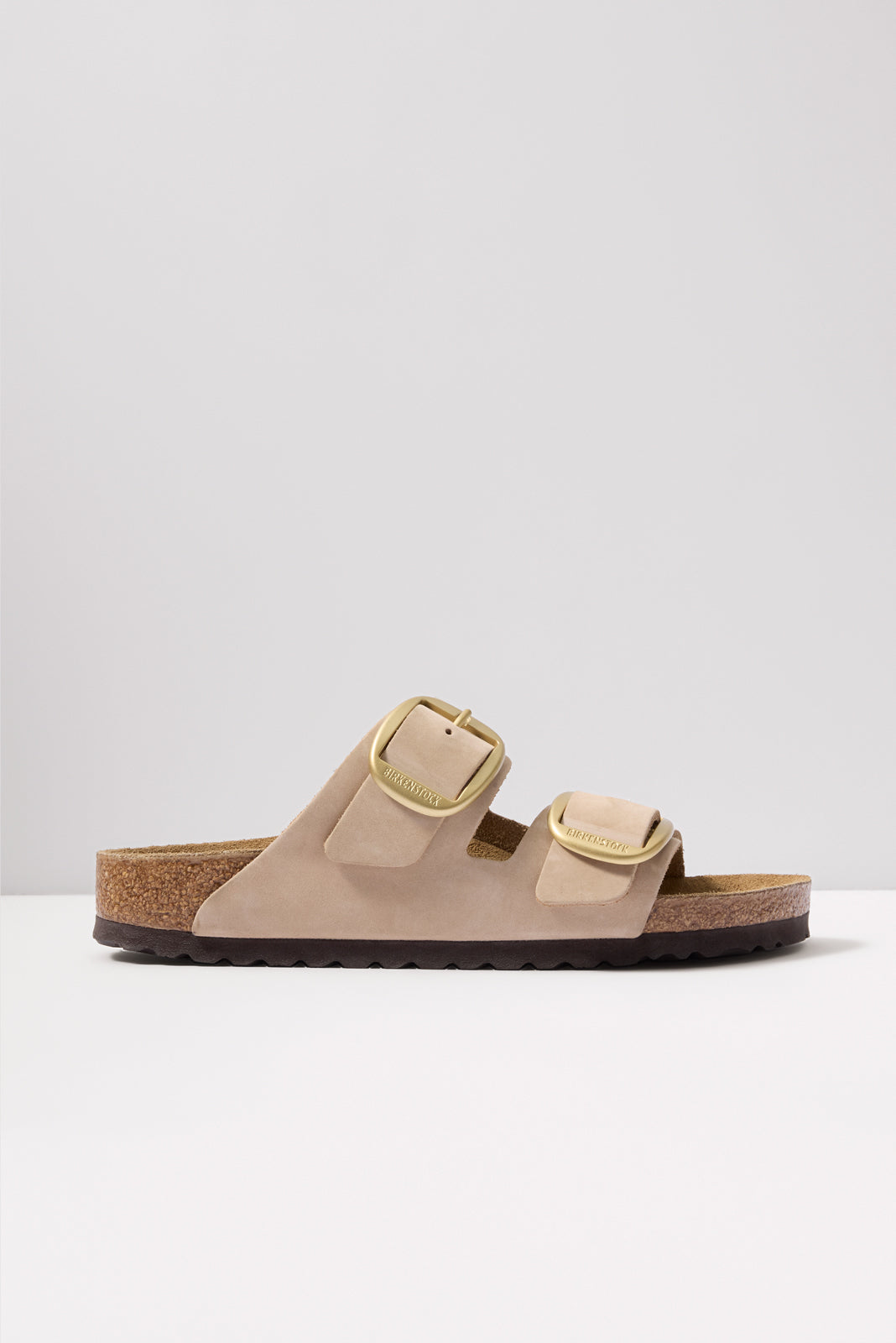Bold gold-tone buckles update these iconic Arizona sandals by Birkenstock. featuring nubuck leather straps and a comfortable cork footbed.
