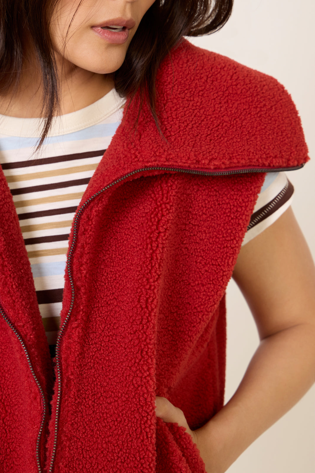 Nothing says fall quite like a pop of red in your wardrobe. The Baylor Sherpa Vest by LNA features a turn-down collar. front zipper closure. side pockets. and a cozy fleece material.