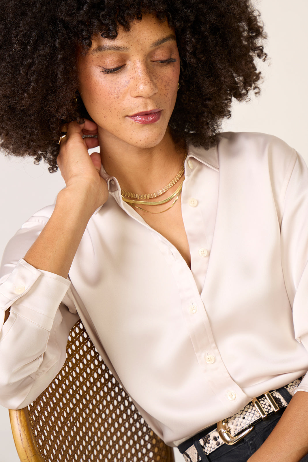 Finished in silky smooth fabric with a beautiful drape. this Spanx button-down shirt will take you from office to evening with ease. The Better Than Silk Top features a relaxed silhouette with a curved hemline. front button closures. and long sleeves.