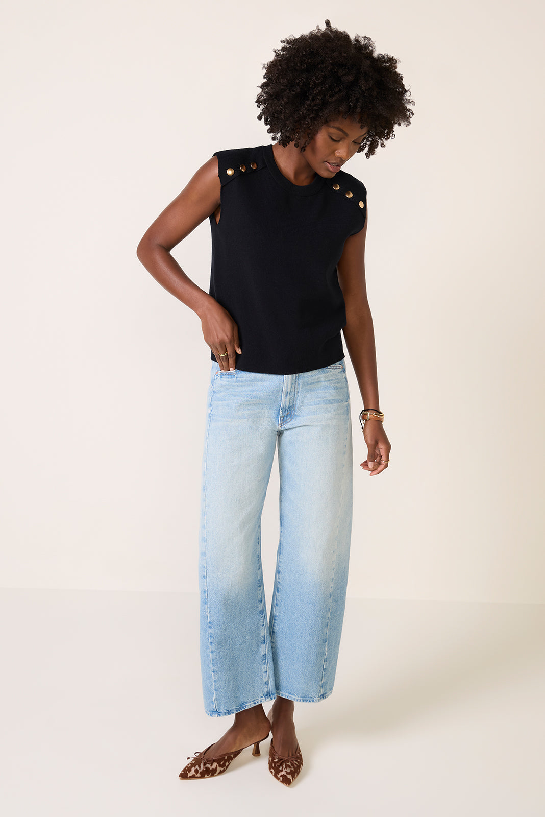 Gold shoulder buttons add a chic touch to the Bevan Sweater by EVEREVE. featuring a crew neckline. a soft knit fabric. and a relaxed. sleeveless silhouette.