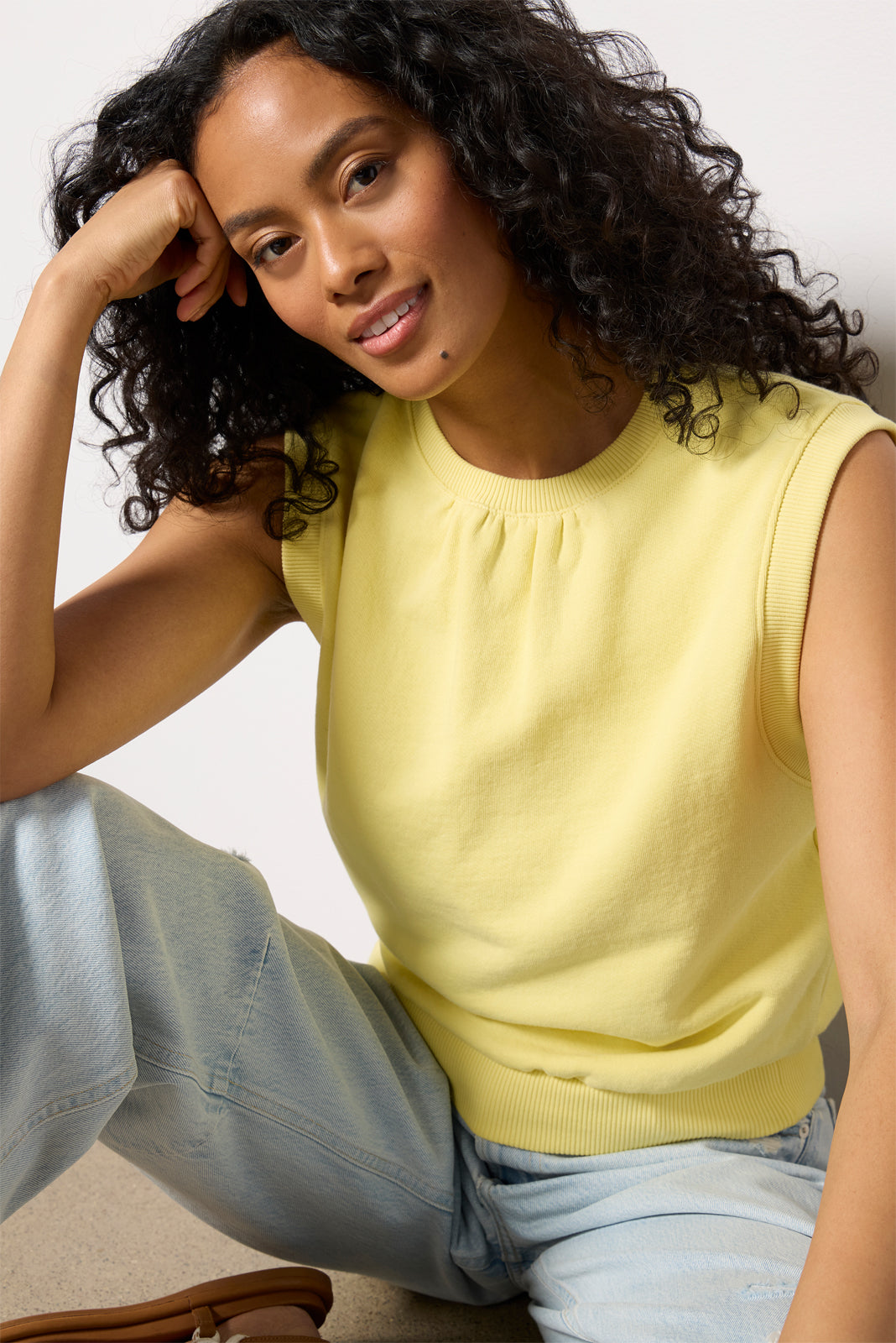 Say hello to spring with the Billie Sweatshirt Tank by Nation LTD. Finished in a comfy blend of Tencel and Pima cotton. this sleeveless sweatshirt features a cropped fit. shirred neckline. and back gold button detail.