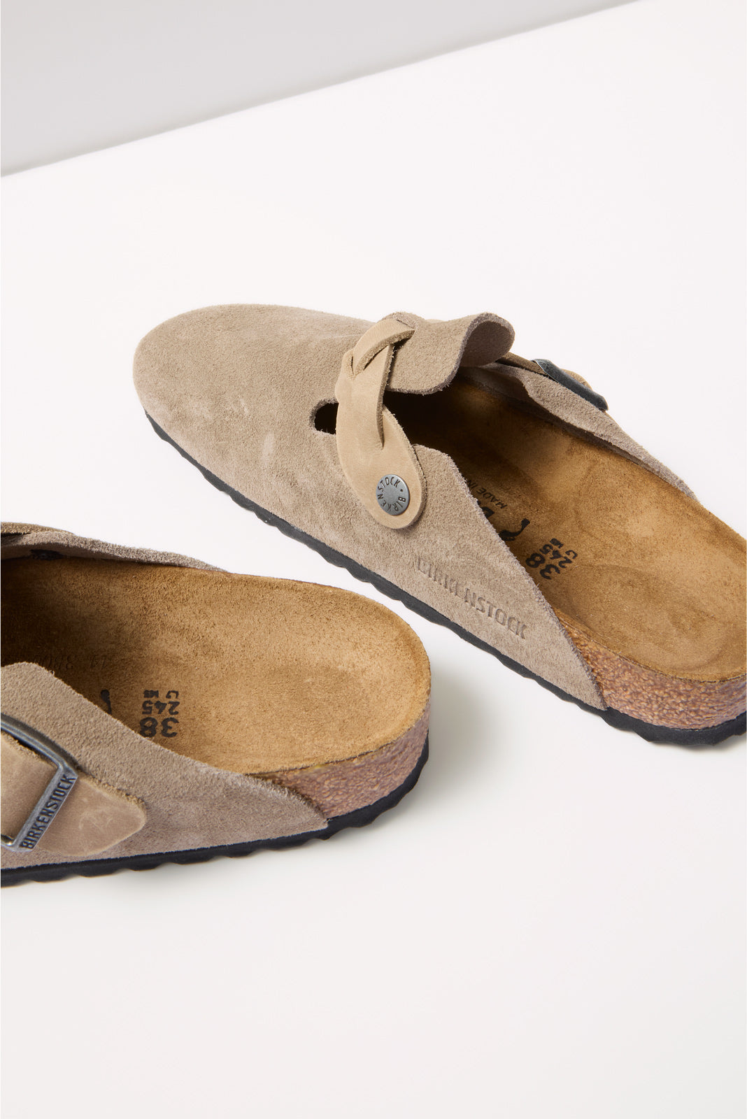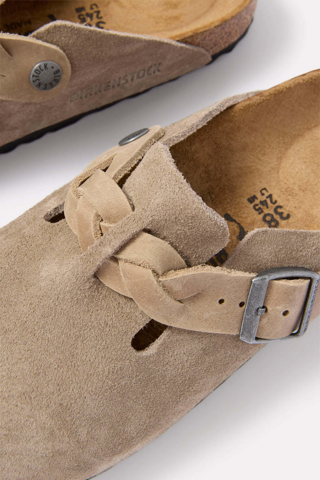 Updated with a braided strap detail. these iconic Birkenstock clogs are an easy. effortless favorite. featuring a soft suede upper. slip-on design. and contoured cork footbed.