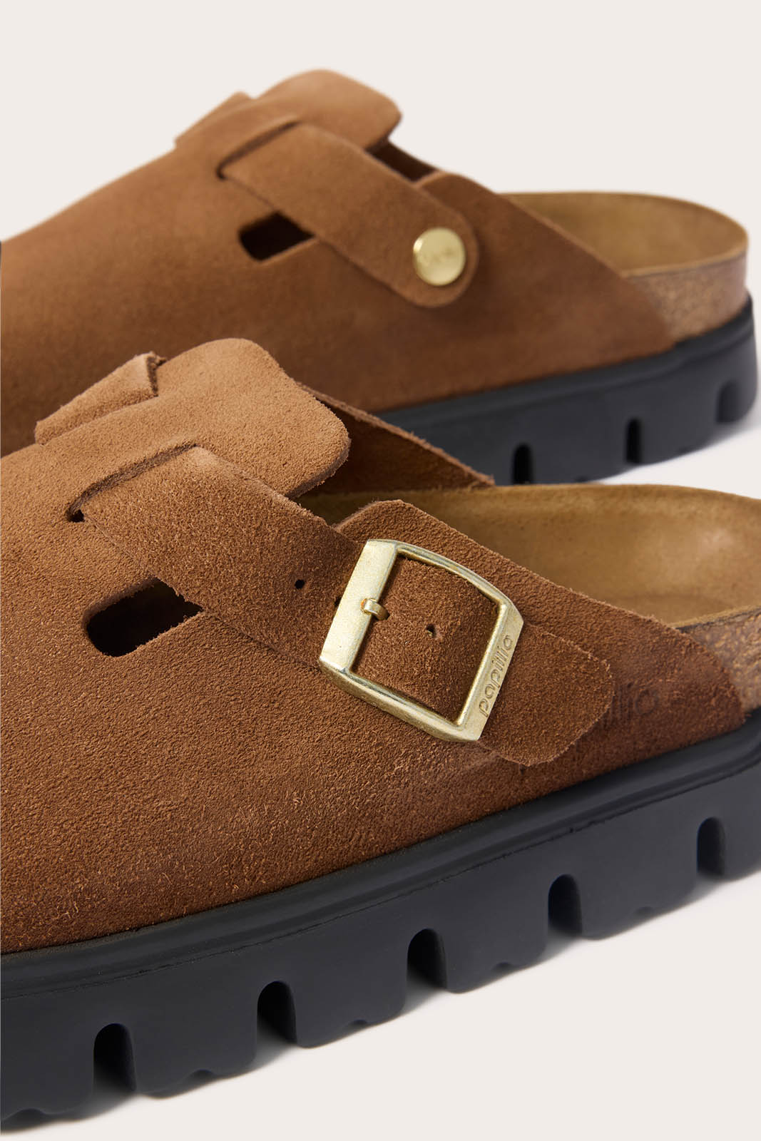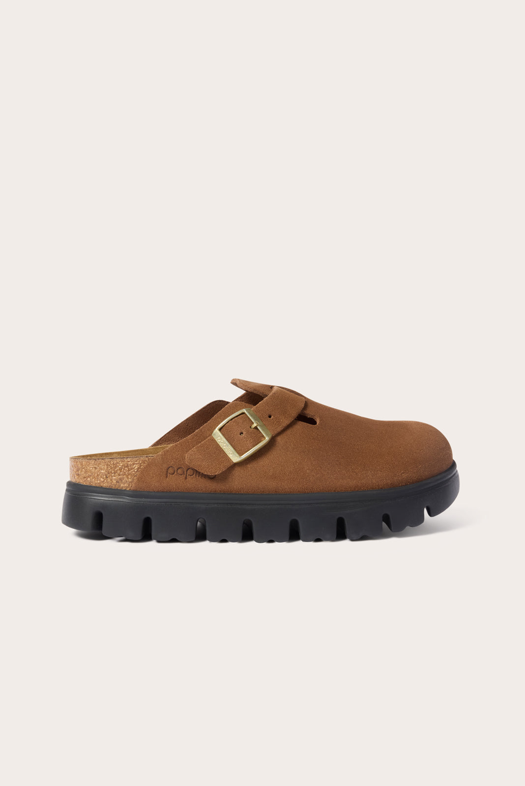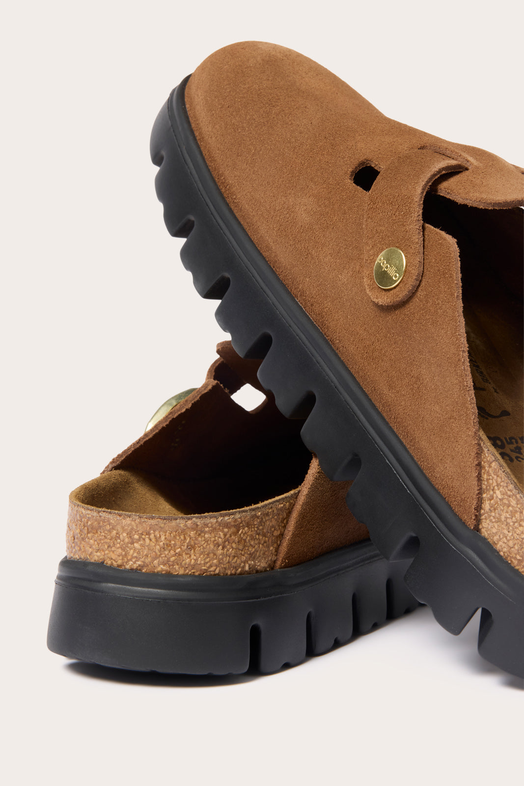A chunky platform sole updates the iconic Boston clog by Birkenstock. featuring a soft suede upper. slip-on design. and gold buckle detail.