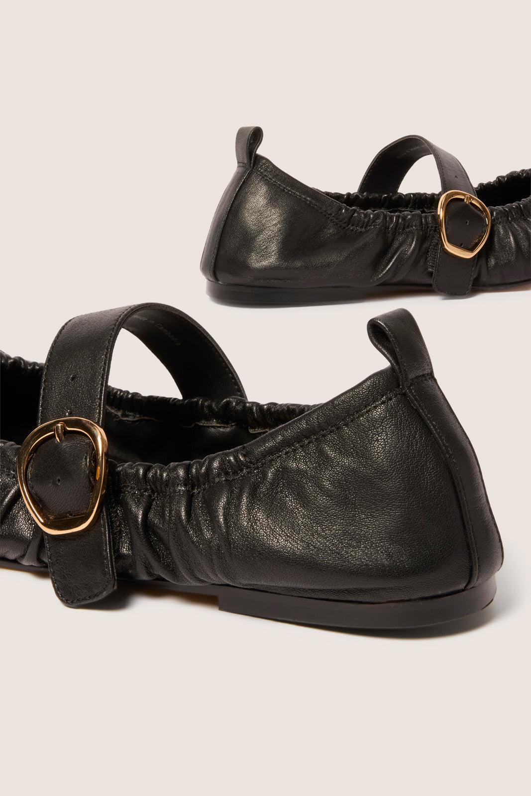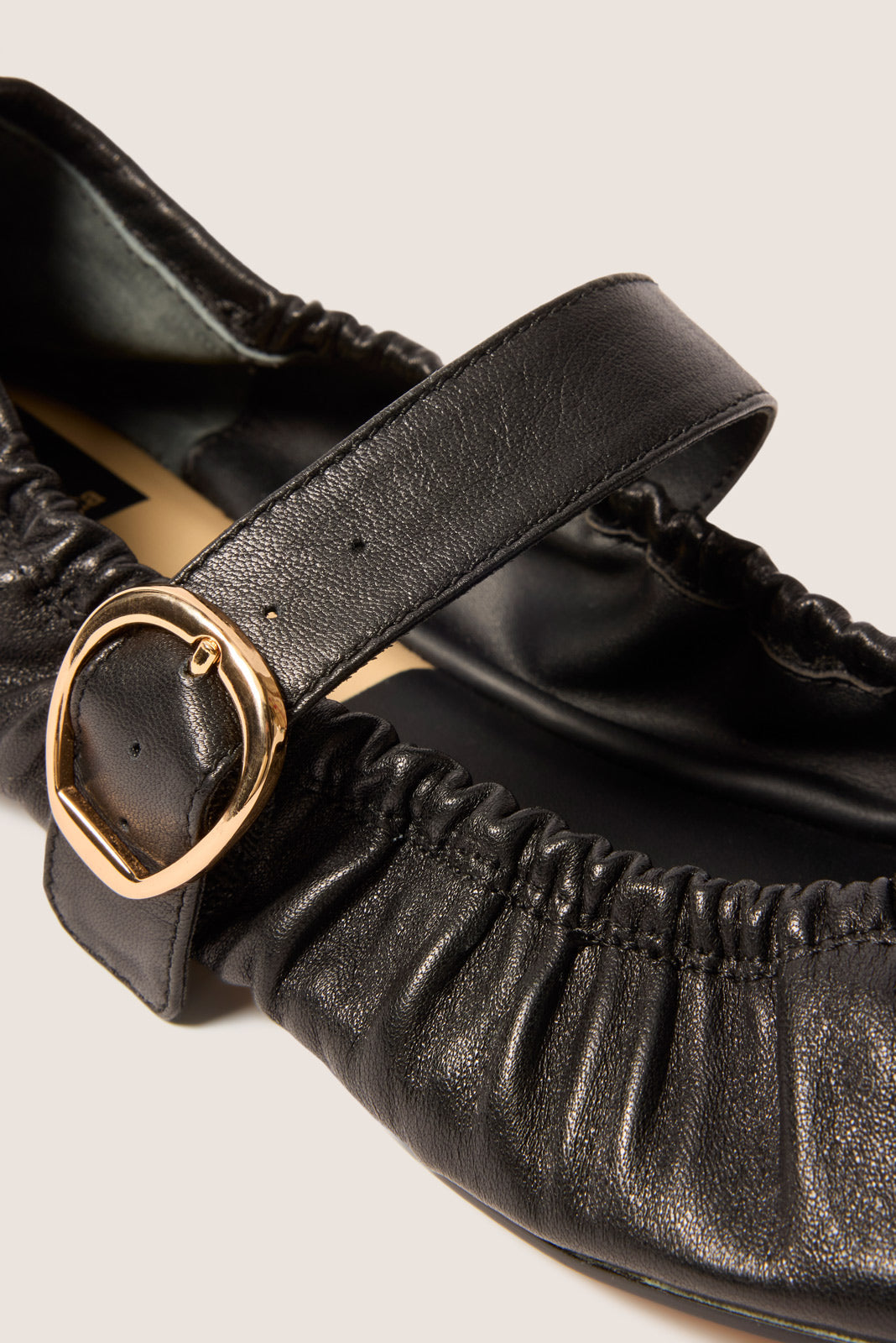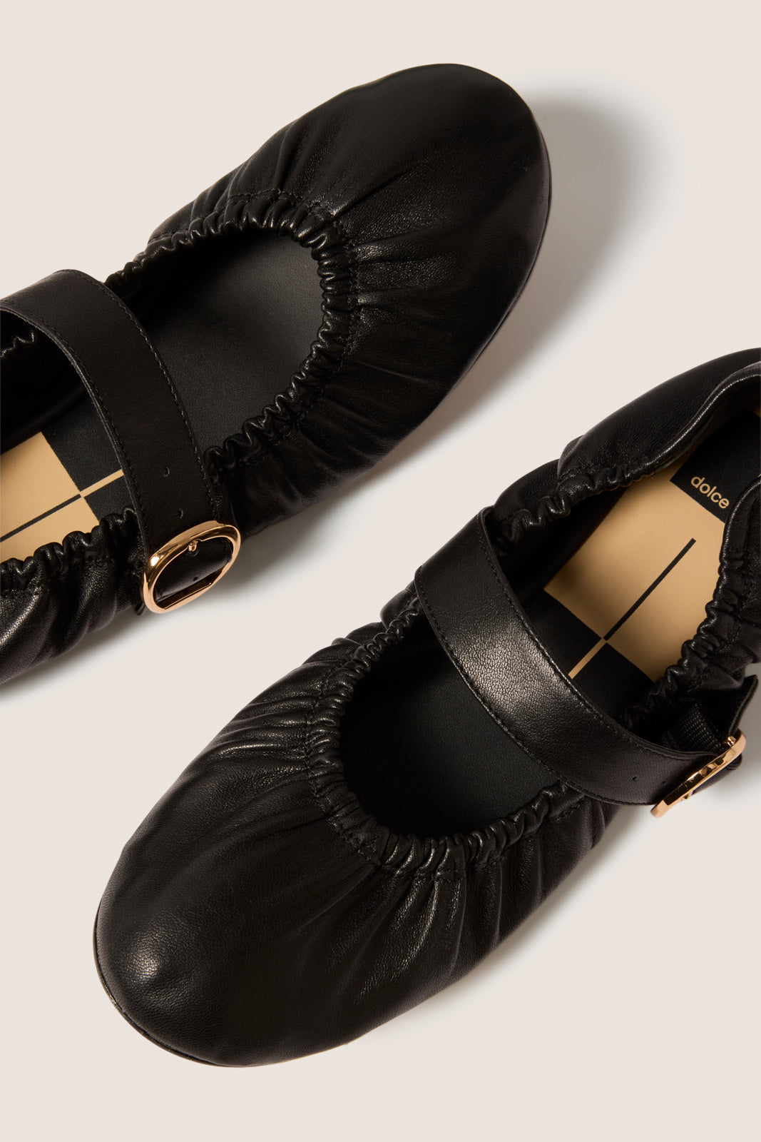 Finished in soft black leather. these chic. ruched ballet flats by Dolce Vita are designed with a Mary Jane strap. gold buckle. and cinched silhouette for a flexible fit.