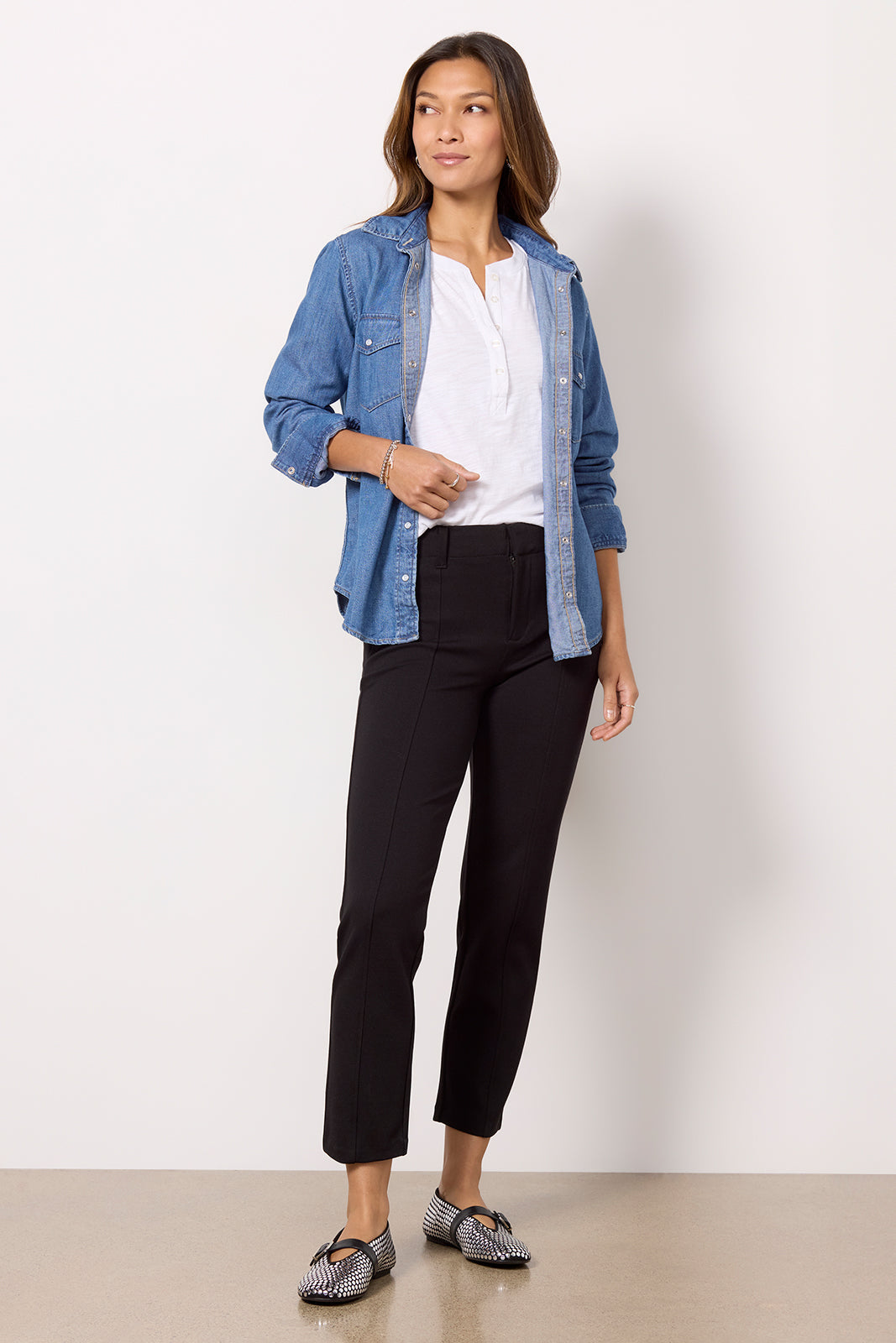 An effortlessly polished pick for office-to-evening wear. Crafted in twill ponte fabric. the Cassie Legging by Sanctuary features a fitted silhouette with a slim straight leg. vertical seam details. and zipper side pockets. The ankle-length hems are perfect for showing off your favorite footwear.