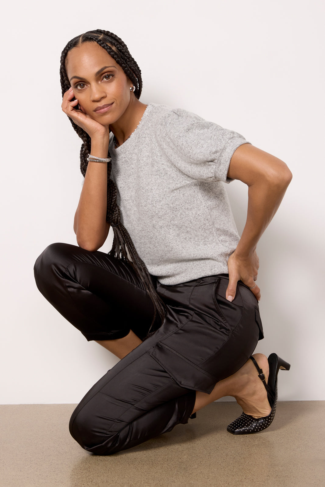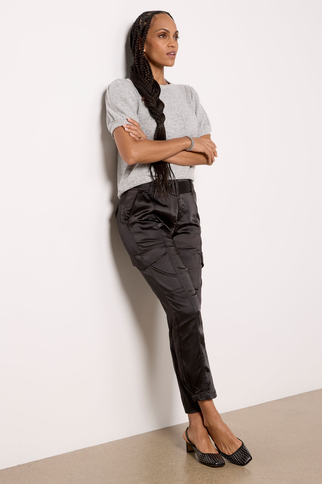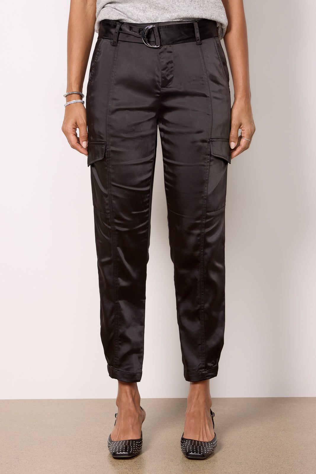 Sleek satin fabric puts an elevated spin on these utility-style pants by Sanctuary. finished with cargo pockets. center seam details. and a pull-through satin belt. Tuck in a sweater or tank for a chic night-out look.
