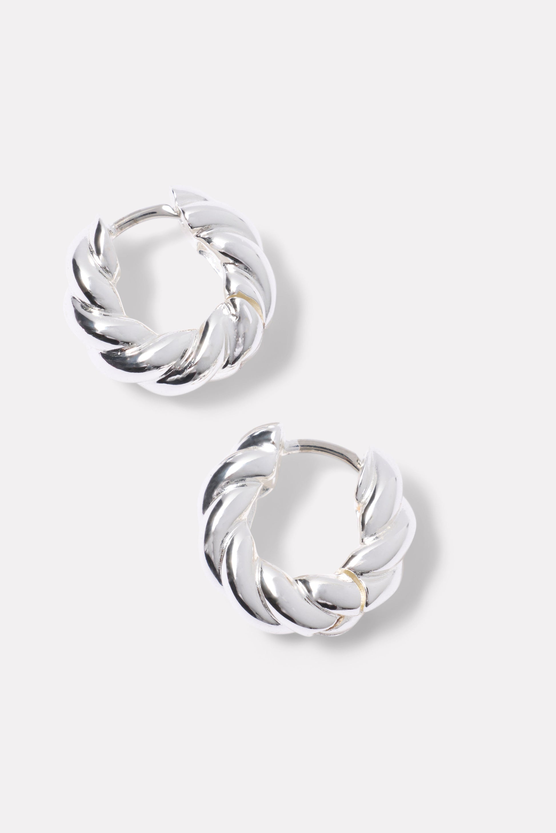 The Crew Helium huggie earrings by Gorjana are the perfect everyday accessory. featuring a twisted hoop shape. hinge closure. and silver plated finish.