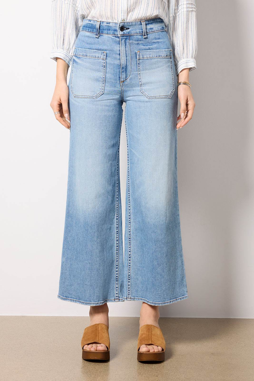 Finished in soft stretch denim. this modern sailor jean by ASKK NY features a high-rise silhouette with a relaxed wide leg. ankle-length hems. and patch pockets at the front and back.