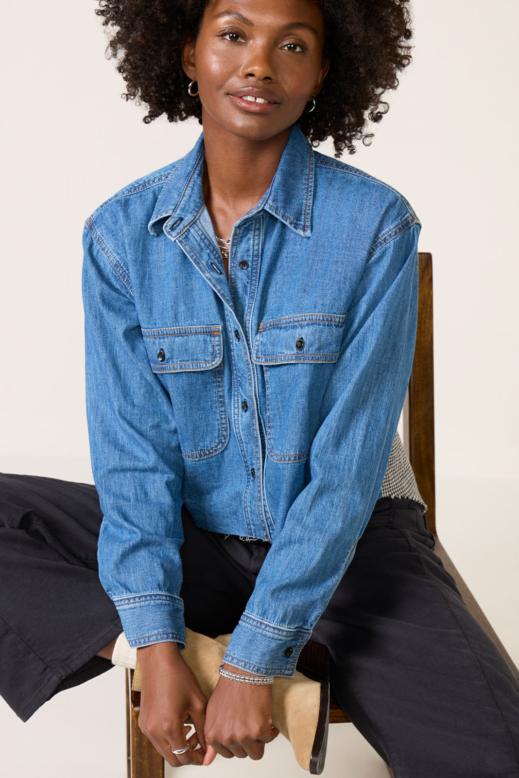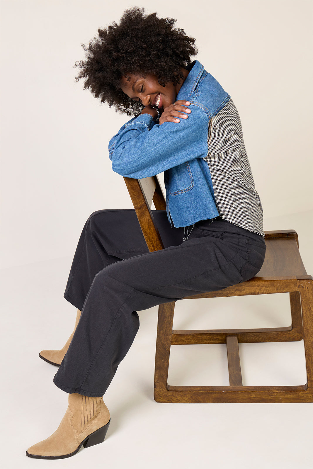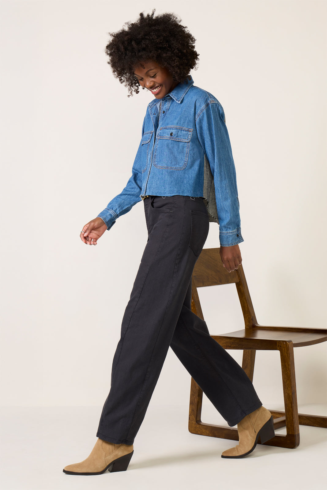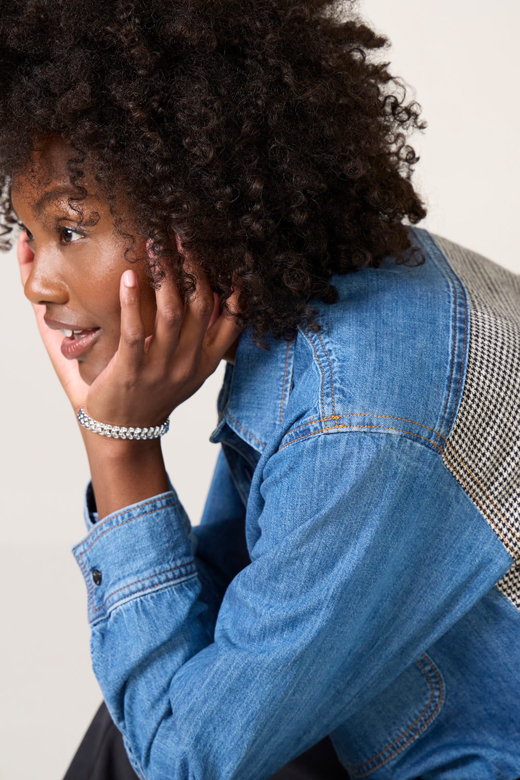 Perfect for weekend wear. the Crosby combo button-down shirt by ASKK NY is crafted from soft cotton denim and features a contrasting houndstooth back panel. cropped fit. and raw-edge hem for a lived-in feel.