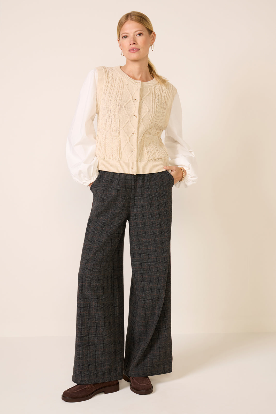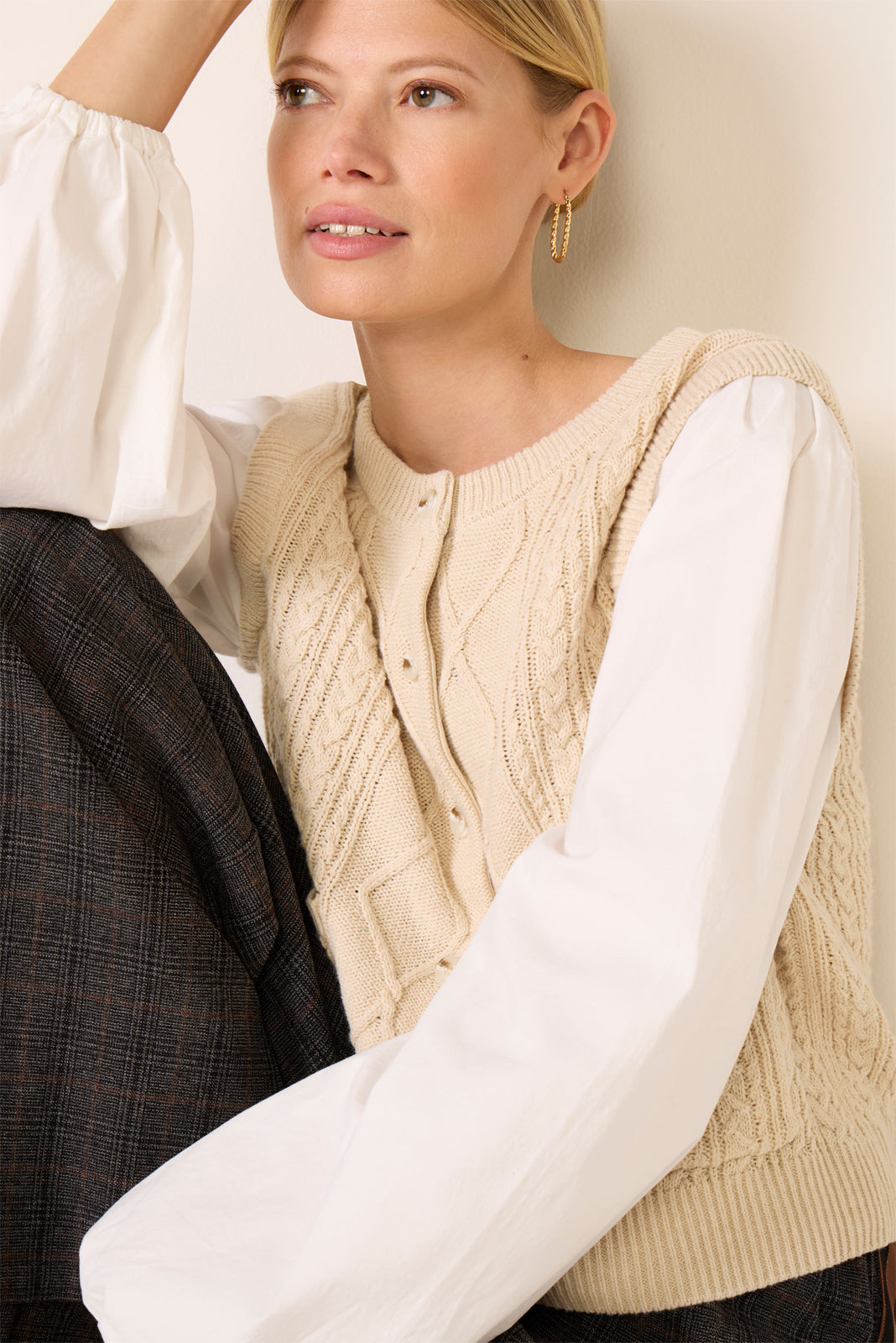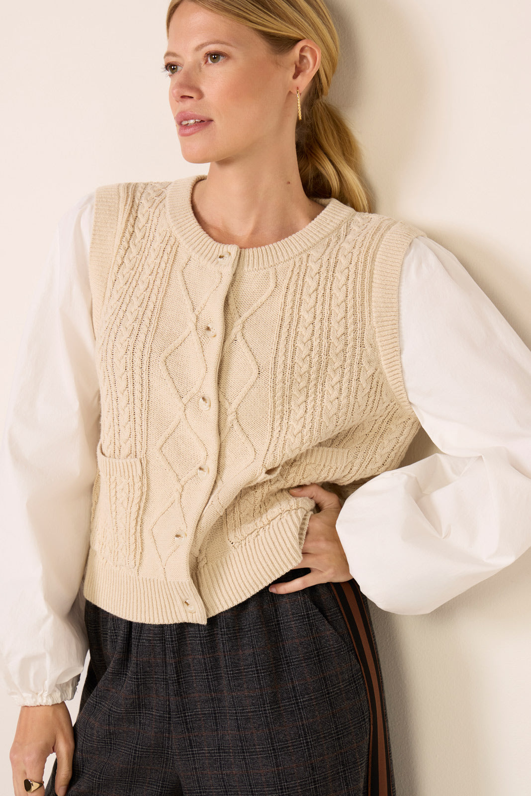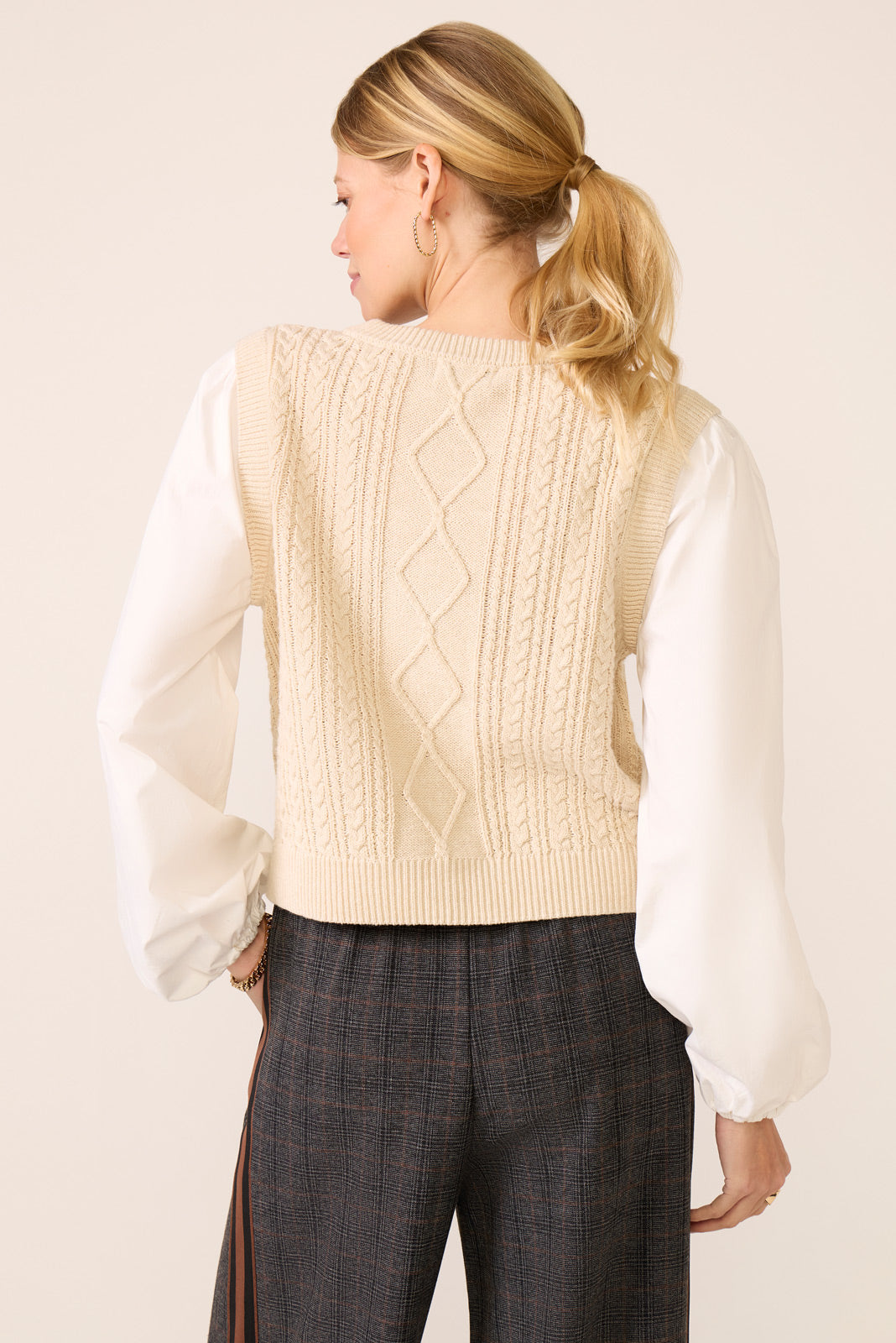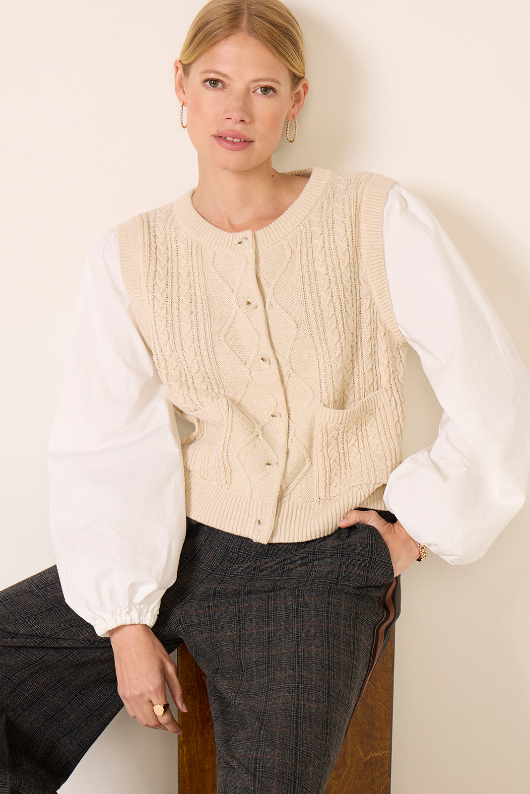 Designed with a cable knit sweater vest and attached poplin puff sleeves. the Della twofer by EVEREVE creates the perfect no-fuss layered look. featuring a cropped length. crew neckline. and front patch pockets.
