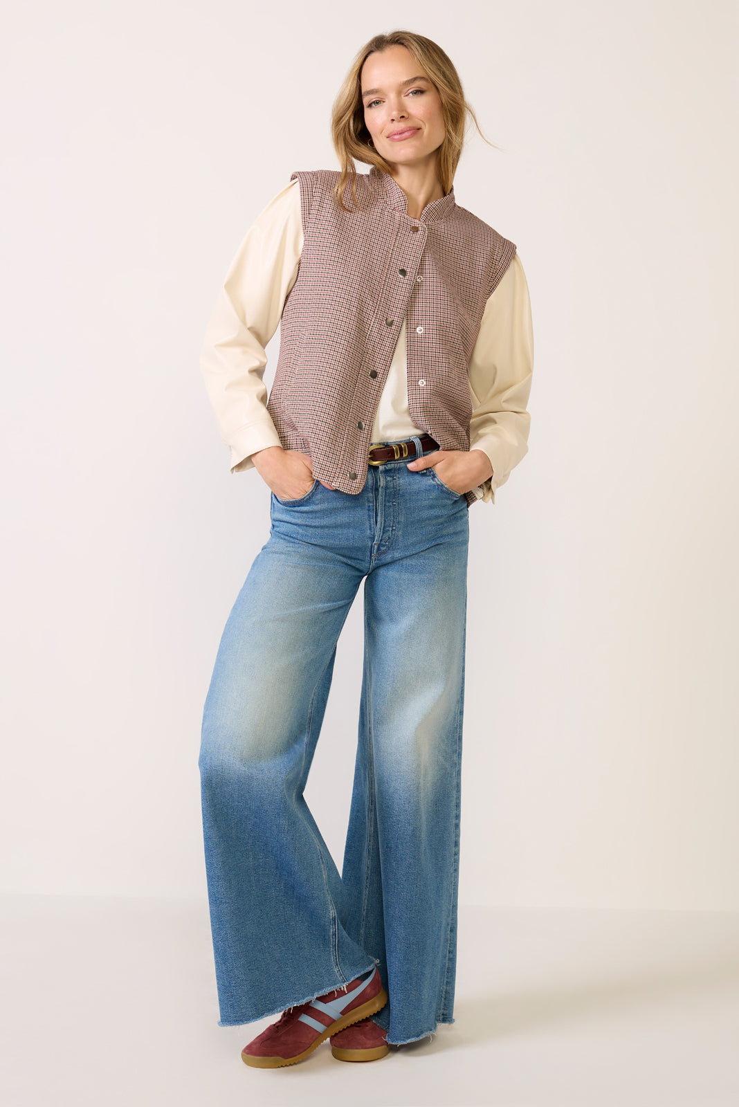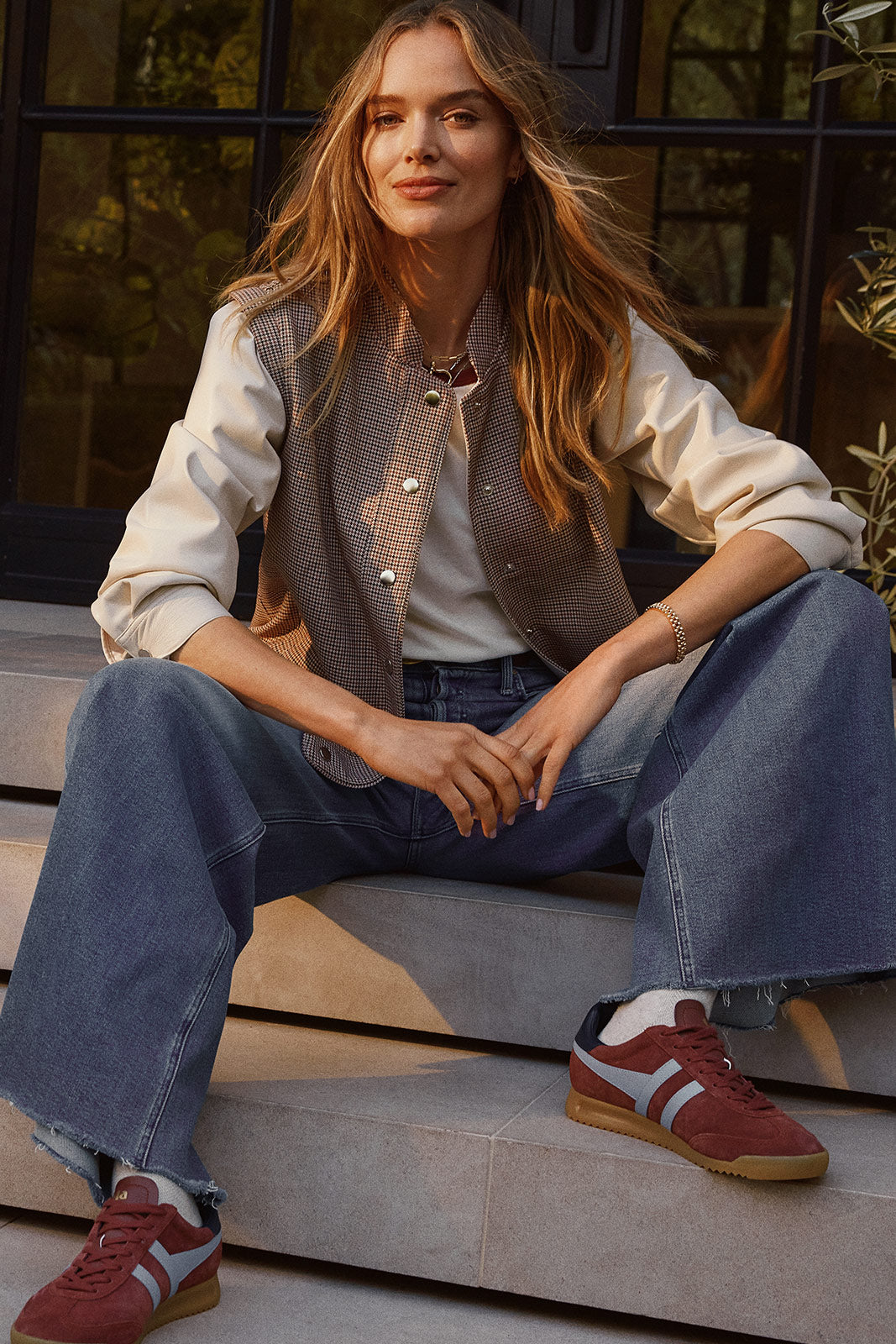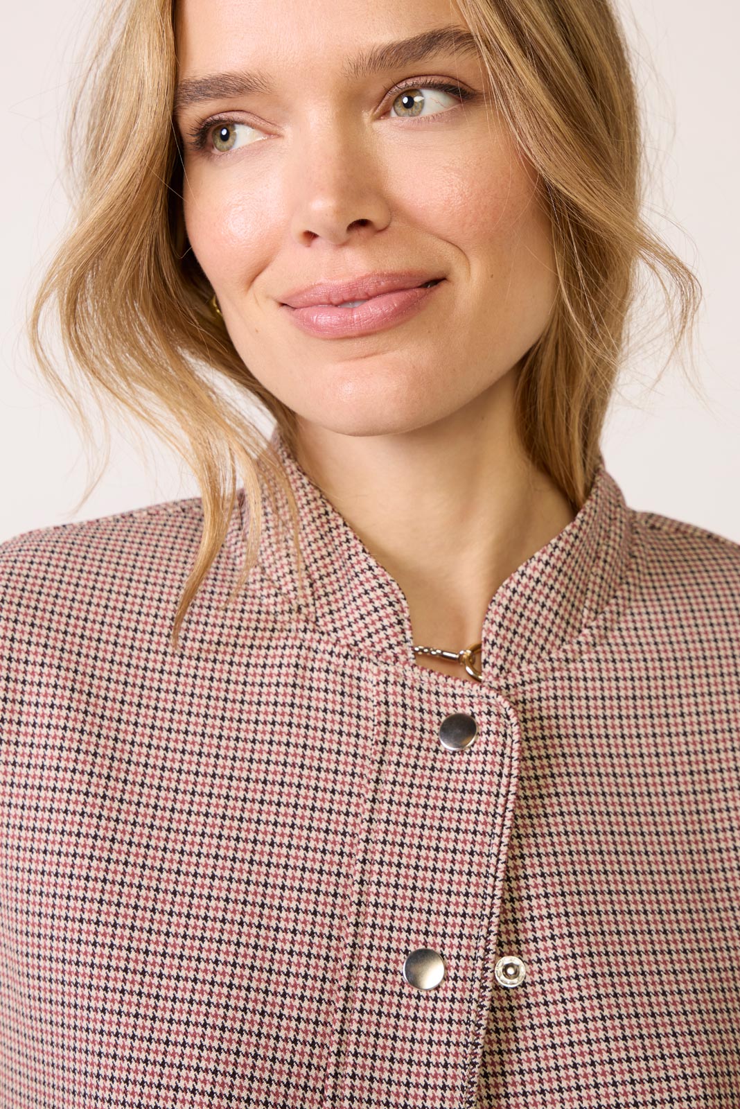 Add a sport bomber to your jacket collection with the Effie Bomber by Melissa Nepton. featuring snap button closures. contrasting sleeves. and a versatile houndstooth print.