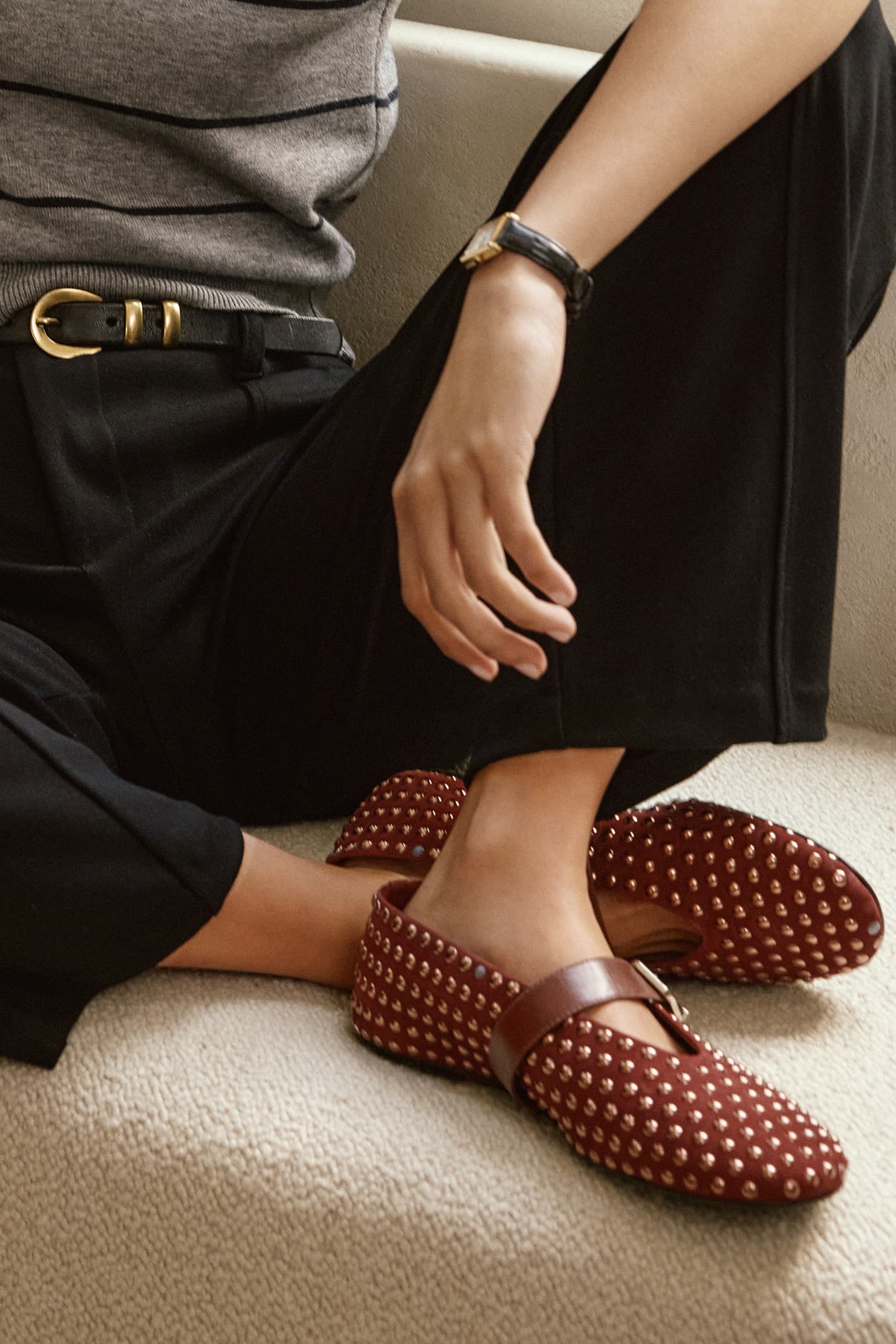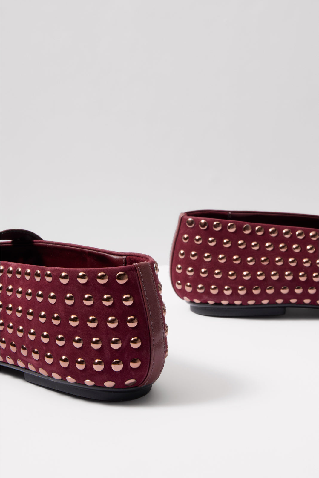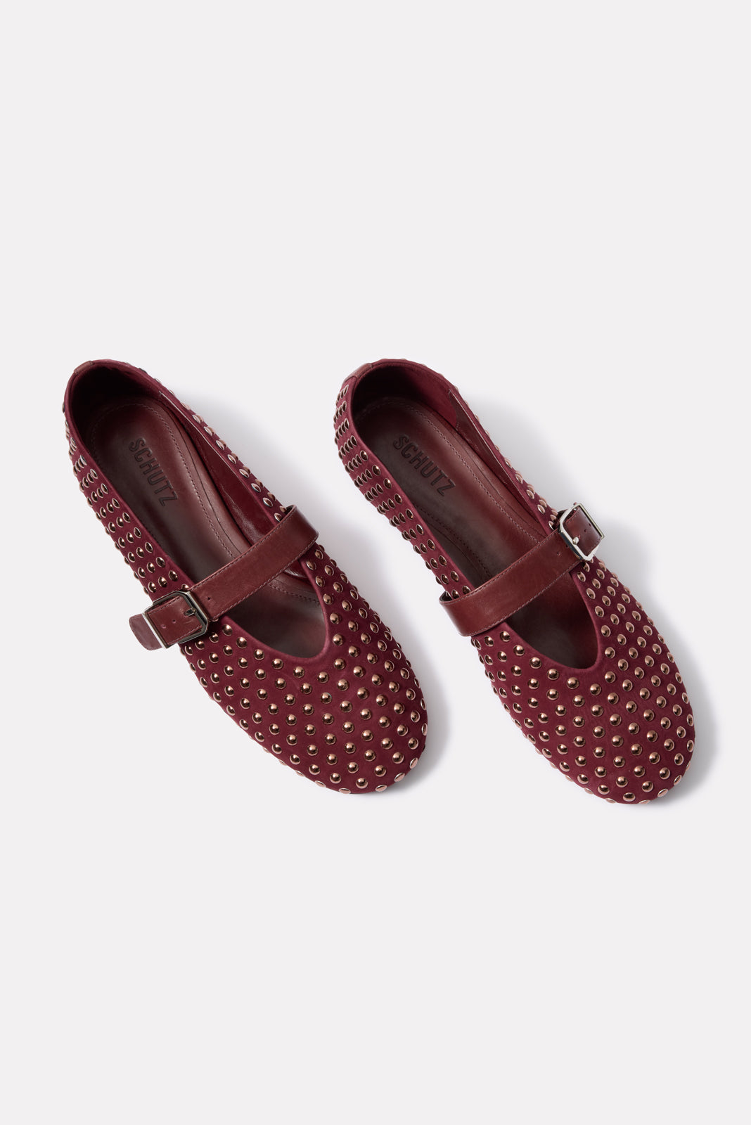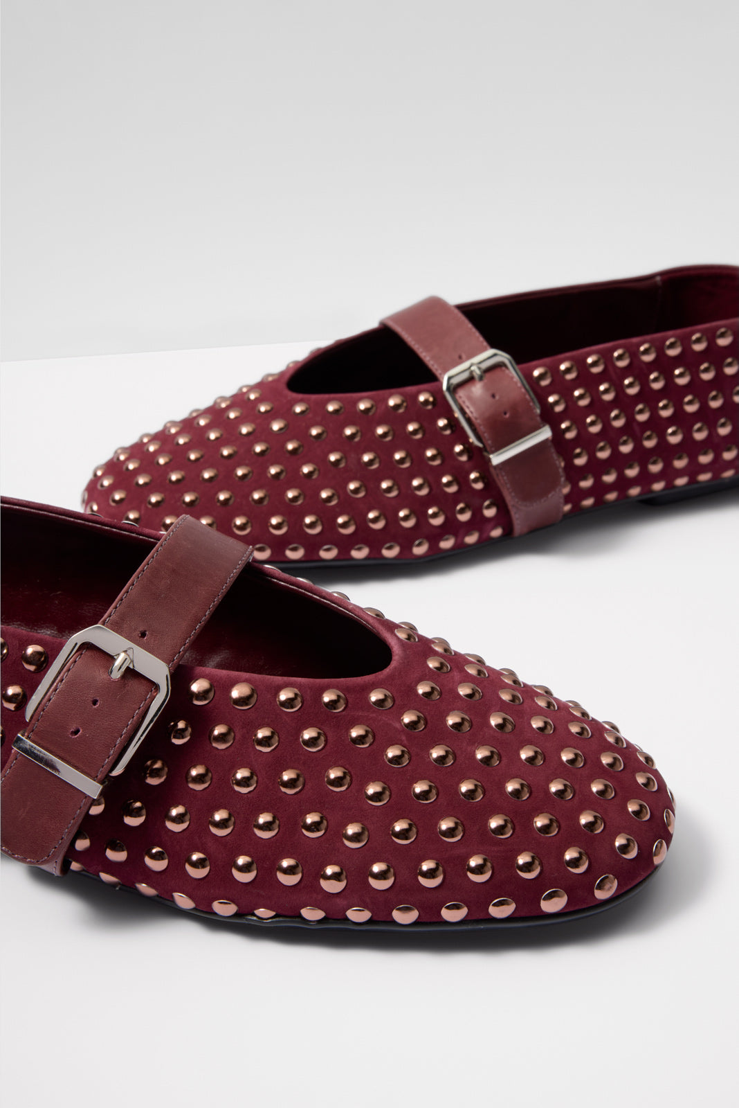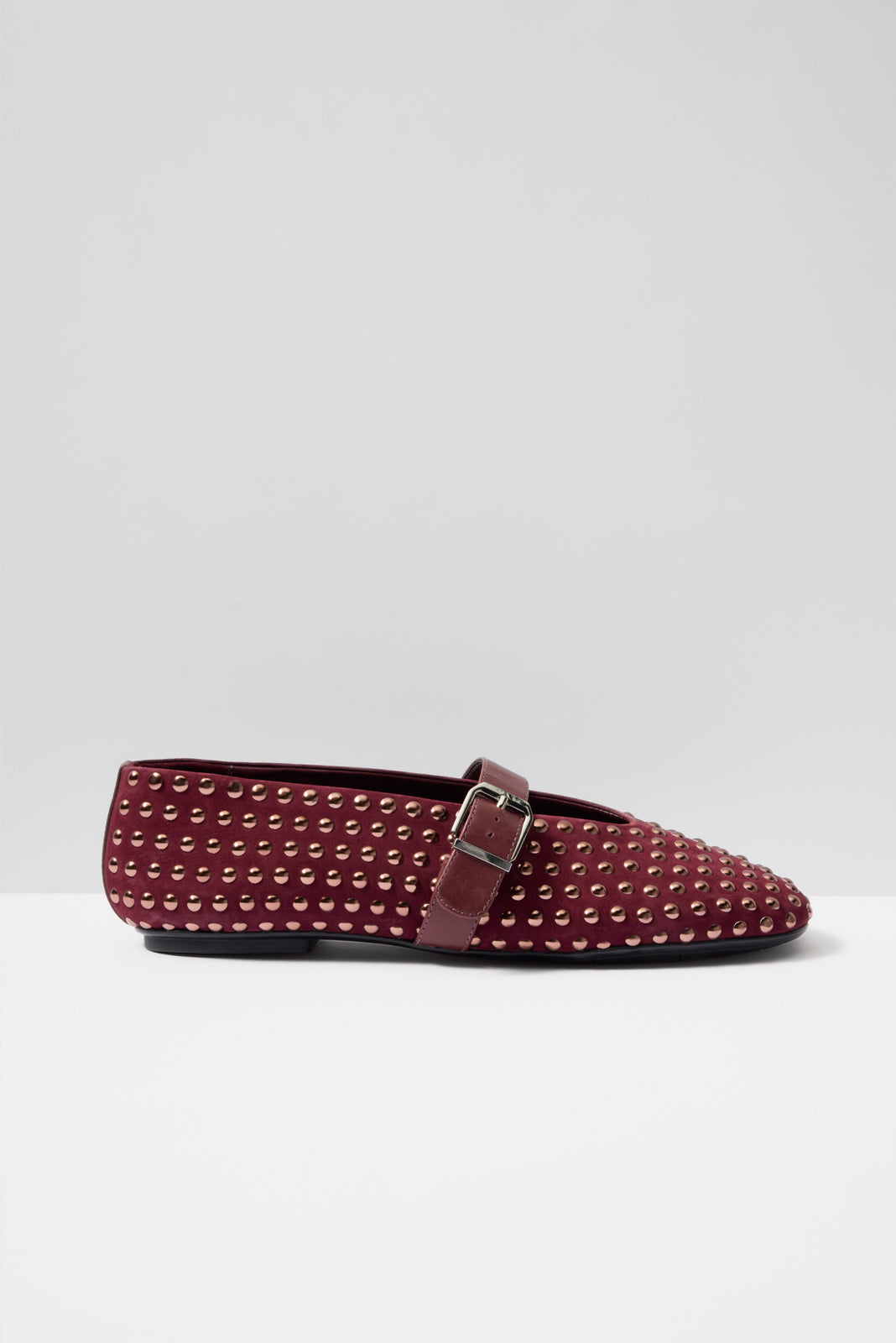 Edgy studs adorn these chic Mary Jane ballet flats by Schutz. finished in wine-colored suede with a round toe and adjustable buckle strap.