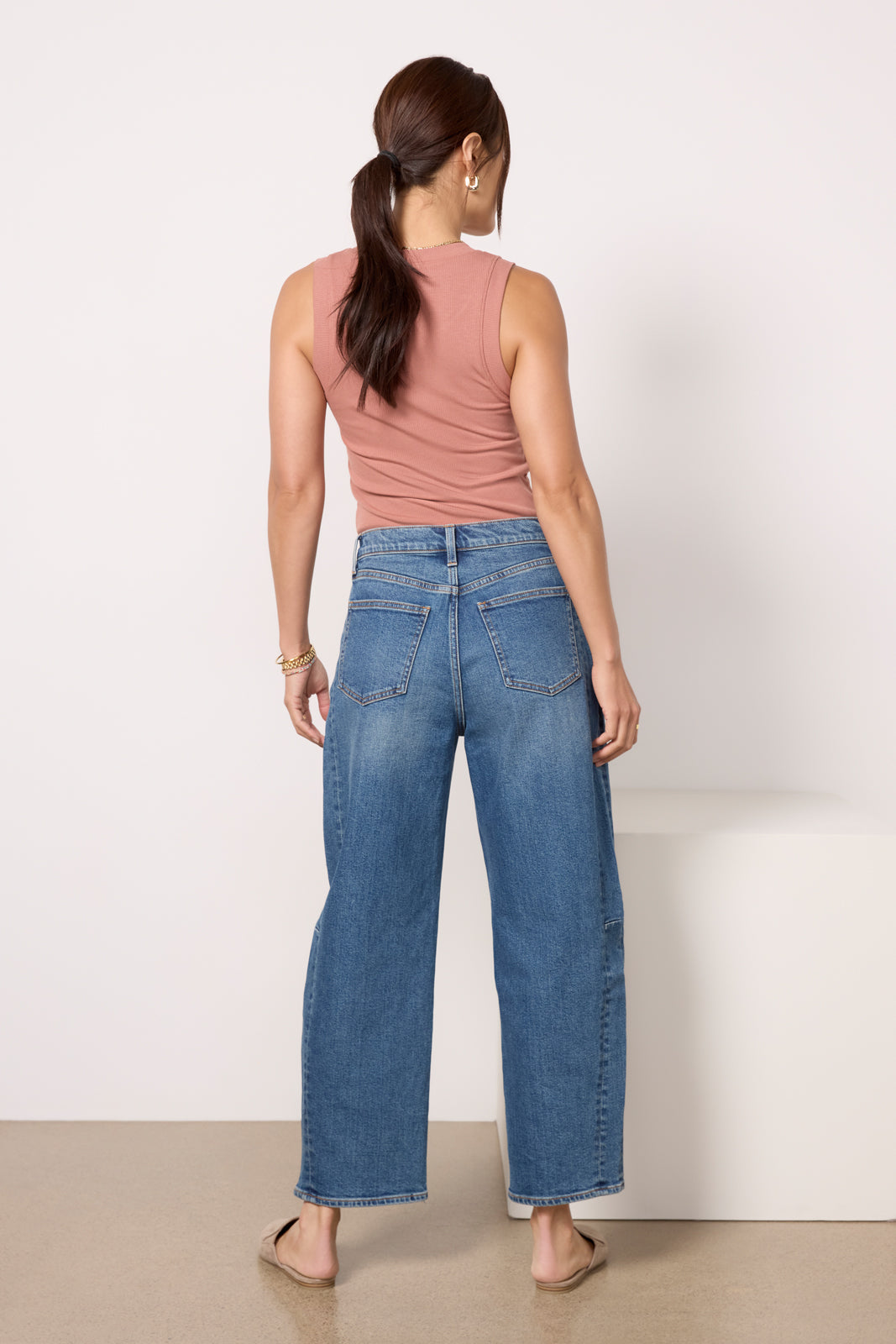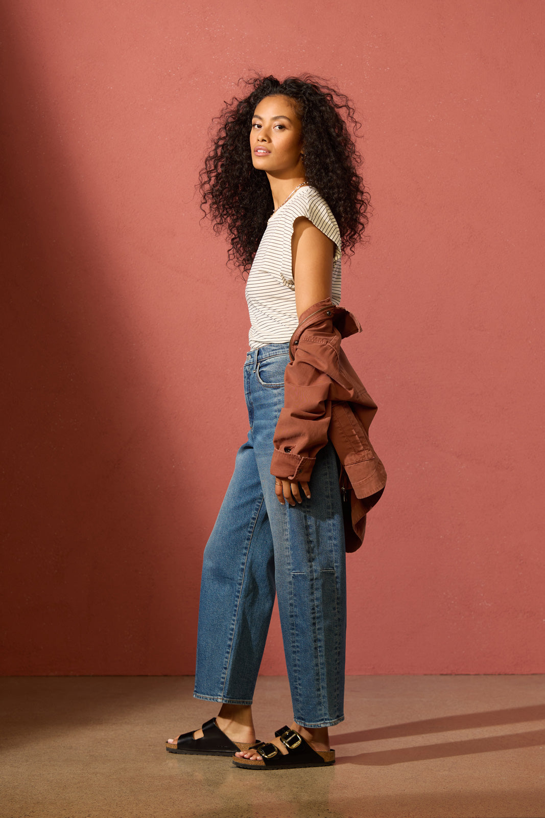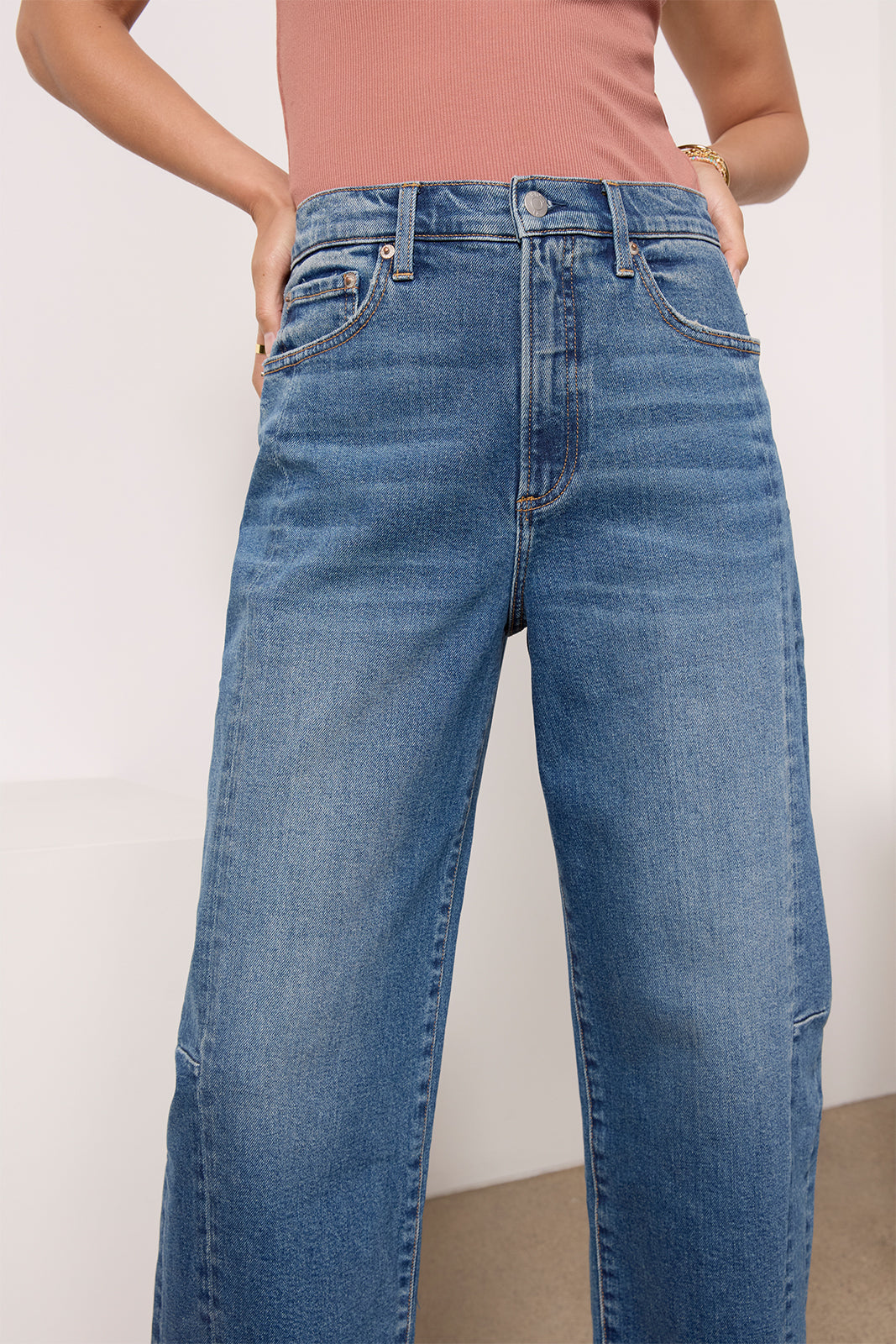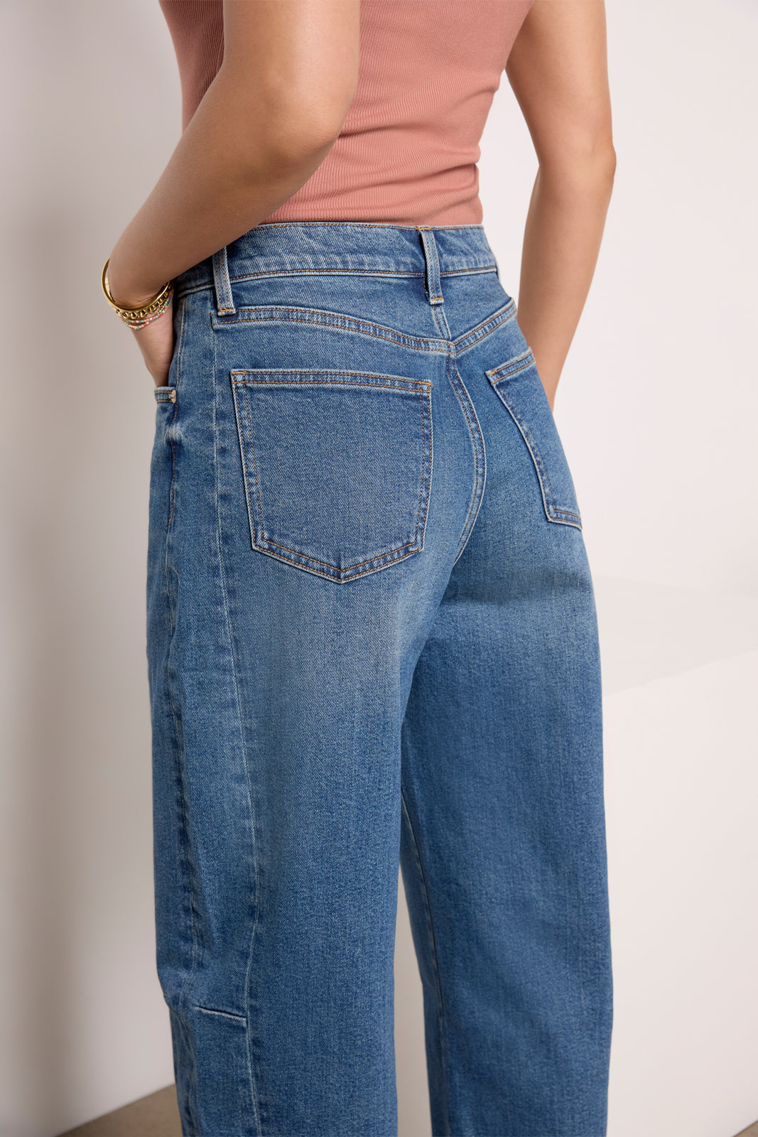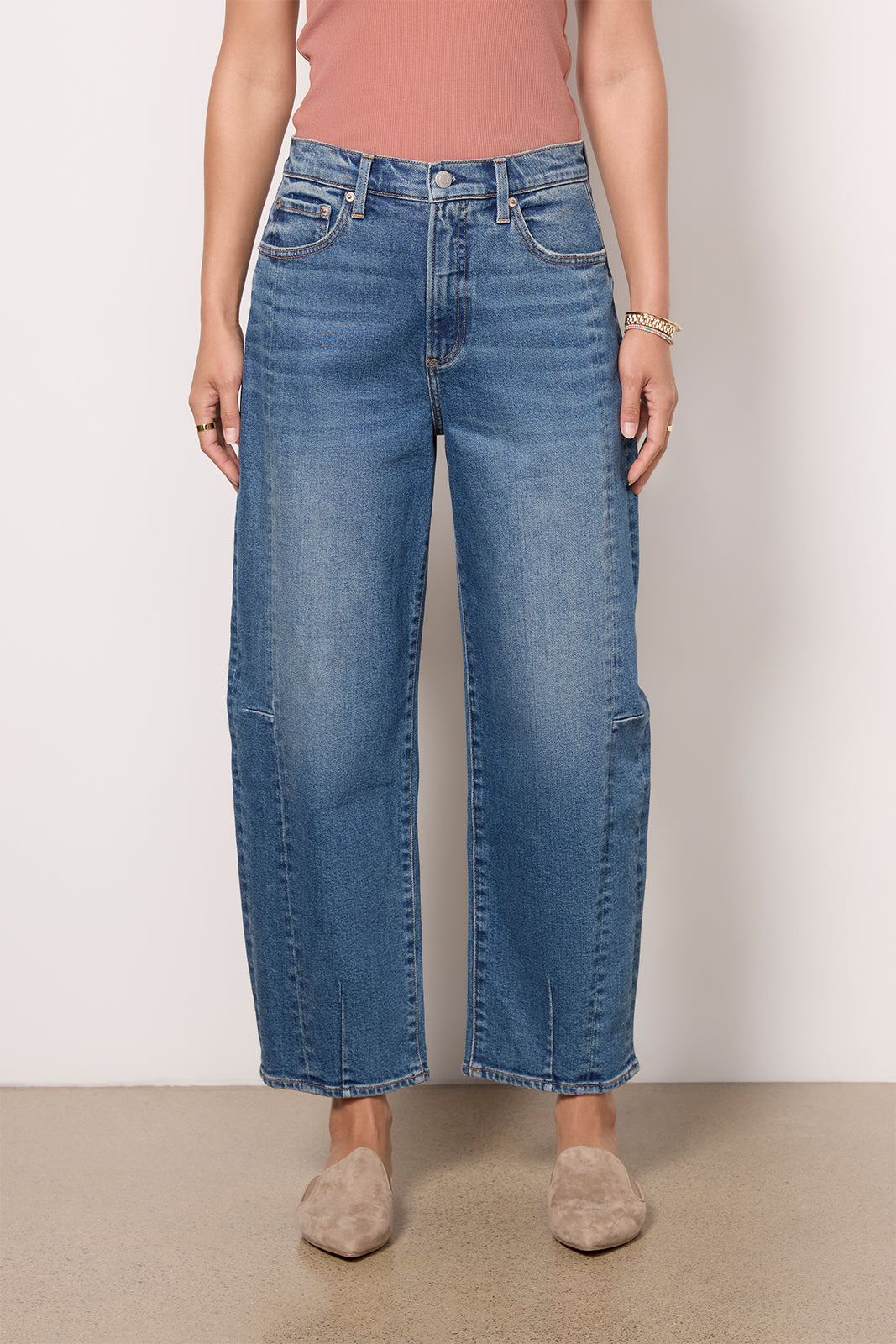 The Eli Arched Leg jean by Pistola is crafted in a stretch cotton fabric and features a modern barrel silhouette achieved through a subtle bowed shape and relaxed. high-rise fit.