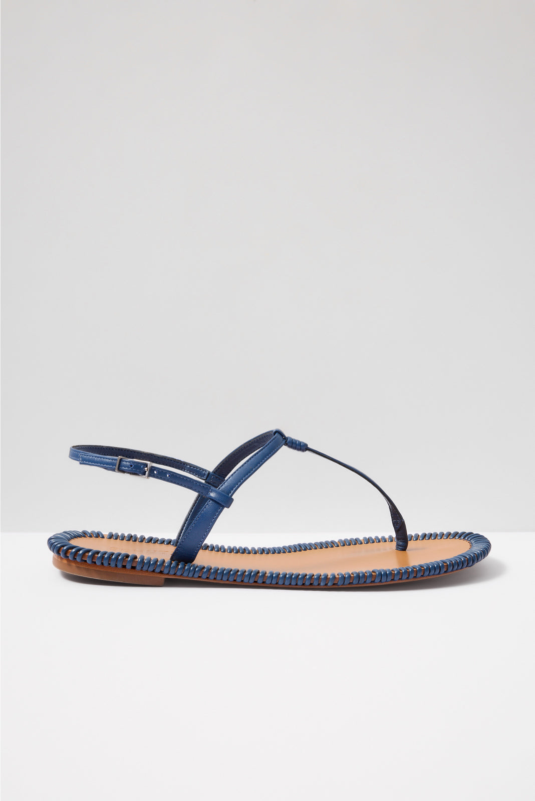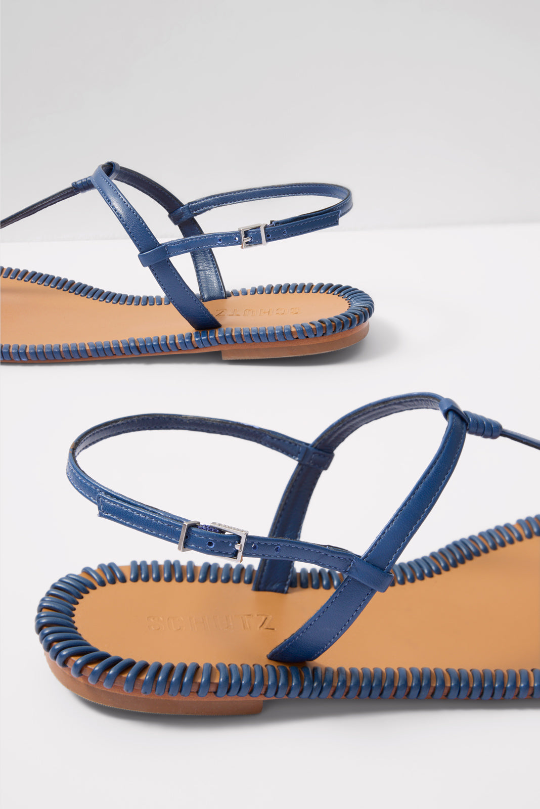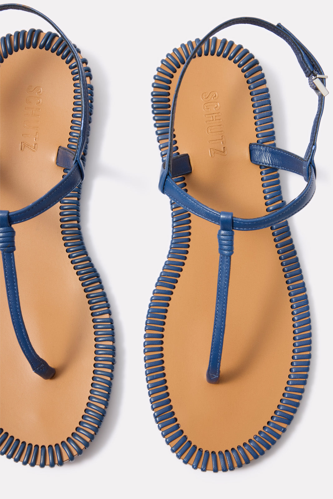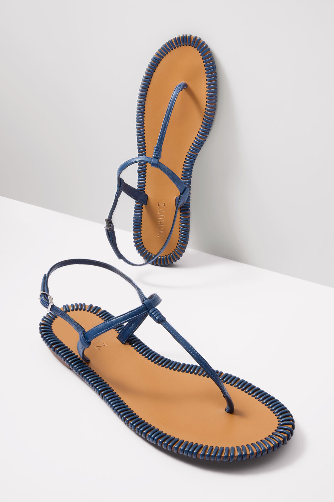 Complete any summer look with the Elsha Sewing flat sandal by Schutz. These leather thong sandals feature a T-strap design. adjustable buckle closure. and whipstitch detailing around the sole.