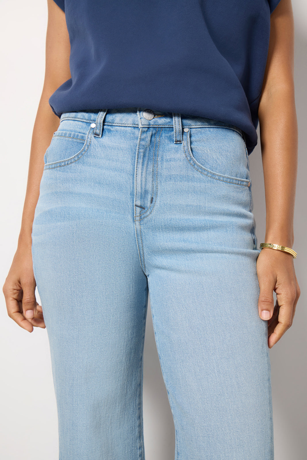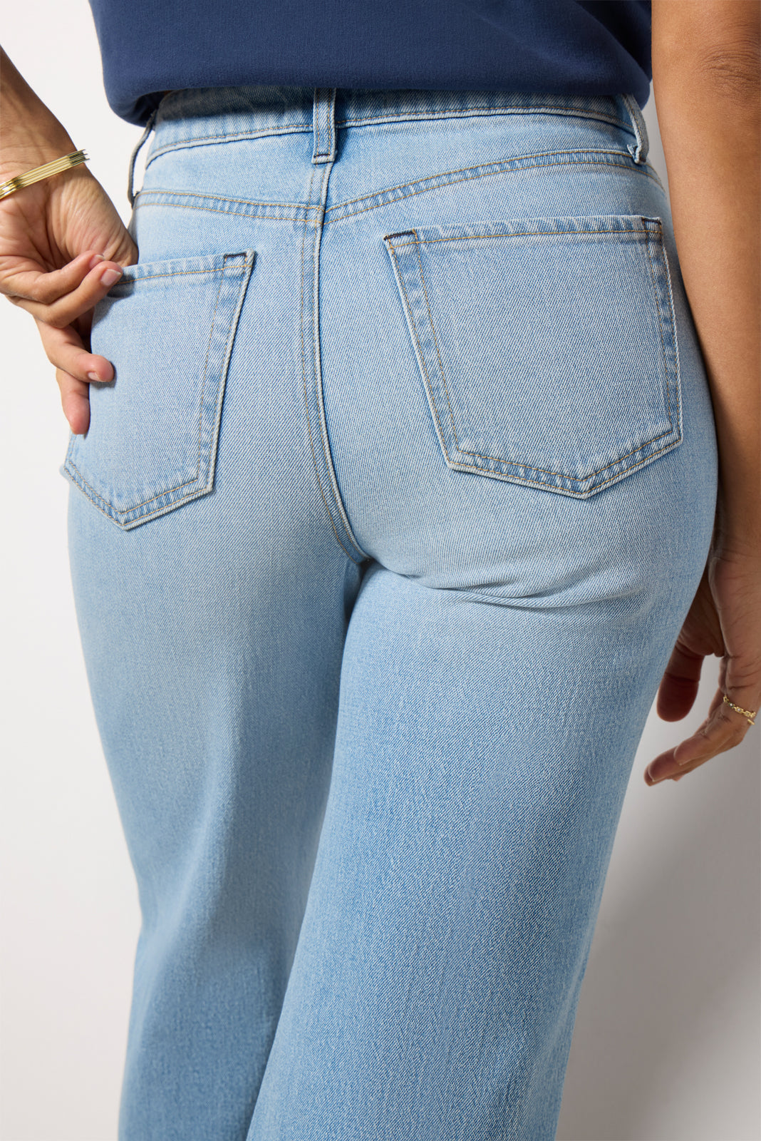 Contrasting inset hems put a stylish spin on these bootcut jeans by EVEREVE. featuring a high-rise fit. twisted side seams. and light-wash denim fabric.