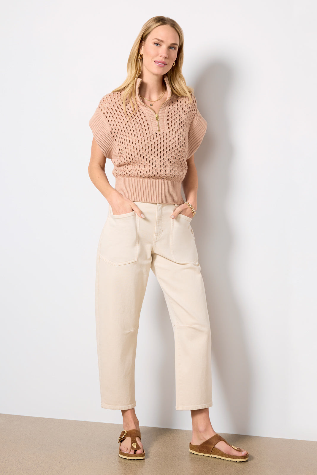 Finished with airy open stitching. the Gaines half-zip sweater by Varley is the perfect warm-weather knit. This cotton pullover features a relaxed. cropped silhouette with dropped shoulders. wide ribbed trim. and a stand collar.