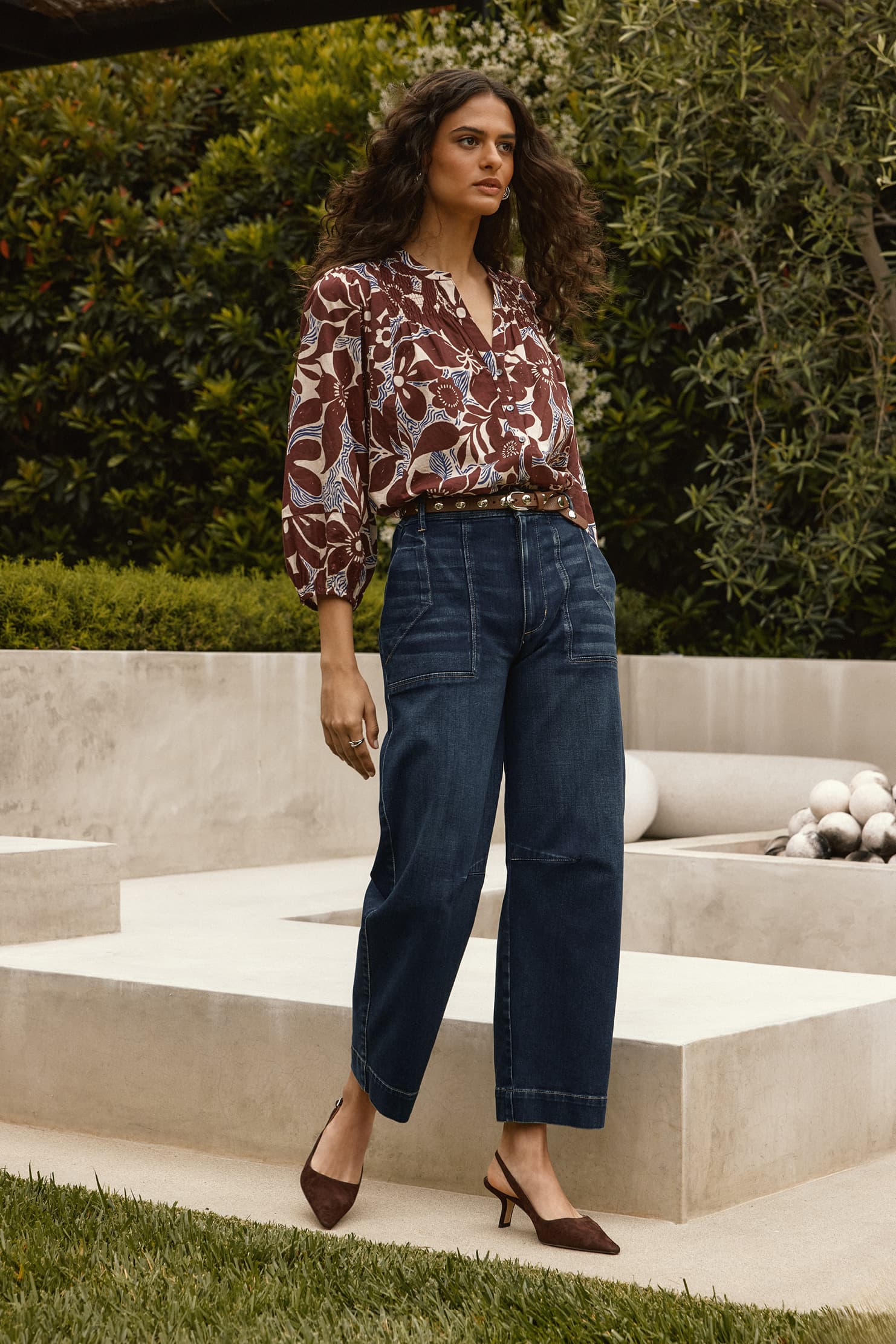 Add a pop of print to your wardrobe with the Haddon Top by Velvet. This button-front blouse is crafted in lightweight cotton cambric with a round collar. smocked front yoke. and three-quarter puff sleeves.