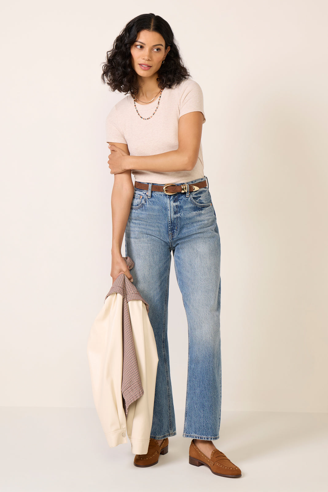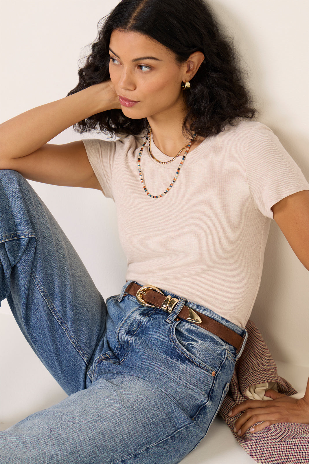 This versatile tee by LNA is the perfect wardrobe essential. crafted in soft rib knit fabric with a crew neckline. slim fit. and short sleeves.