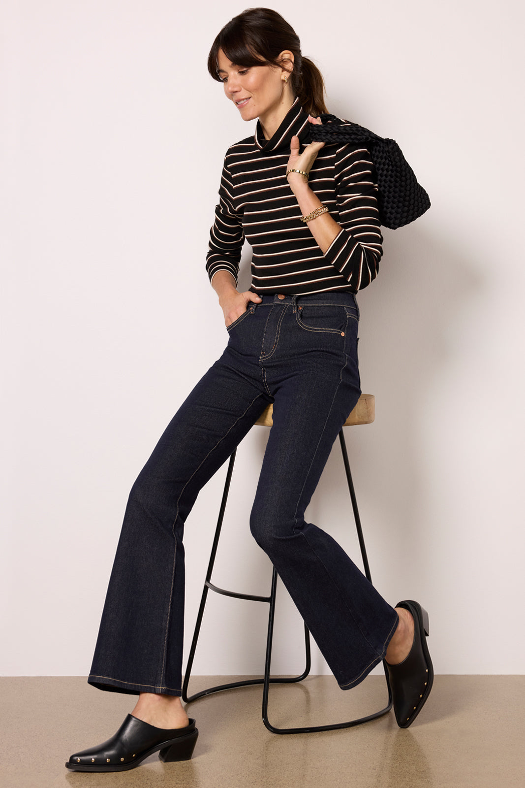 Flared and flattering. these EVEREVE jeans are a chic addition to your denim collection. featuring a high-rise waist. full-length hems. and dark rinse wash for day-to-night wear.