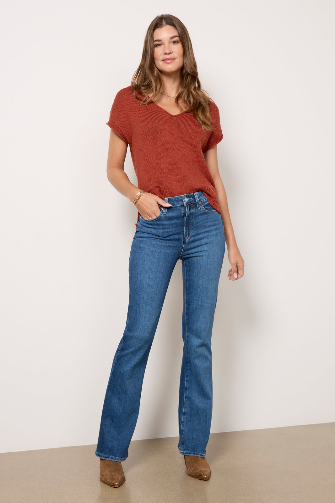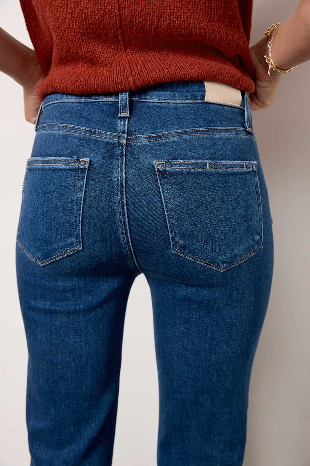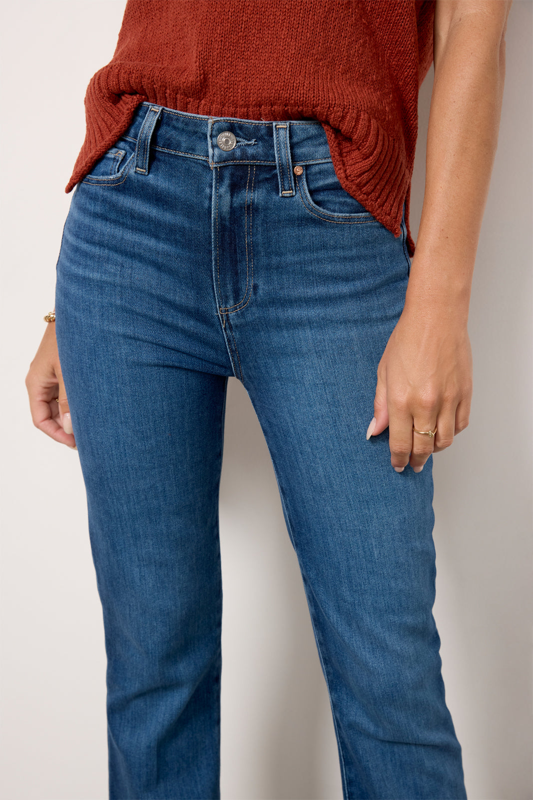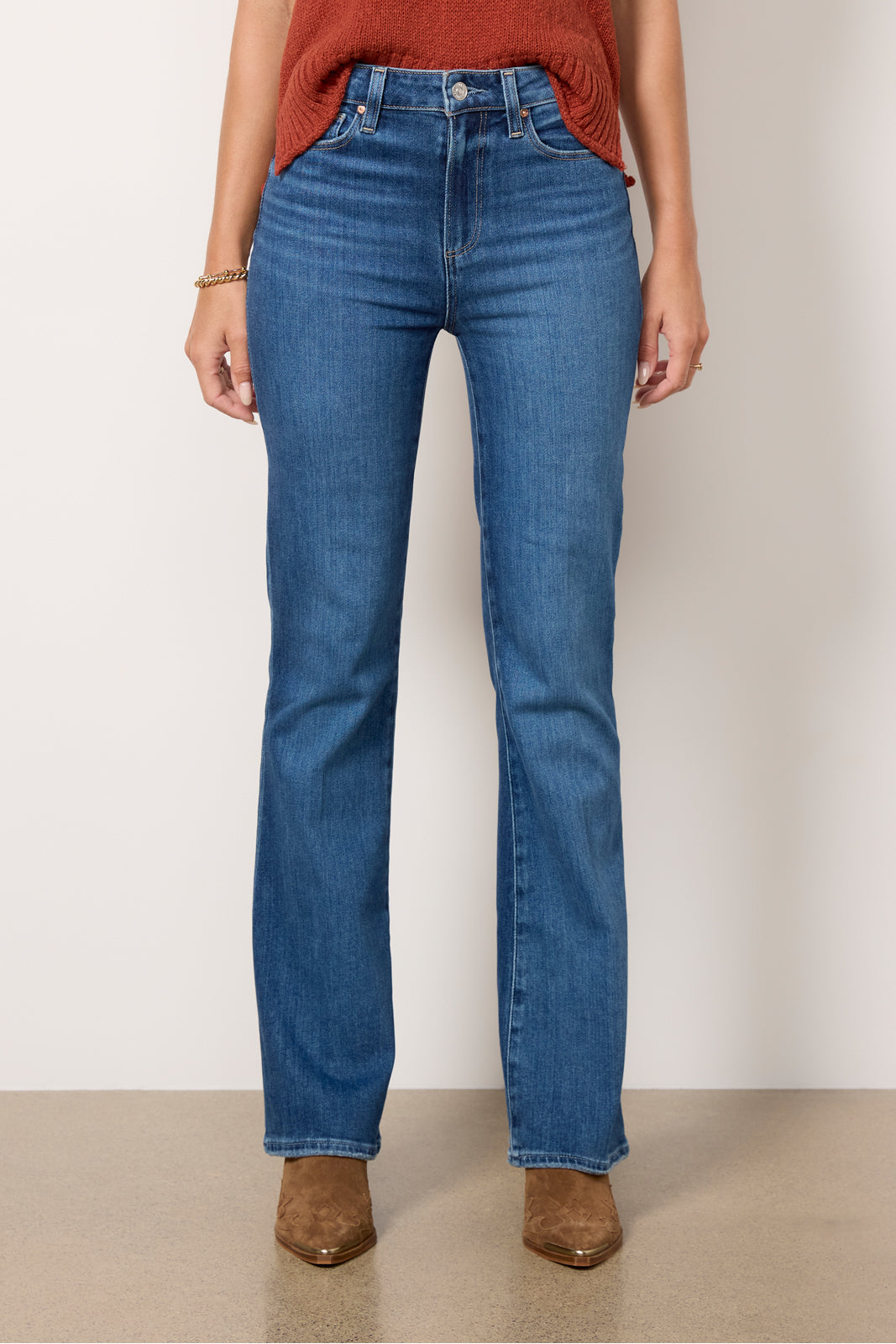 Elevate your denim collection with these flattering bootcut jeans by Paige. Crafted in a soft cotton blend for a vintage feel. the Laurel Canyon jeans feature a high-rise fit. medium blue wash. and elongating 32" inseam.