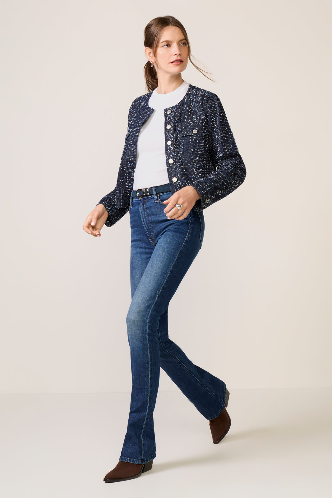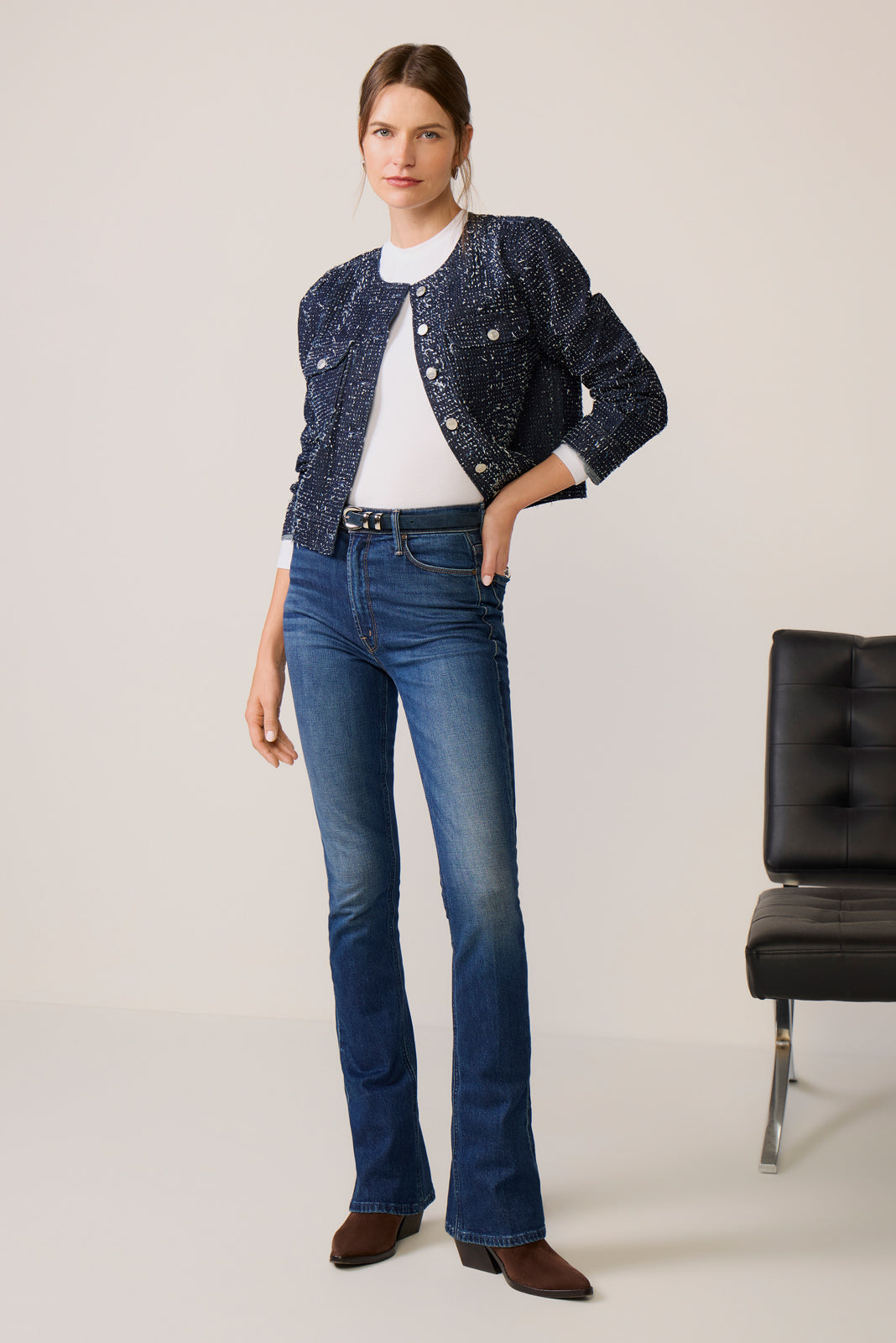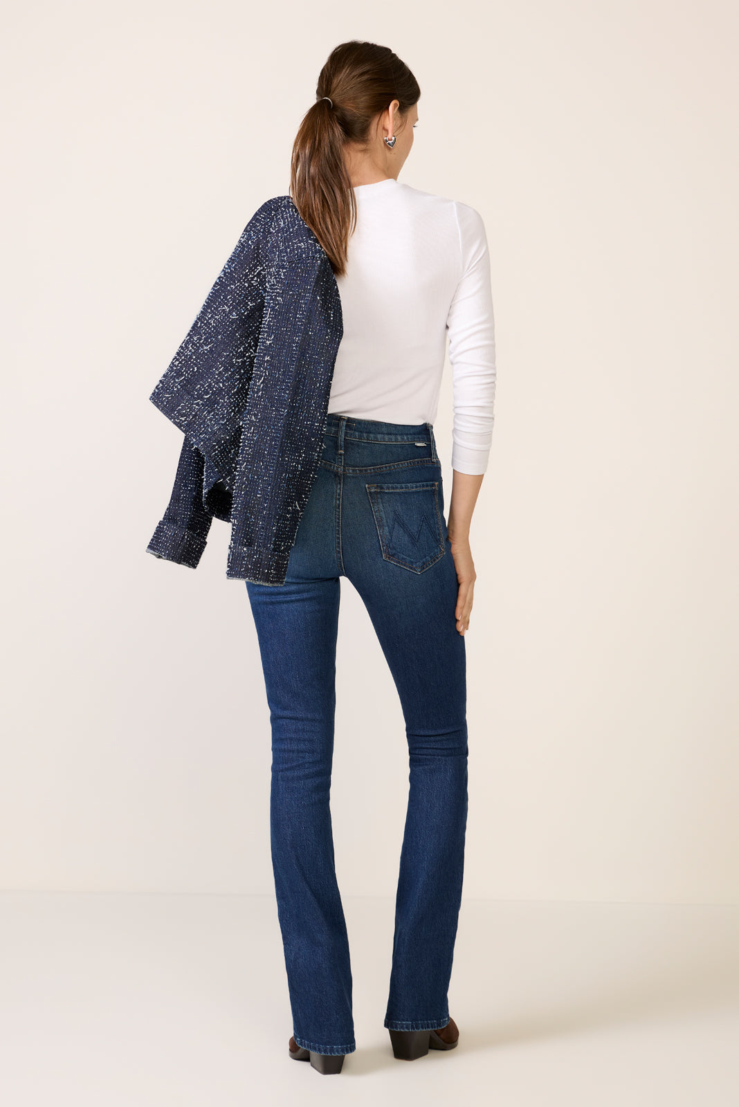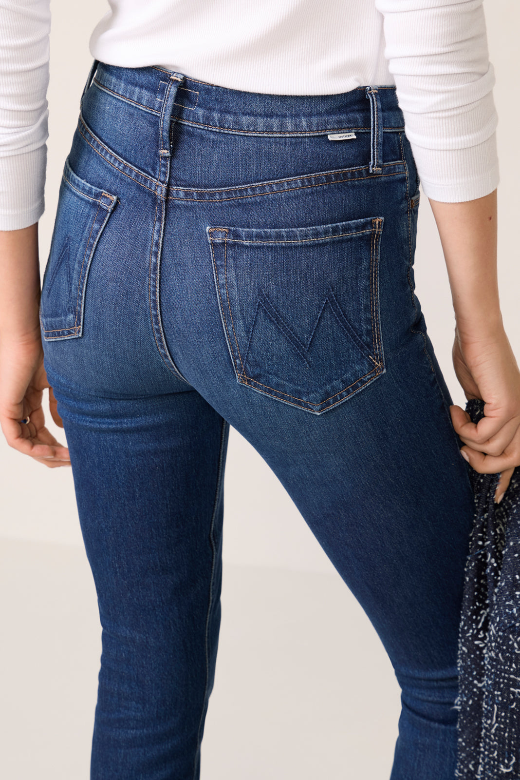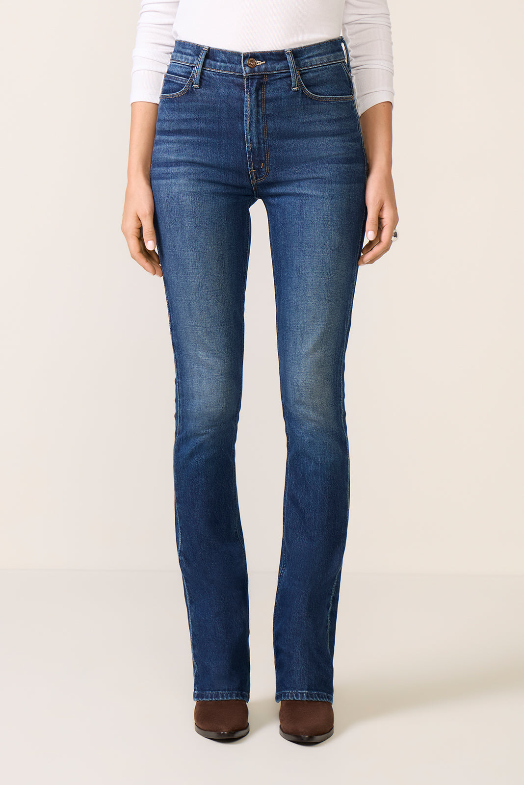 Perfect for dressing up or down. these flattering flared jeans by MOTHER are finished in a faded dark blue wash with a high-rise fit and long 34" inseam.