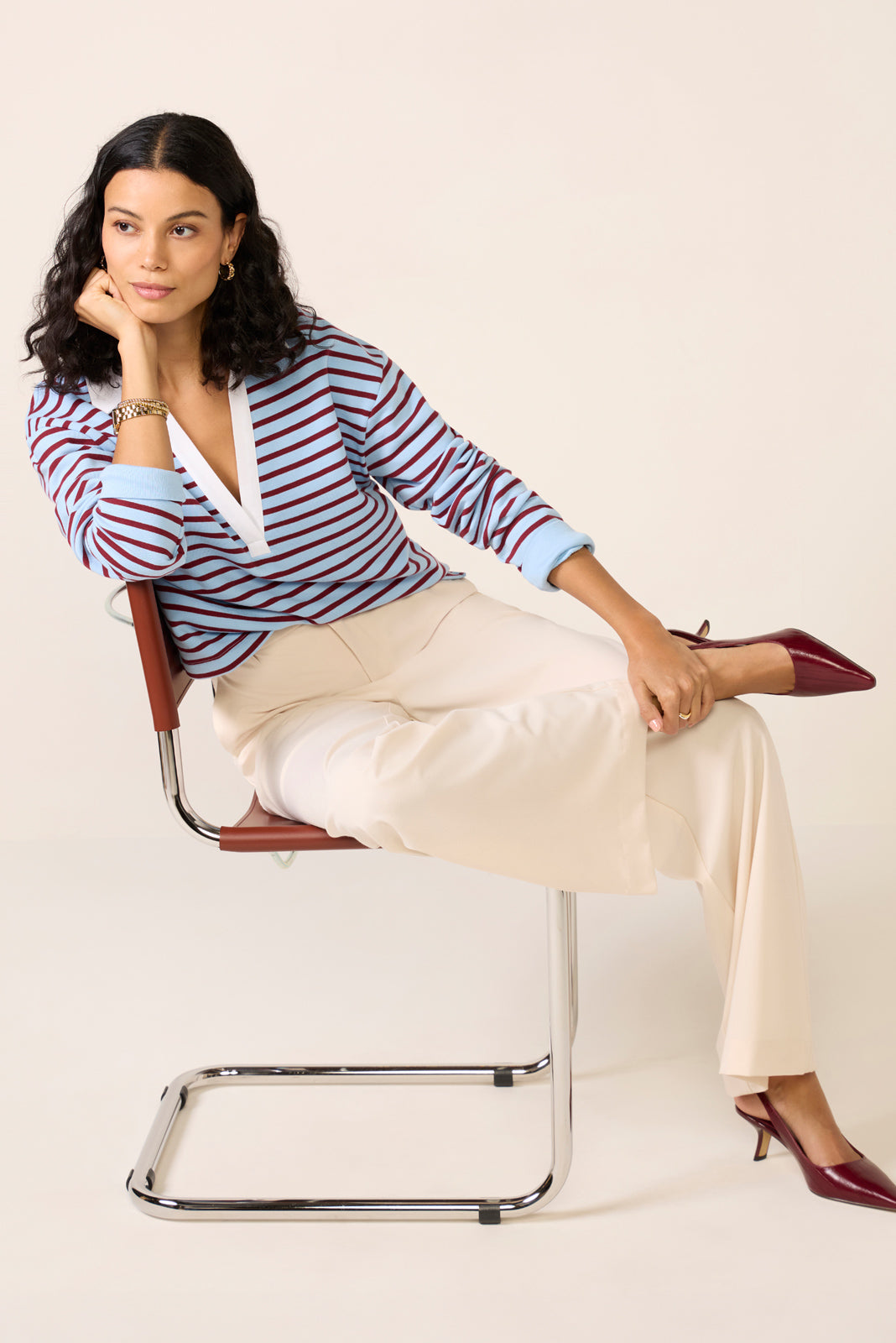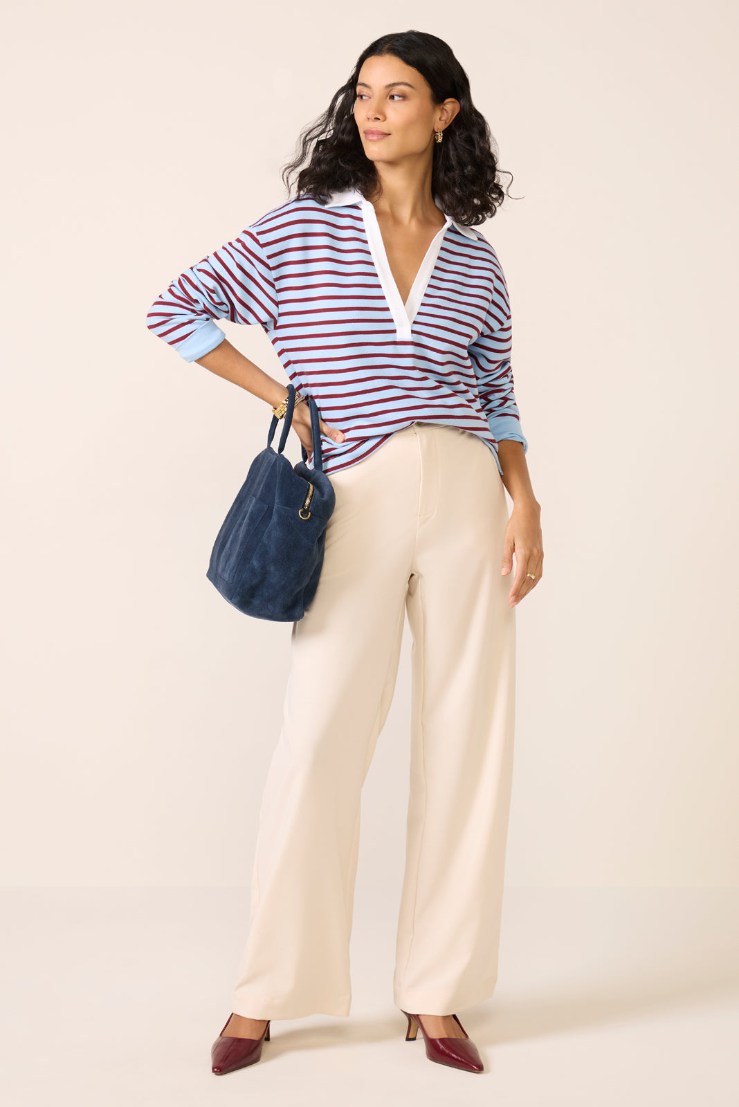 Give your wardrobe a collegiate-inspired edge with this striped rugby sweatshirt by EVEREVE. This sporty-chic pullover is crafted from comfortable cotton French terry and features a relaxed fit. long sleeves. and a deep v-neckline with a polo collar.
