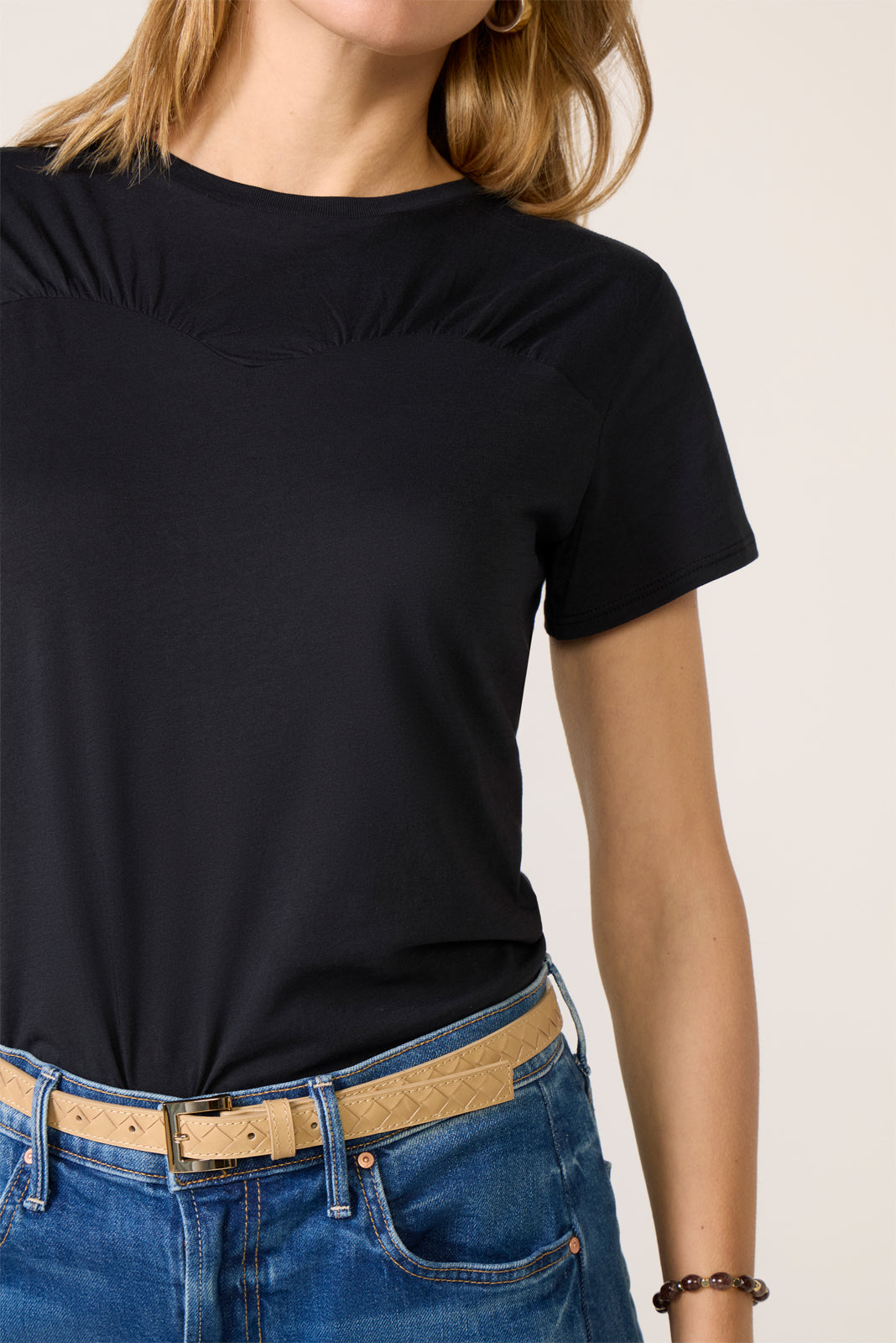 A shirred neckline elevates this stylish crewneck tee by Rails. featuring soft organic Pima cotton and short sleeves—perfect for day-to-night wear.