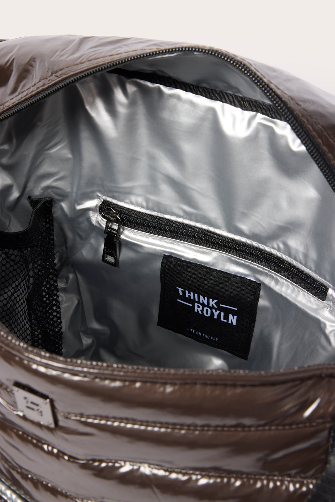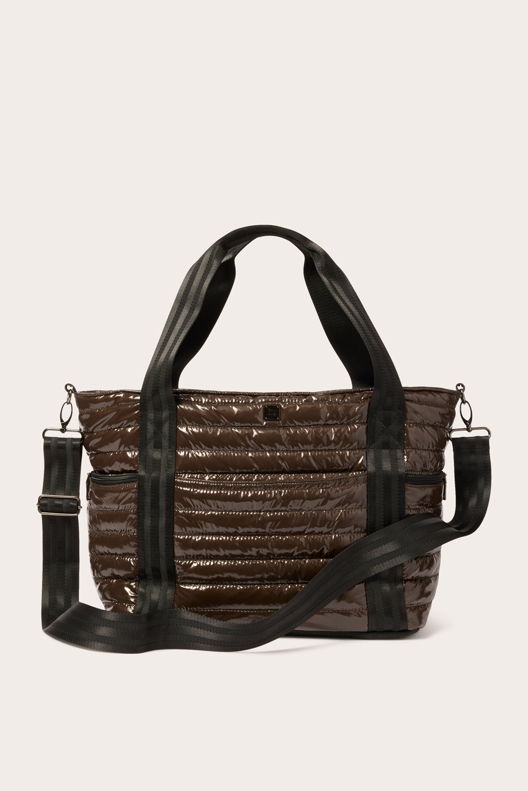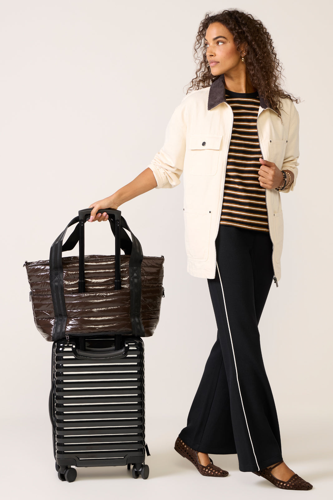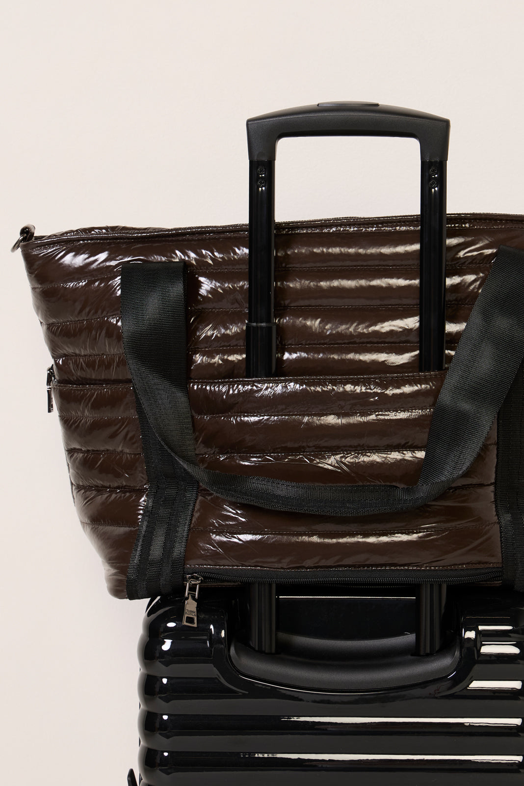 Travel in style with this go-everywhere tote by Think Royln. Finished in glossy quilting. the Jetset Wingman Tote features a zip-top design with an interior zipper pocket. exterior side zipper pockets. and an exterior trolley slip pocket to attach to your suitcase handles. Carry it on the shoulder. or go hands-free with the detachable. adjustable crossbody strap.
