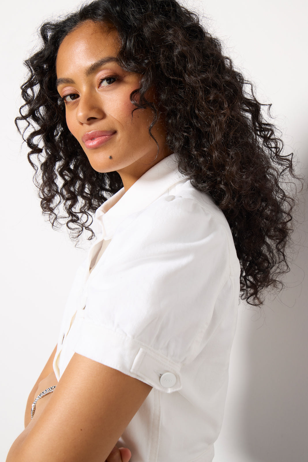 A fun and feminine take on your classic denim jacket. the Kendra Jacket by Paige is finished in a bright white wash and features a cropped silhouette with a front button closure. wide waistband. and short puff sleeves. Layer with any look from cargo pants to wide leg jeans.