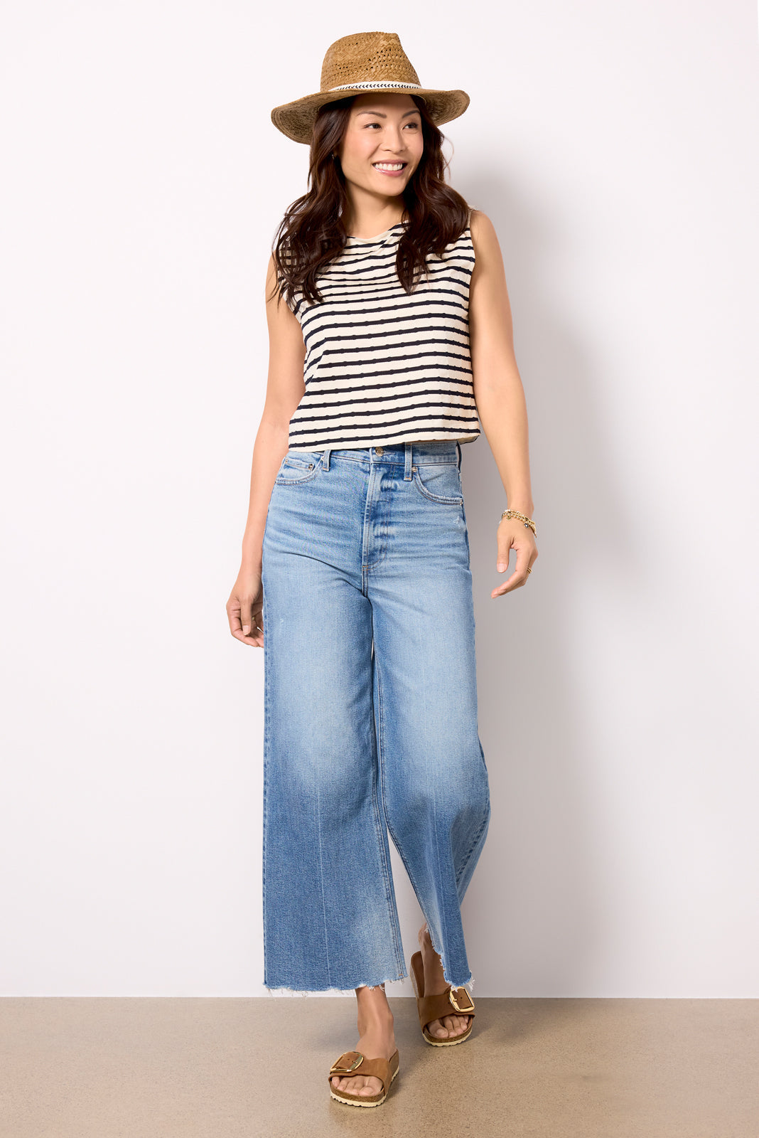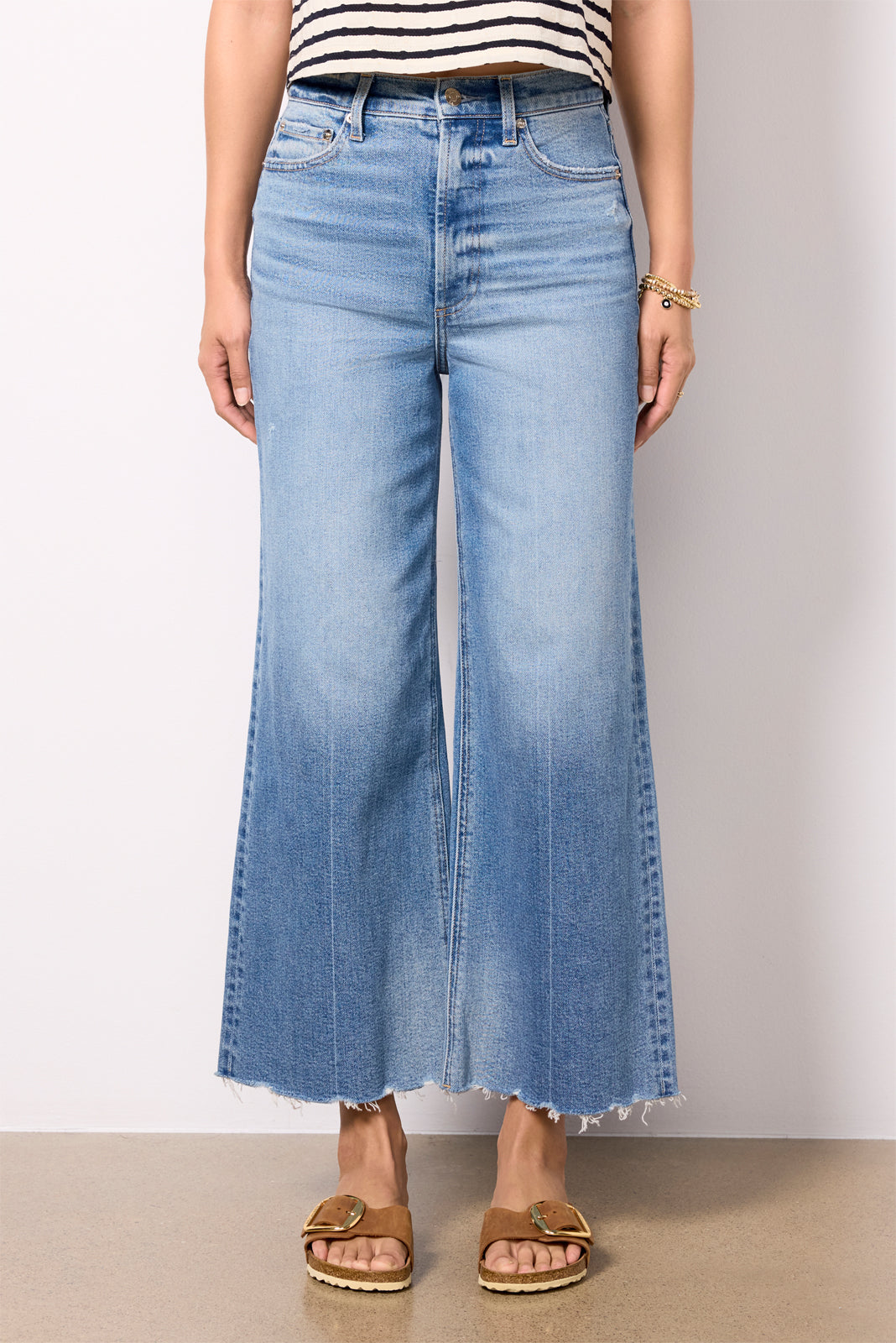 Finished in a versatile blue wash. the Lana jean by Pistola features a wide leg silhouette with a high-rise fit and raw hems cropped at the ankle. The soft cotton denim has a hint of stretch. making them perfect for day-to-night wear.