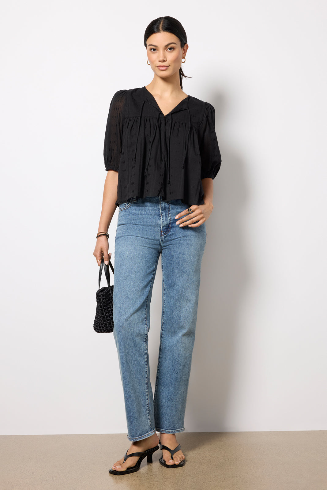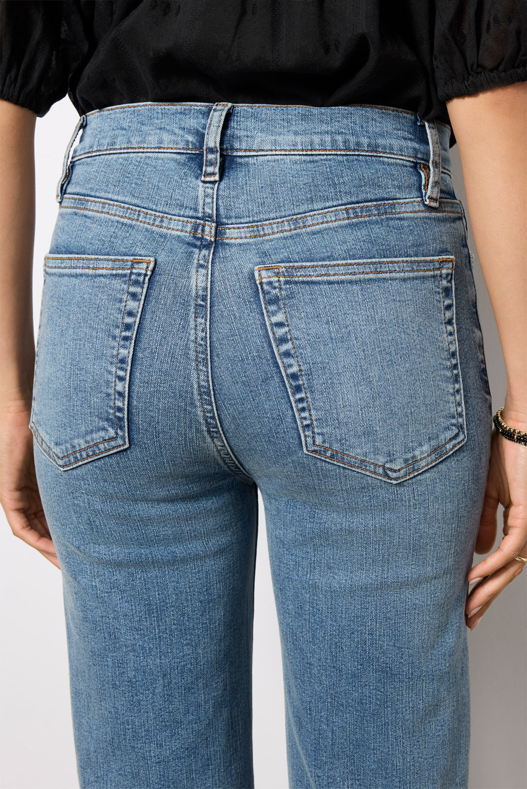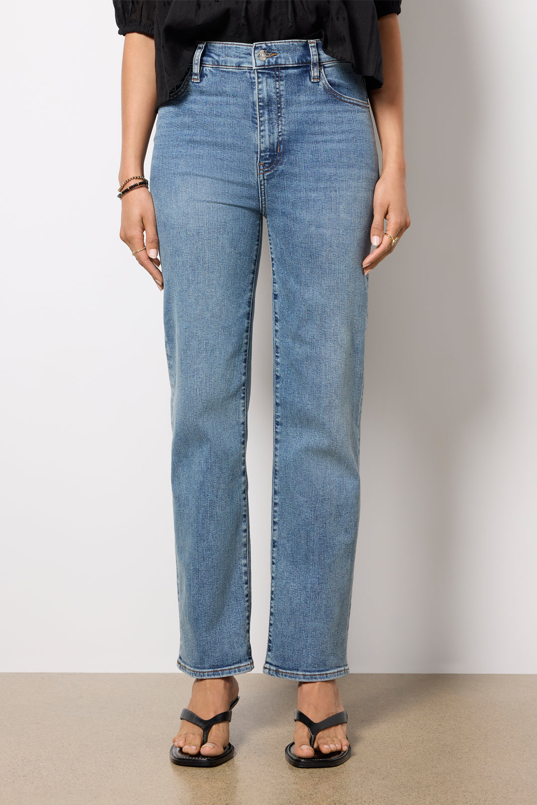 Perfect for wearing day or night. these versatile straight leg jeans by FRAME are crafted from sustainable comfort-stretch denim and feature a flattering high-rise fit. medium blue wash. and clean hems.