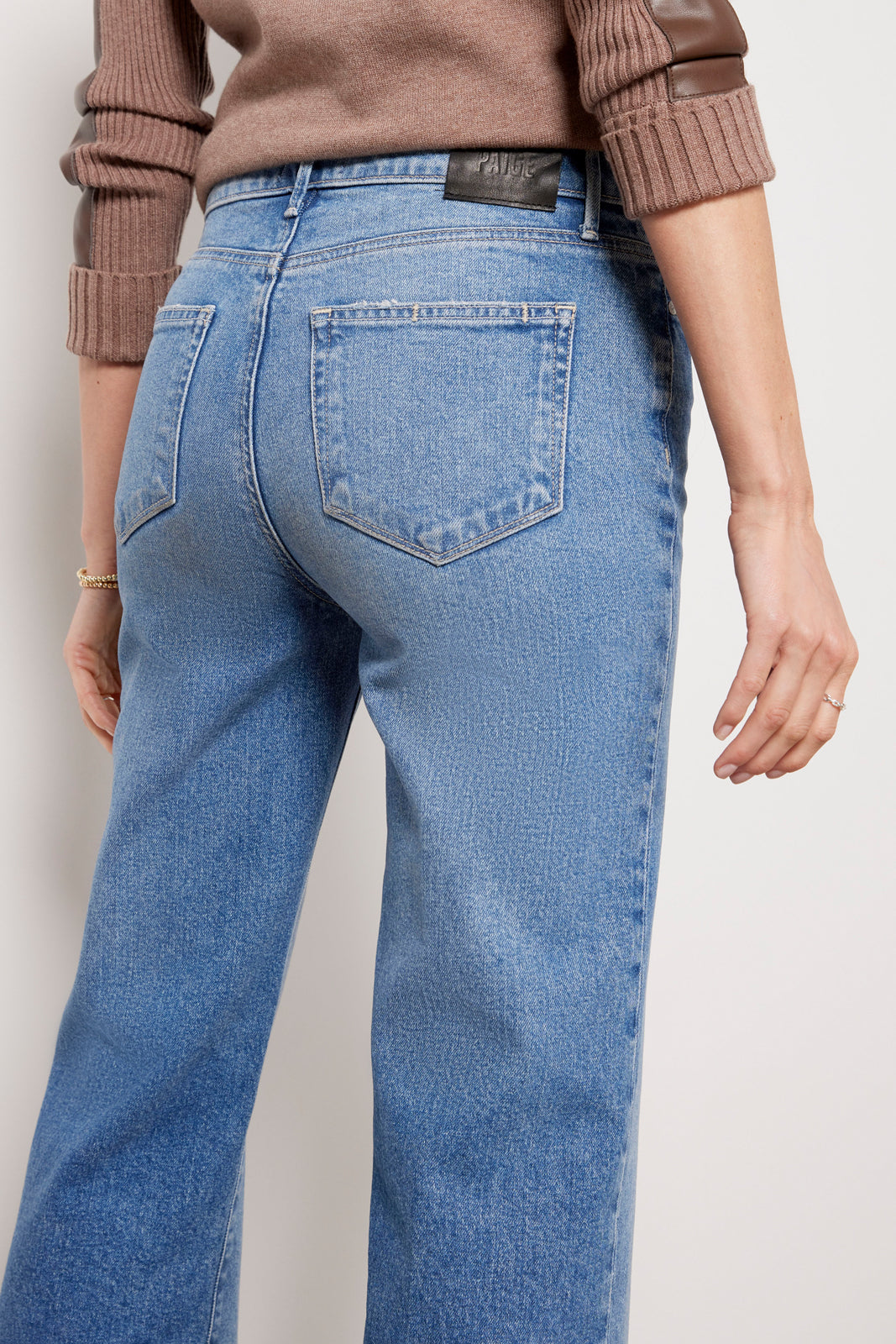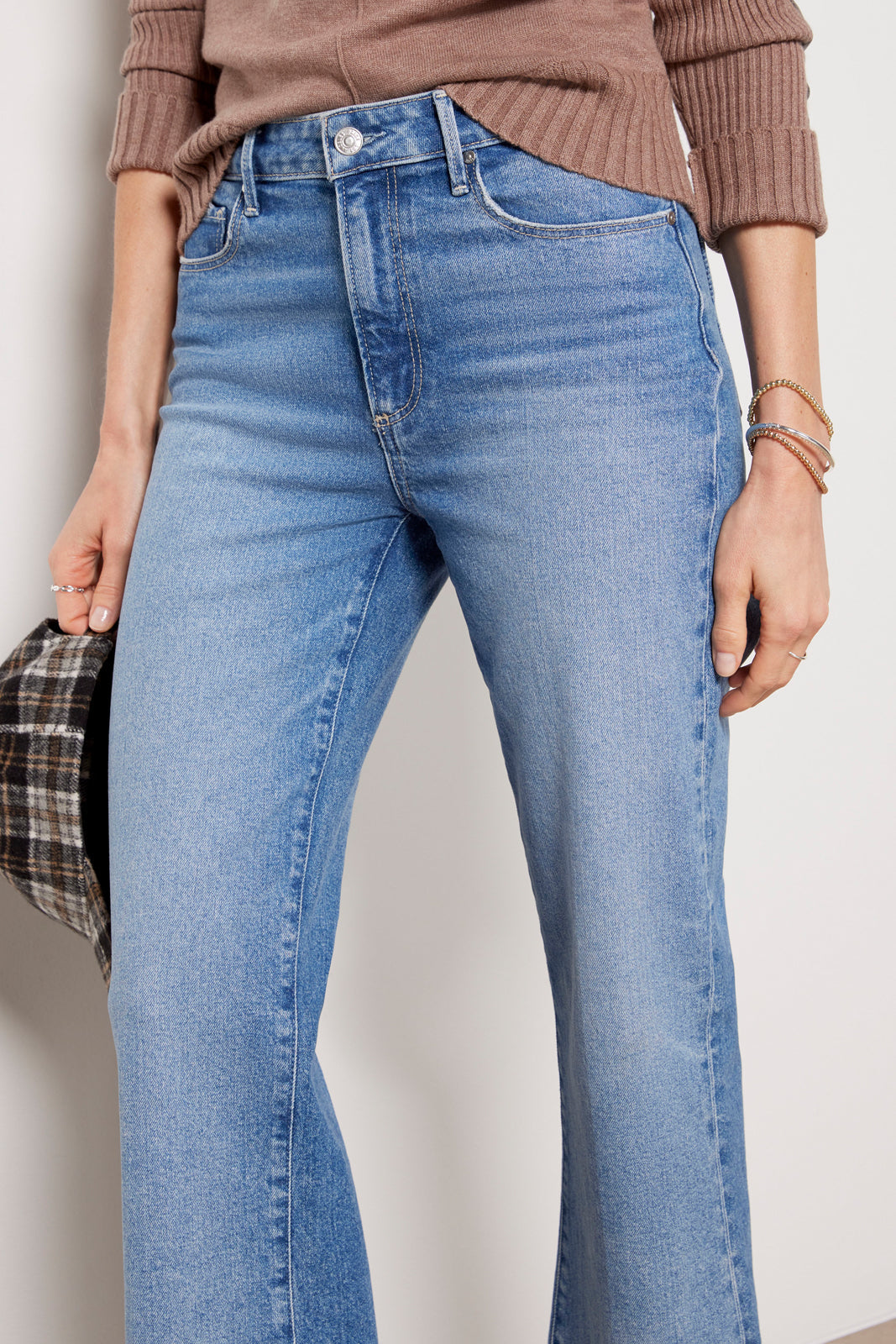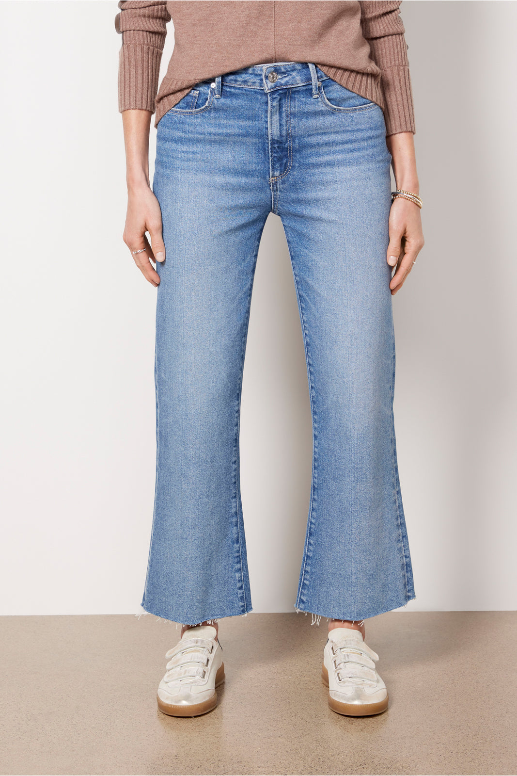These wide leg jeans by Paige are the perfect addition to your denim collection. featuring a medium blue wash and ankle-length raw hems. The cotton-blend denim gives them a soft. vintage feel you'll reach for again and again.