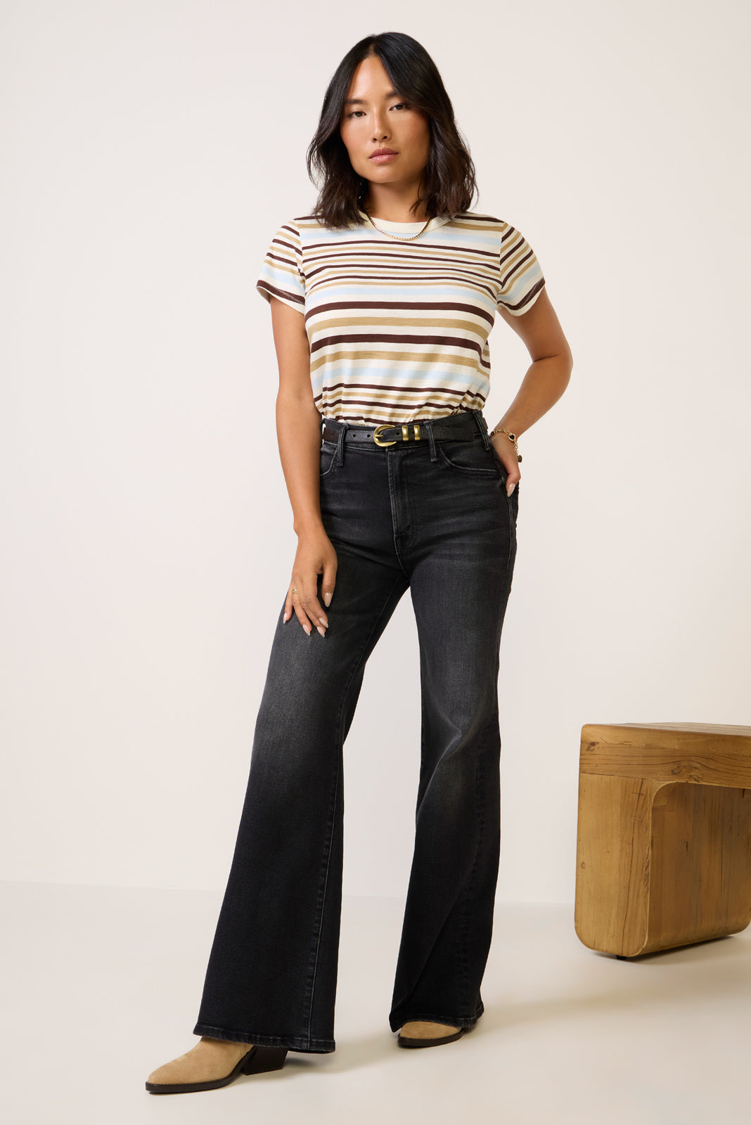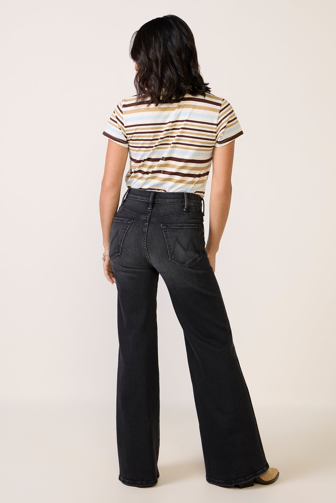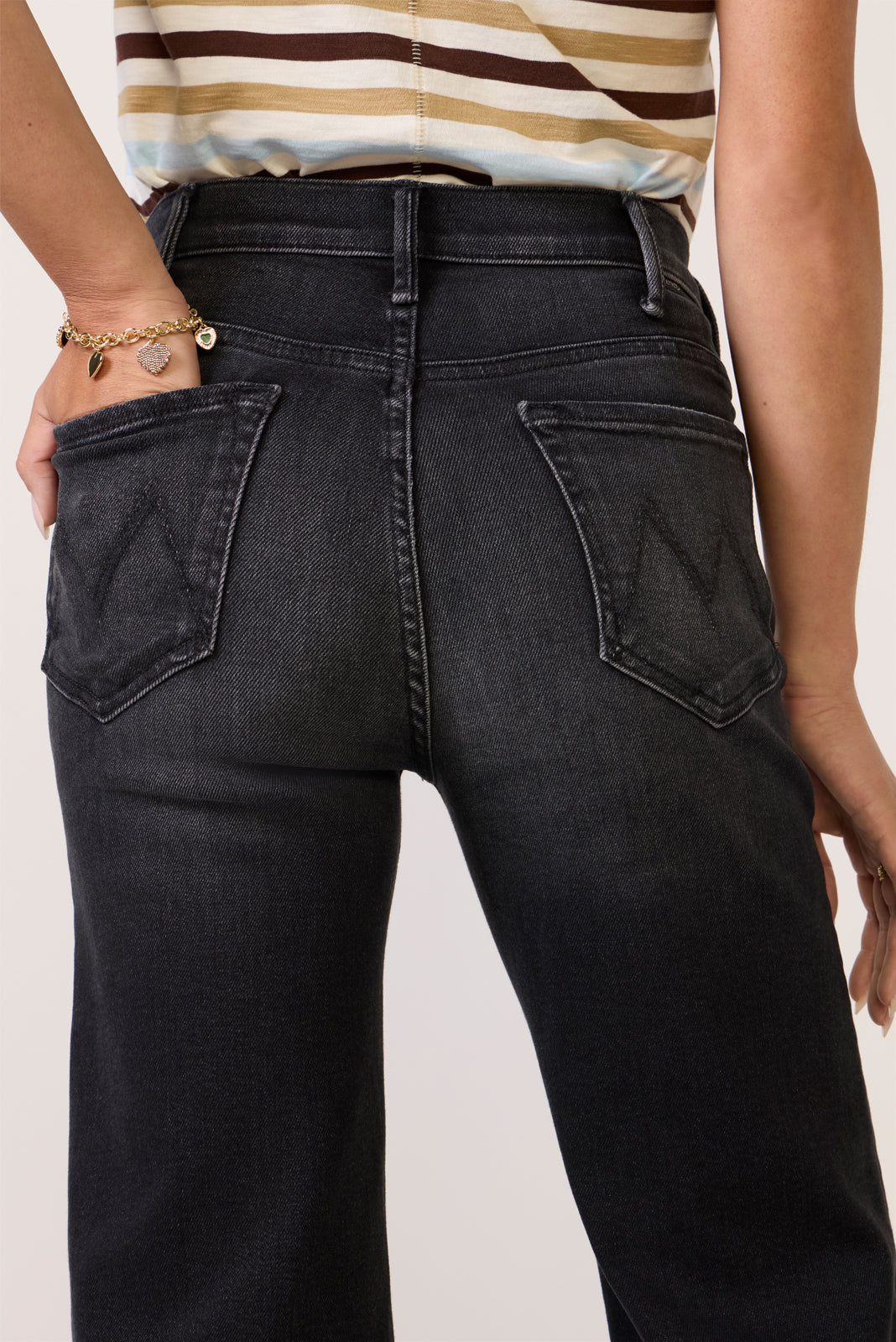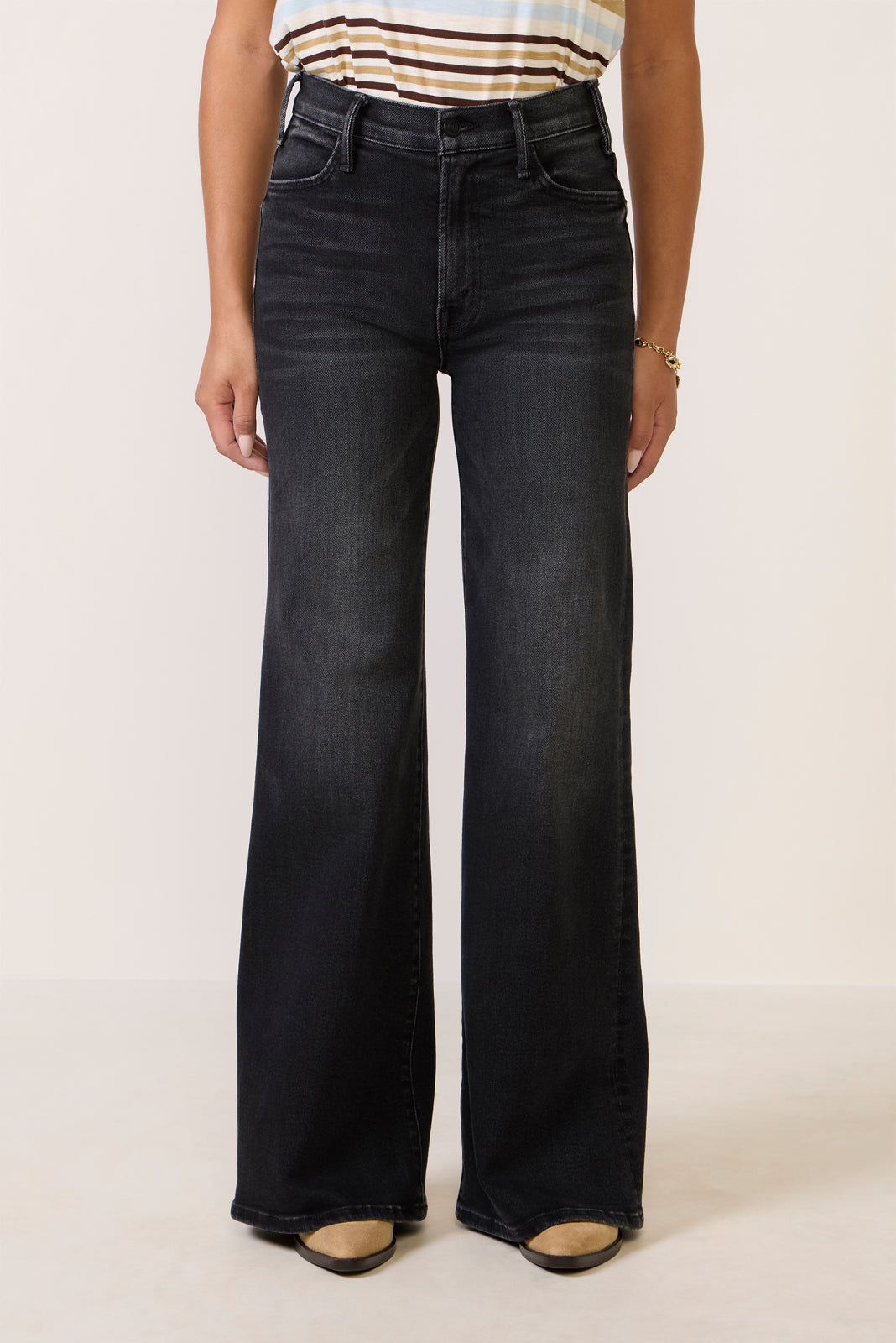 The Lil Hustler Roller Sneak jean by MOTHER is a petite wide leg jean. featuring a '70s-inspired silhouette with full-length hems and a faded black wash. Designed to complement petite body types. these jeans feature a higher knee placement. shorter inseam. and shorter rise for a perfect. always-flattering fit.