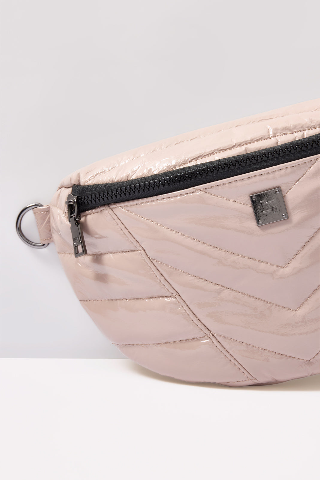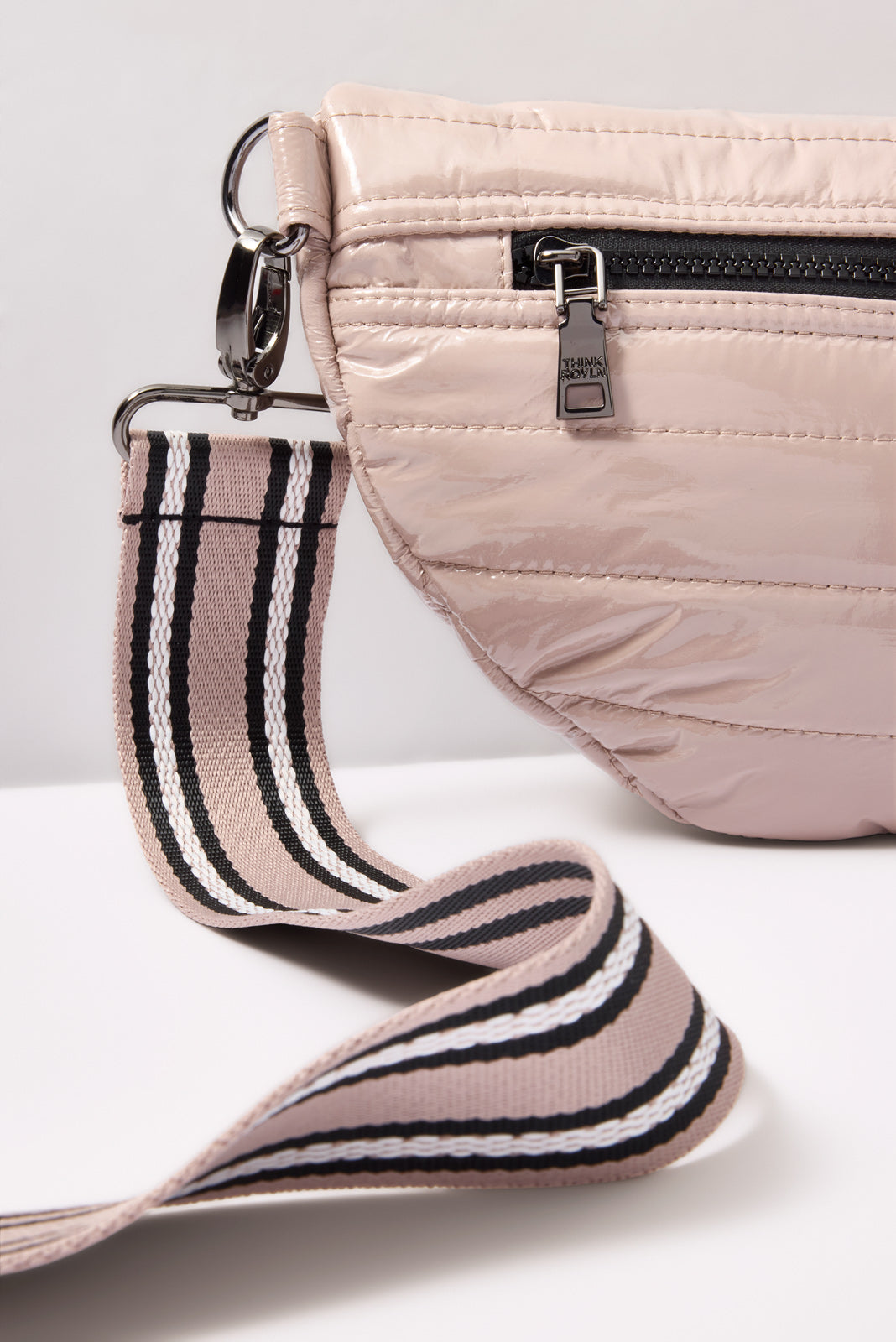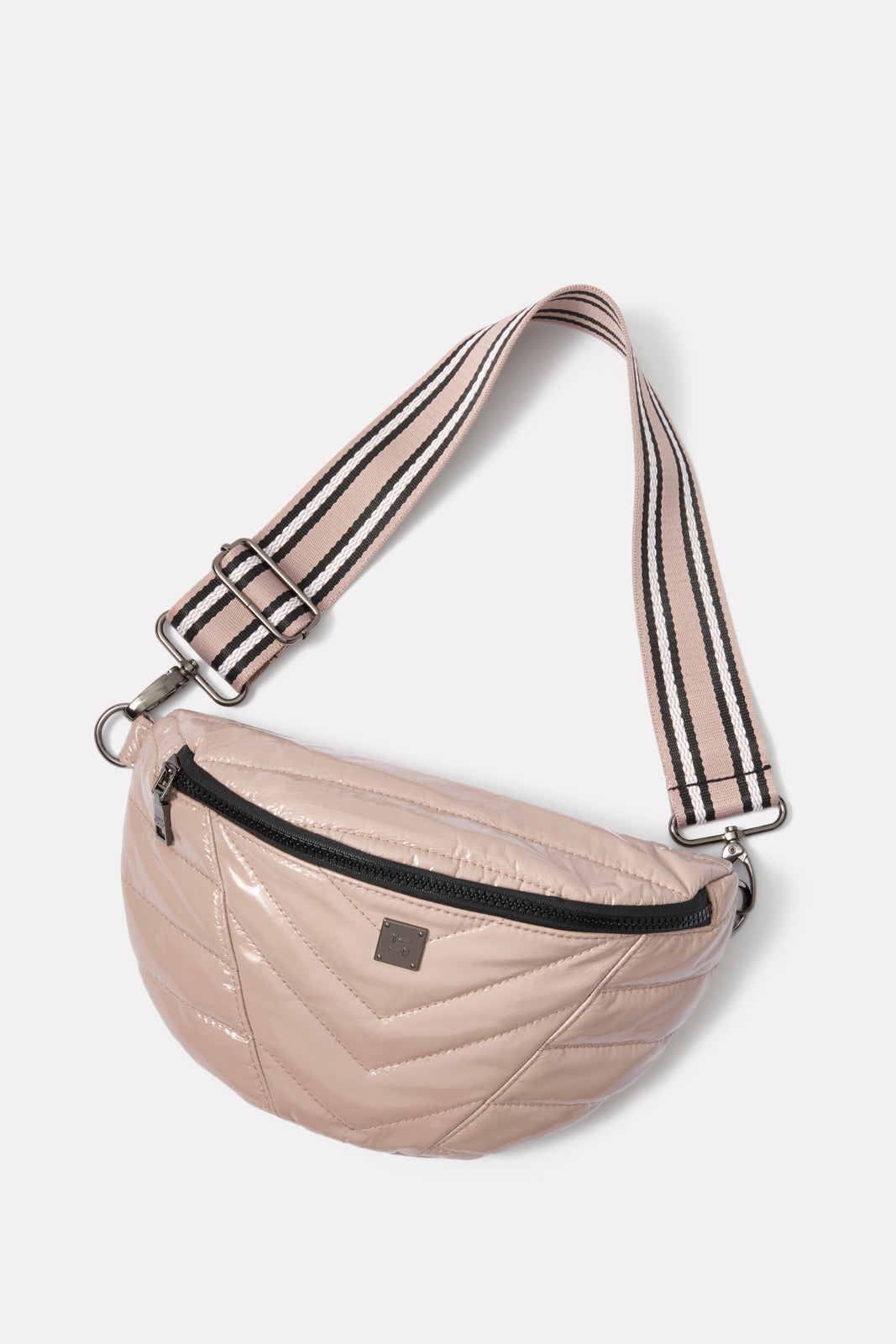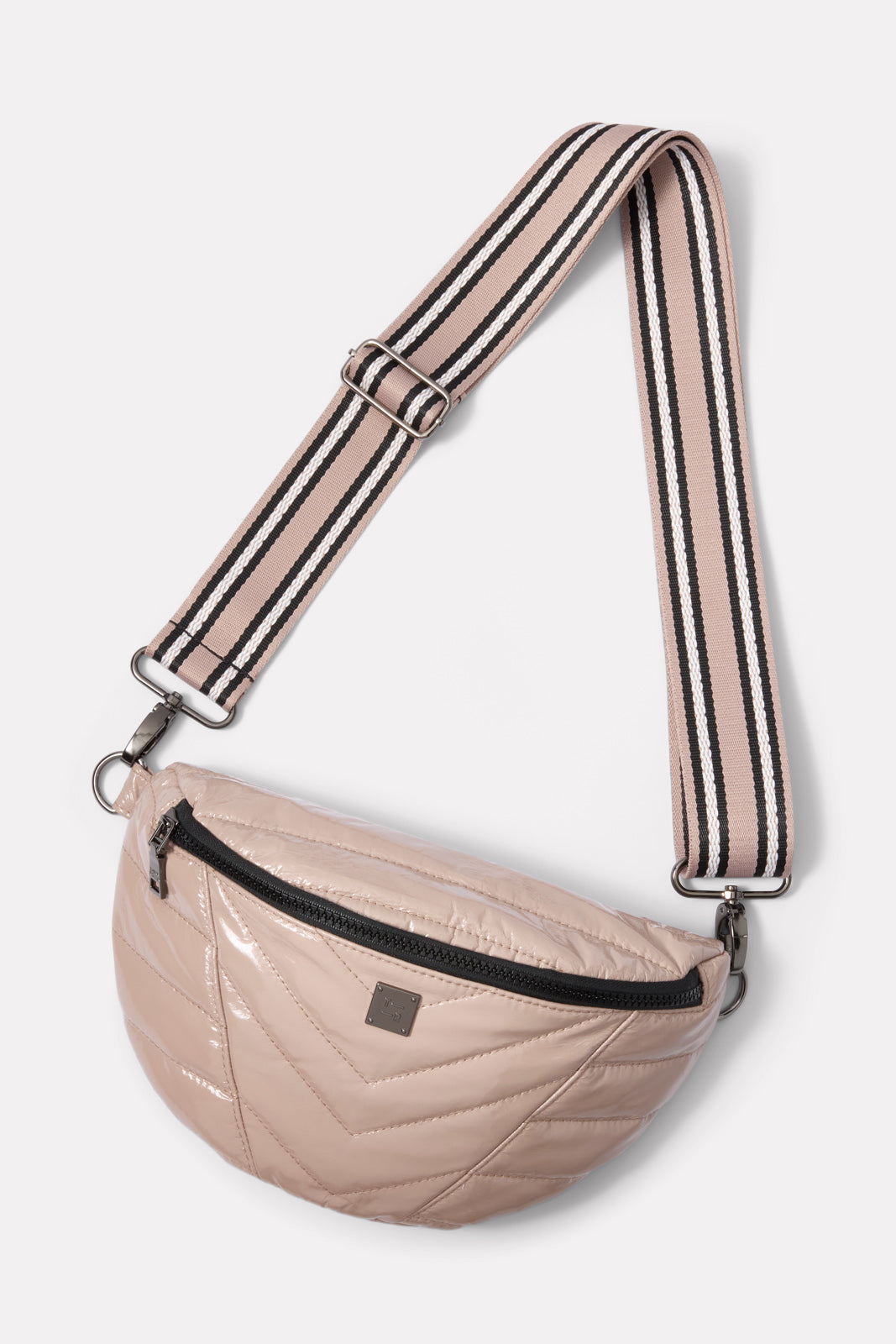 The Little Runaway bag by Think Royln features a chic quilted design with a front zipper closure. back zipper pocket. and two adjustable. detachable crossbody straps.