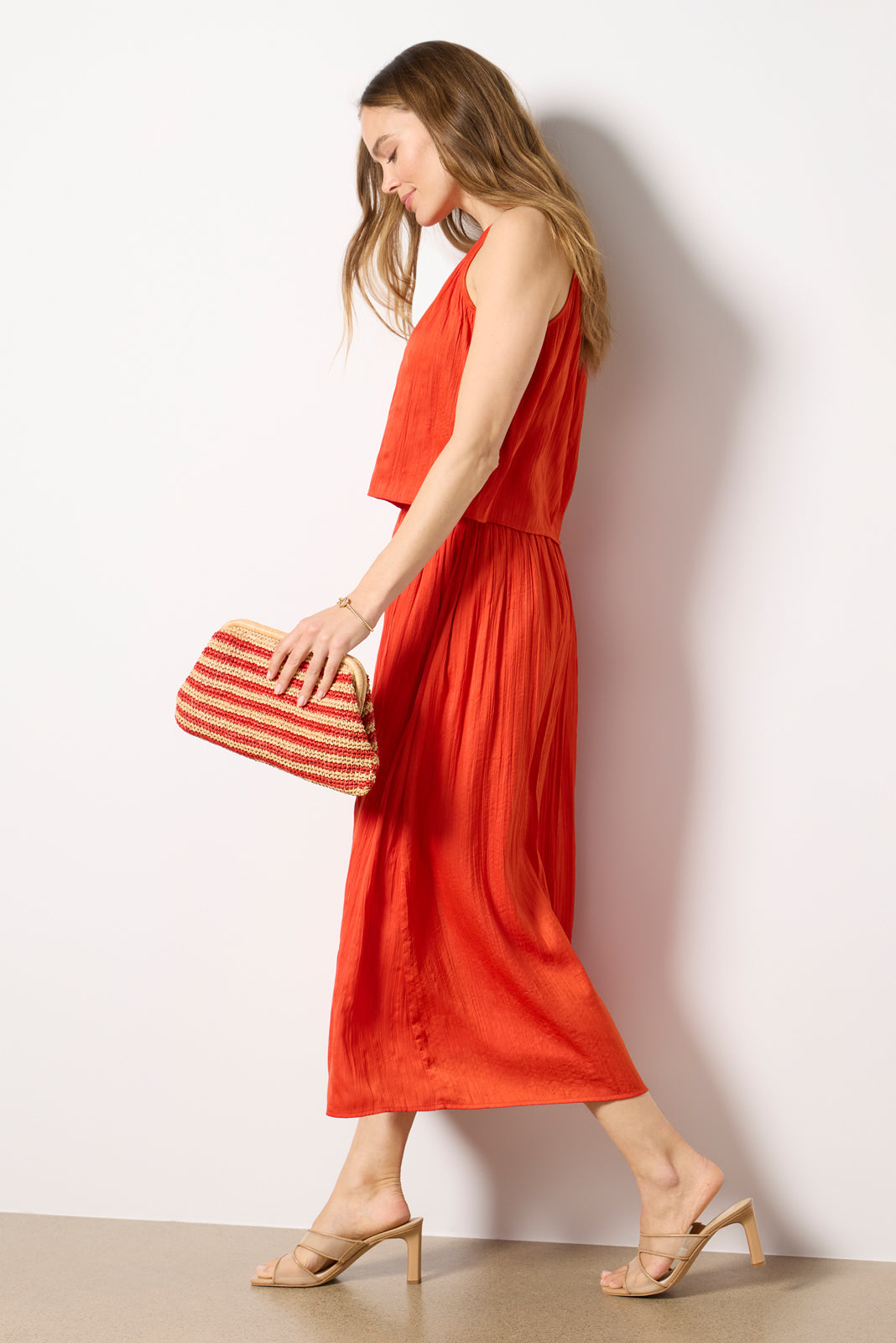 This gorgeous satin tank by Z Supply will instantly elevate your summer wardrobe. featuring a swingy cropped silhouette with a back keyhole button closure. Make it a two-piece set with the matching Sunset Satin Pant or Claire Satin Midi Skirt.