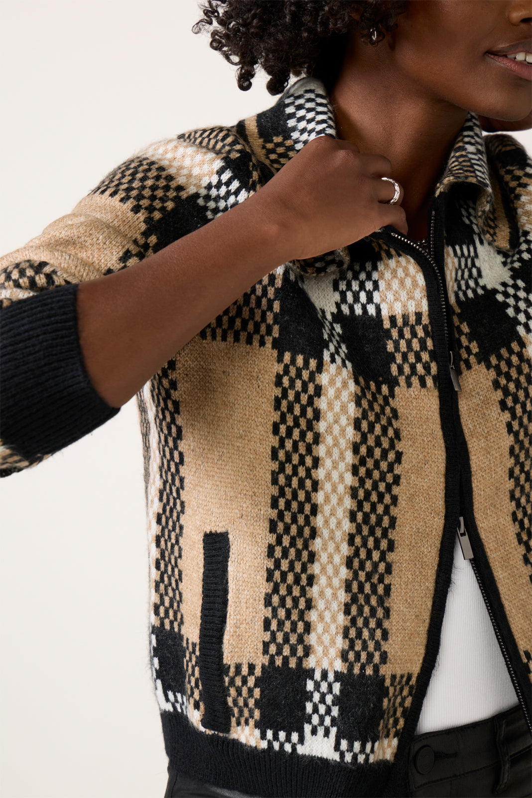 Finished in a chic plaid pattern. this cardigan sweater by EVEREVE is the perfect pick for fall. featuring a cropped silhouette with a two-way zipper. collared neckline. and side pockets.