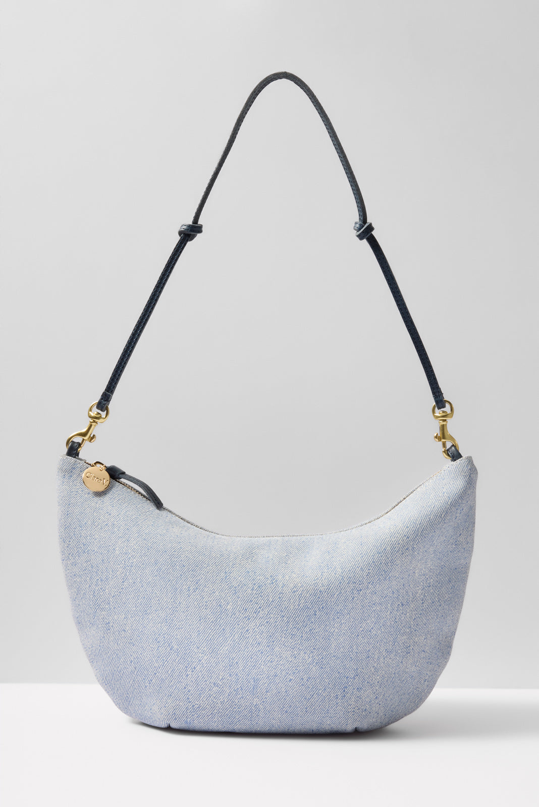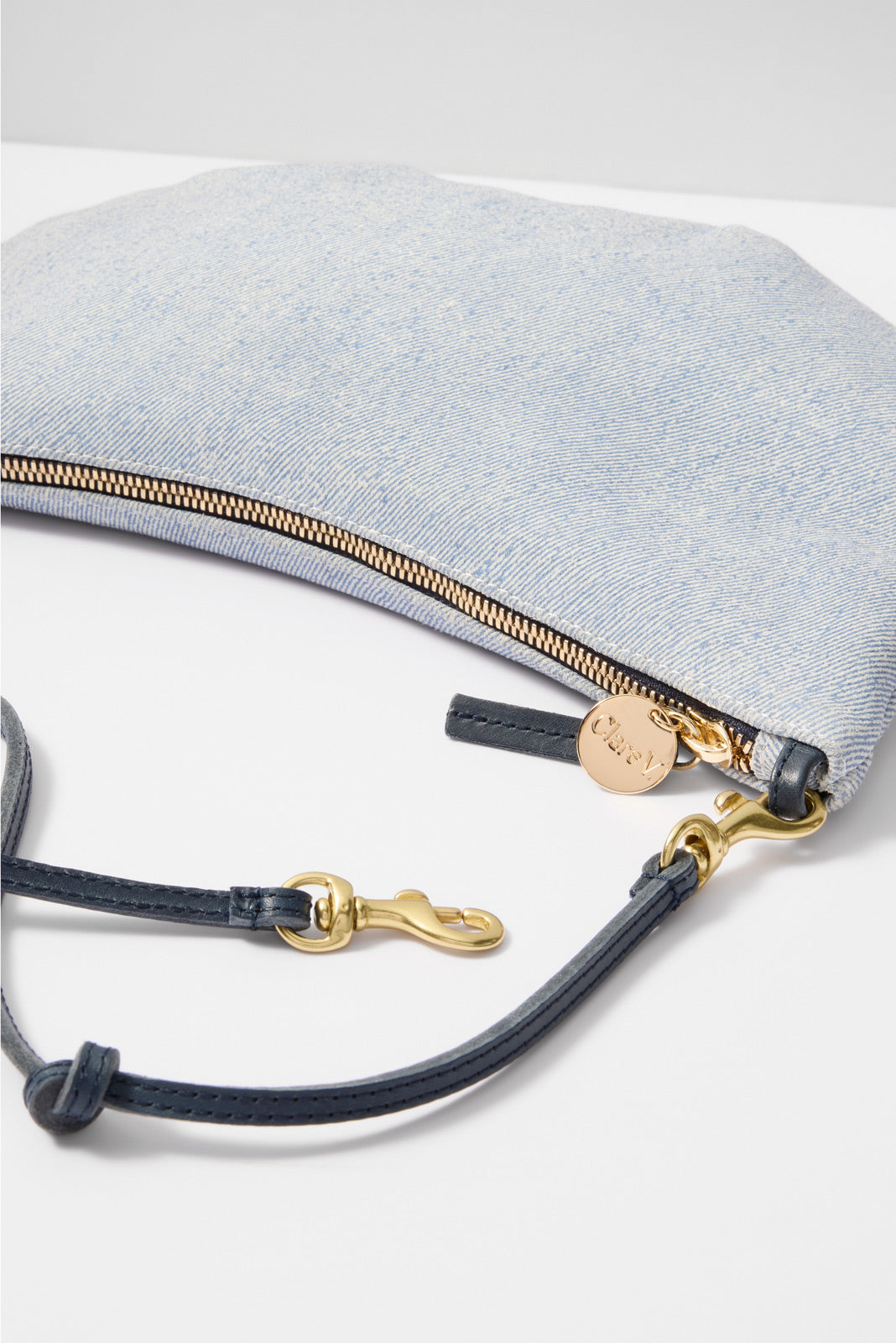 Crafted in a gorgeous suede material made to look like denim. the Lune Bag by Clare V features a top zipper design. a removable navy leather strap. and a chambray lining.