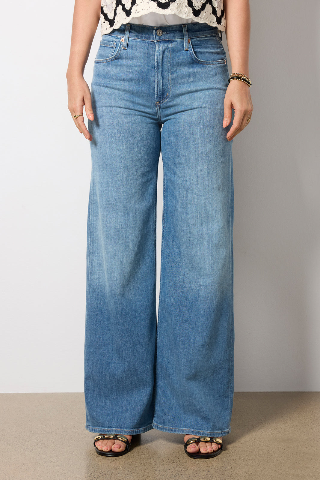 A relaxed fit and longer inseam define these stylish wide-leg jeans by Citizens of Humanity. Crafted in soft cotton-blend denim. the Lyra jean features a high-rise waist. light blue wash. and full-length clean hems.