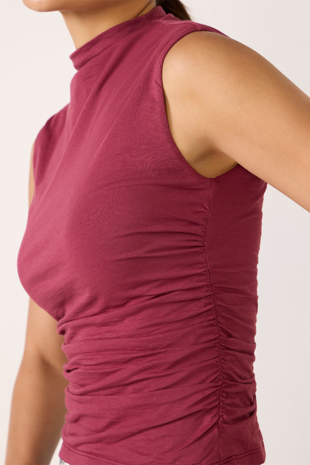 Crafted in a soft and stretchy cotton fabric. the Madeline Top by Velvet was designed to flatter. This tank features a mock neckline. flattering ruching on the sides. and a fitted silhouette.