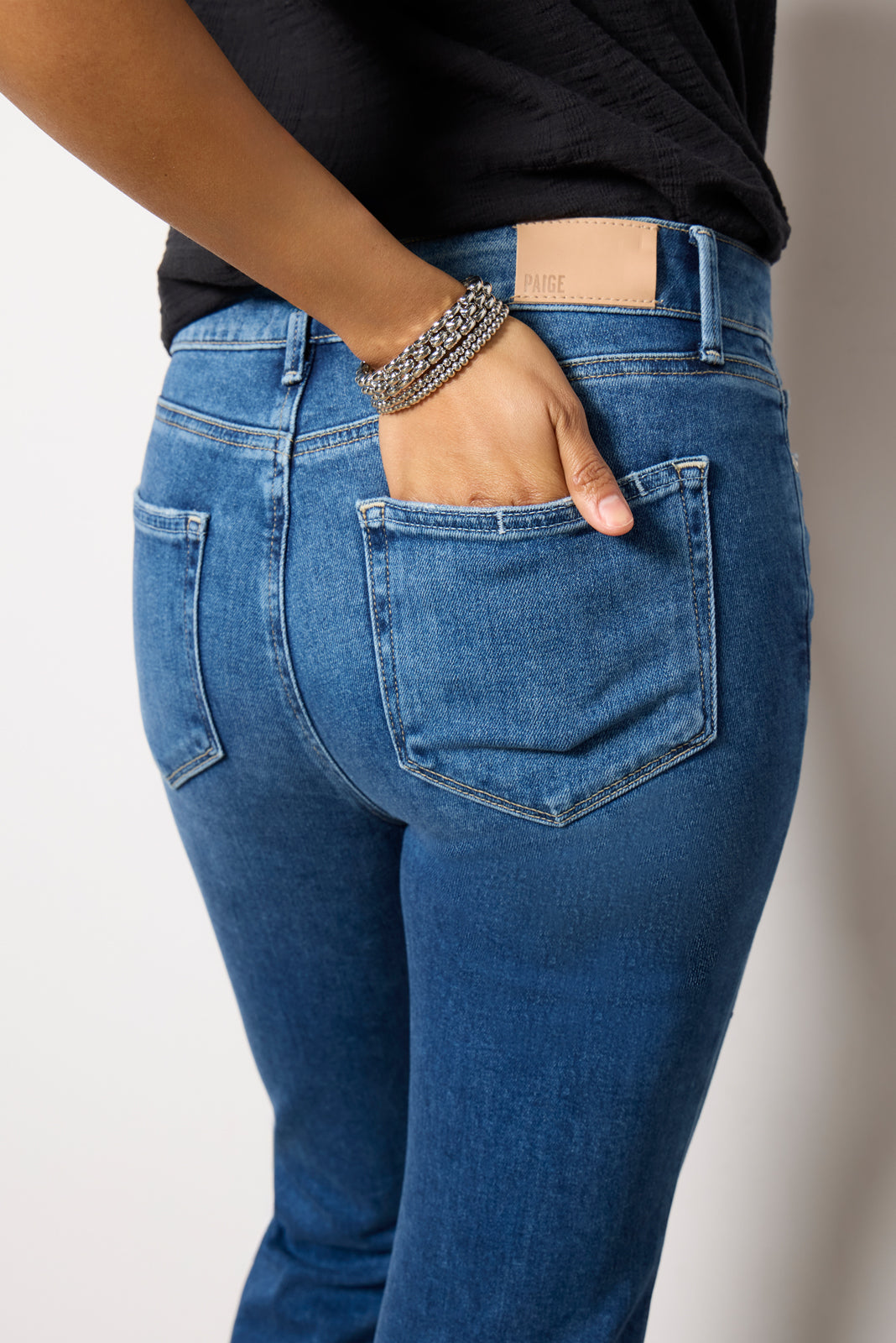 The Manhattan bootcut jean by Paige features a flattering silhouette that's fitted through the hips and thighs with an elongating full-length leg. The soft stretch denim and faded blue wash make them perfect for day-to-night wear.