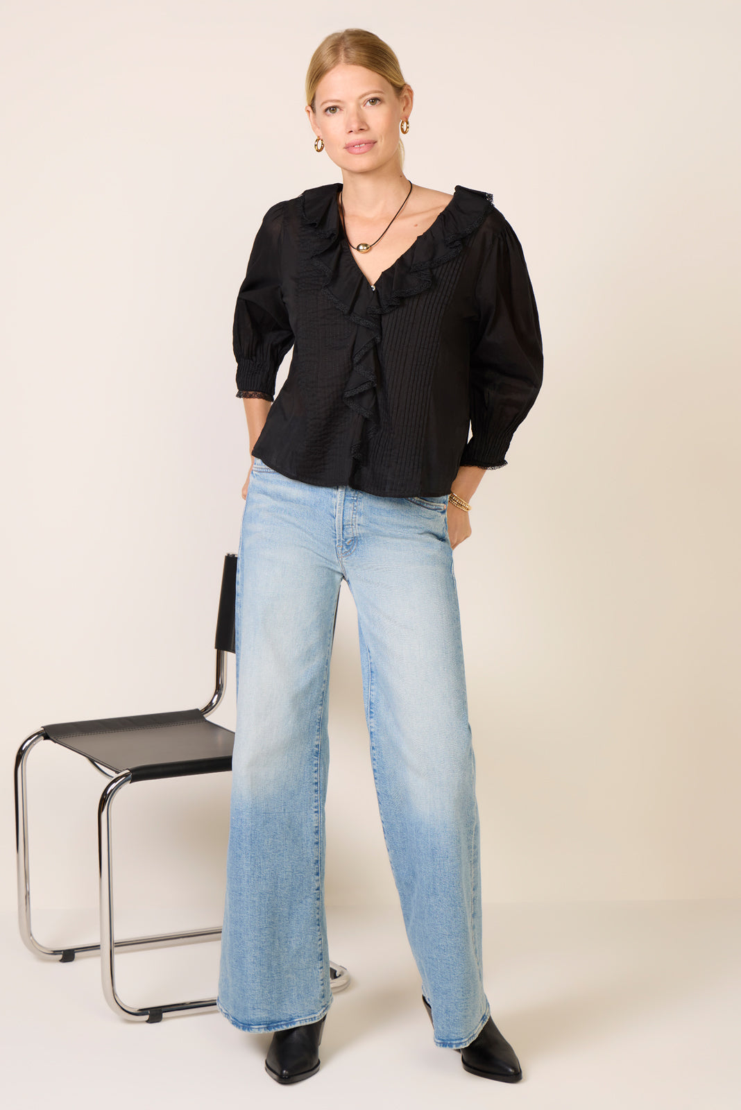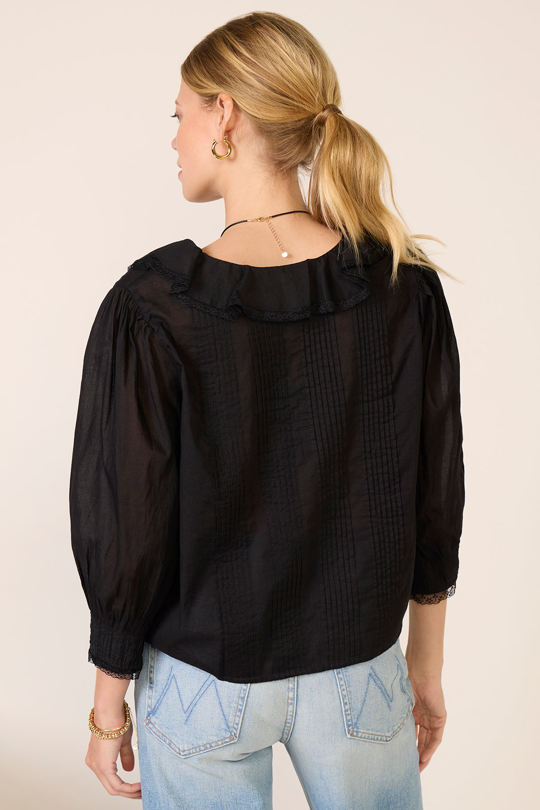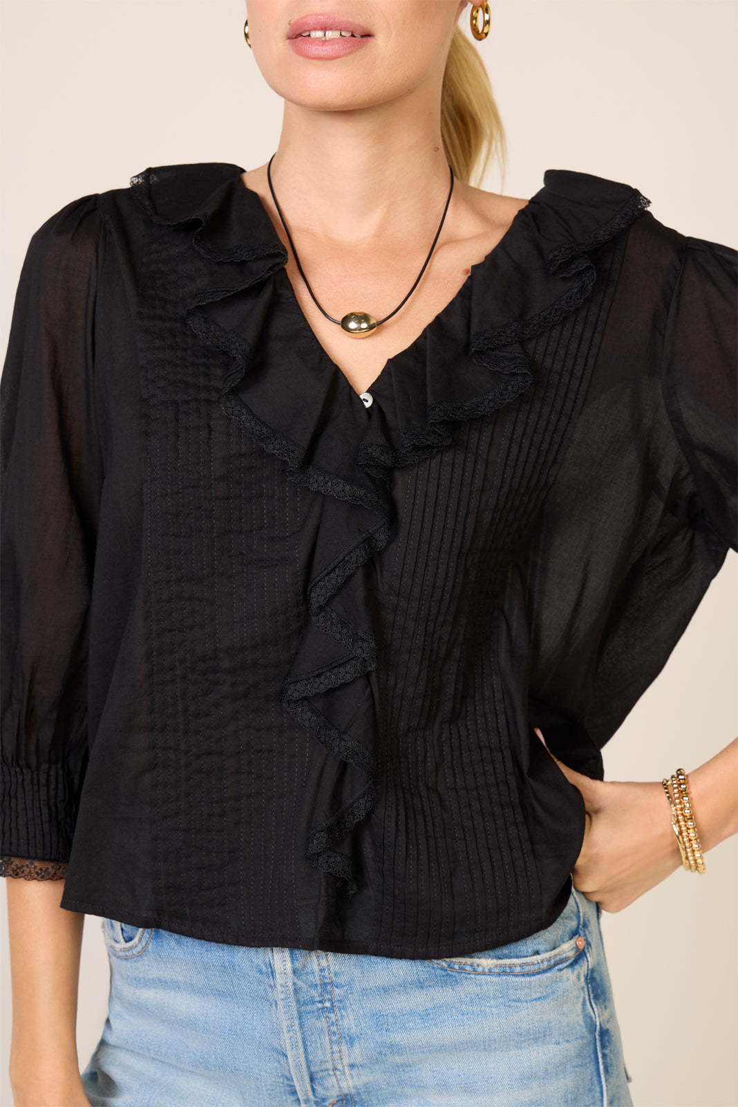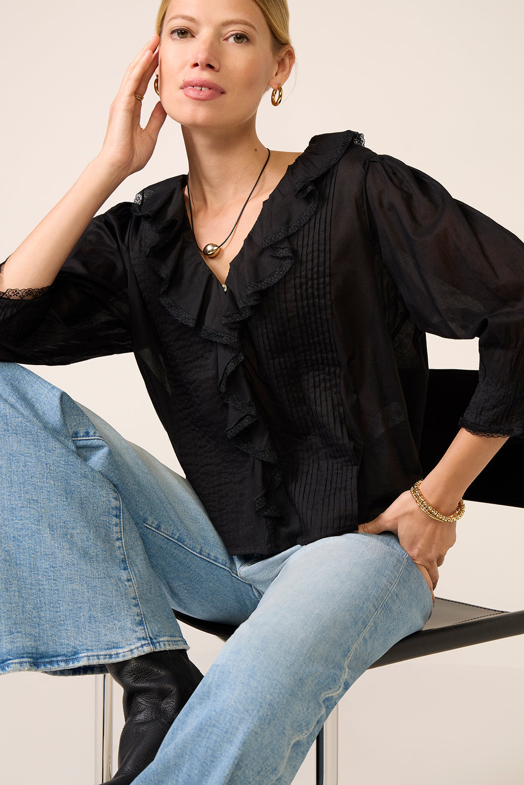 A cascading ruffle and pintuck detailing elevate this stylish blouse by Rails. The Mare Top is crafted from soft. lightweight beach cotton and features a relaxed fit. three-quarter puff sleeves. and delicate lace trim at the neckline and cuffs.