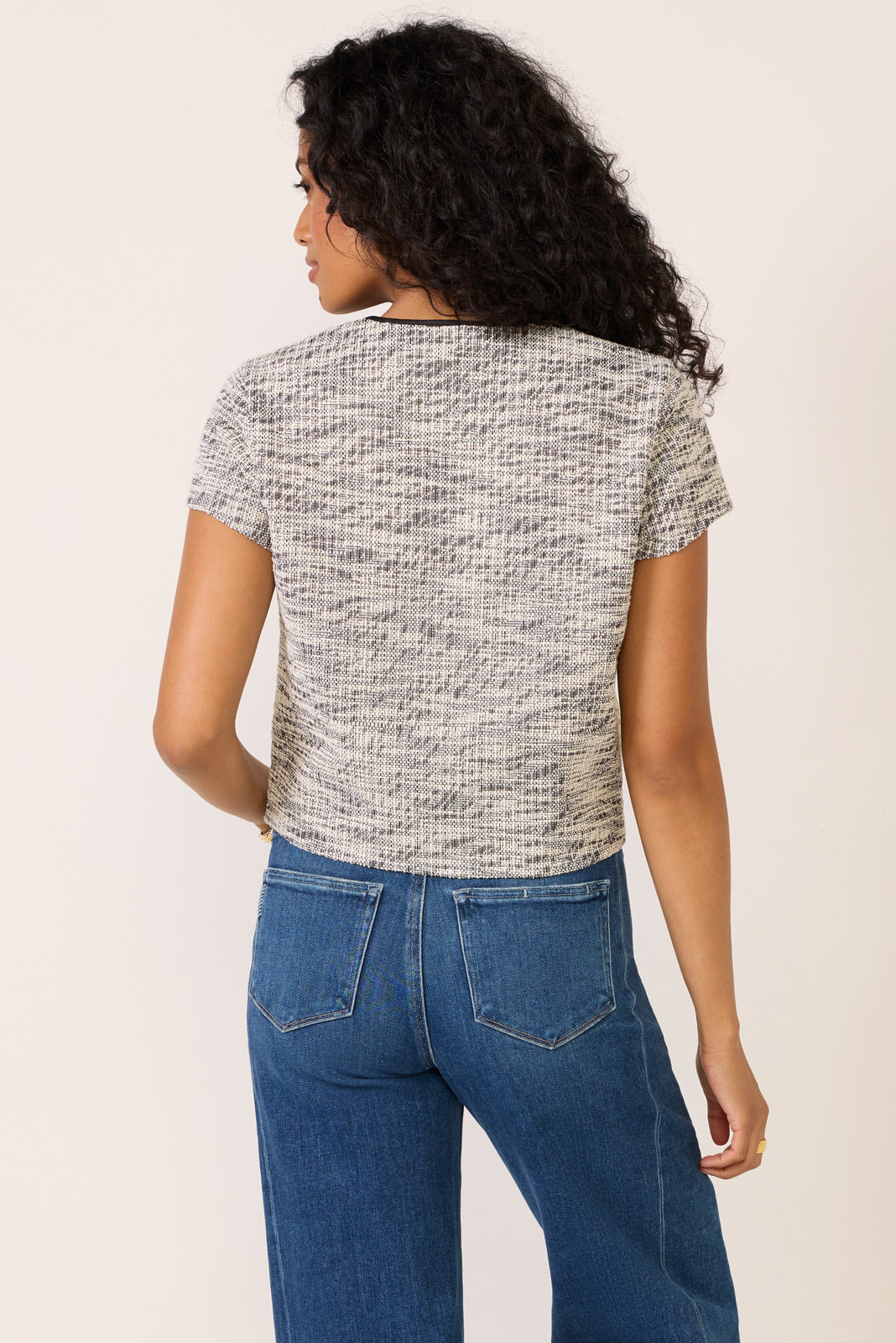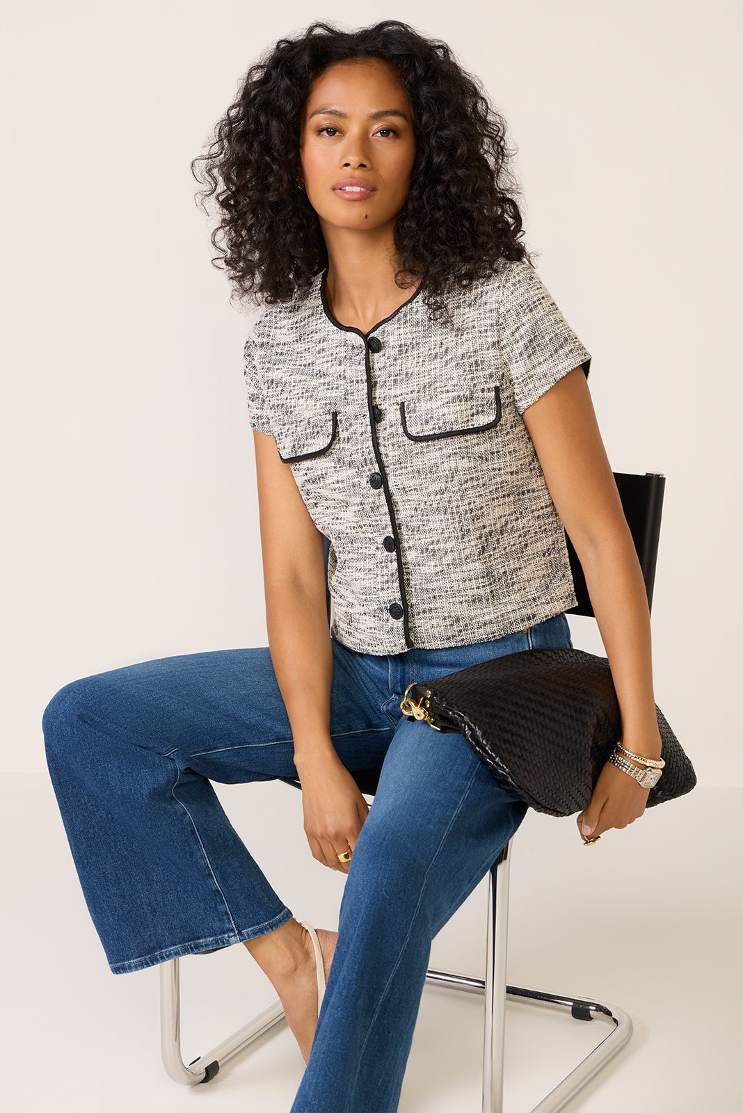 Give any look a polished touch with this chic tweed jacket by EVEREVE. featuring a cropped silhouette with front button closures. short sleeves. and contrast trim.